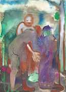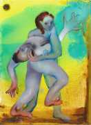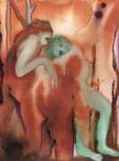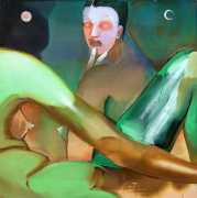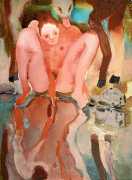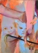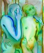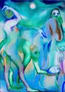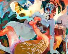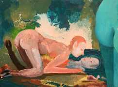 Glaessner uses water-dispersed pigment and inks in her absorbing, vibrant scenes and portraits. Her paintings, shifting between reality and dreamlike settings, explore humans in all their imperfect forms, including elements from nature, mythology, and her own personal experiences. She works with different painting processes and techniques to build on a personal narrative drawing on memory, ritual, contemporary culture, art history, cultural myths and folklore, constantly moving between figuration and abstraction but always using colour as the language.