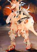 New York’s PPOW Gallery, which represents her work, describes it like this: ‘Glaessner’s brightly hued paintings teem with life, drawing on personal history, memory and ritual, both real and imagined. They depict a utopian, surreal universe, featuring theatrical and celebratory figures that blur the line between myth and reality. She has had a long-time fascination with the way ancient societies immortalised their leaders through the repetition of stories passed down orally and visually through depictions on murals and objects, often resulting in exaggerated and performative figures.’ Elizabeth Glaessner’s work is a quintessential mix of beauty and fear. It is easy to get drawn into her works with their striking colours and compositions, but what keeps the attention are the dark motifs that appear on the surface. Patterns and figures that at once seem familiar take on an eerie, other-worldly feel.