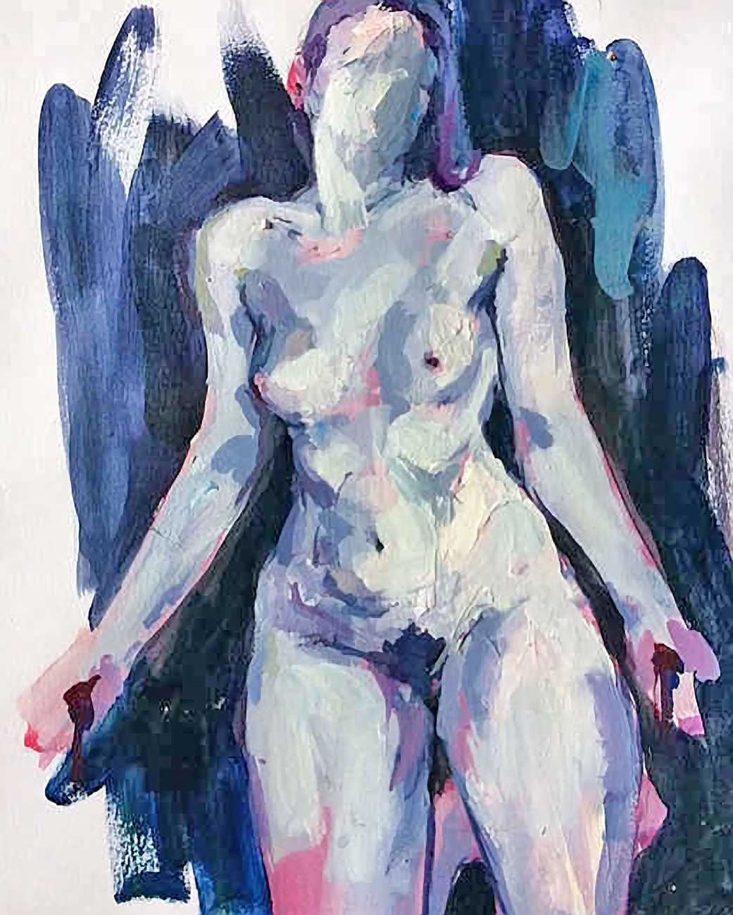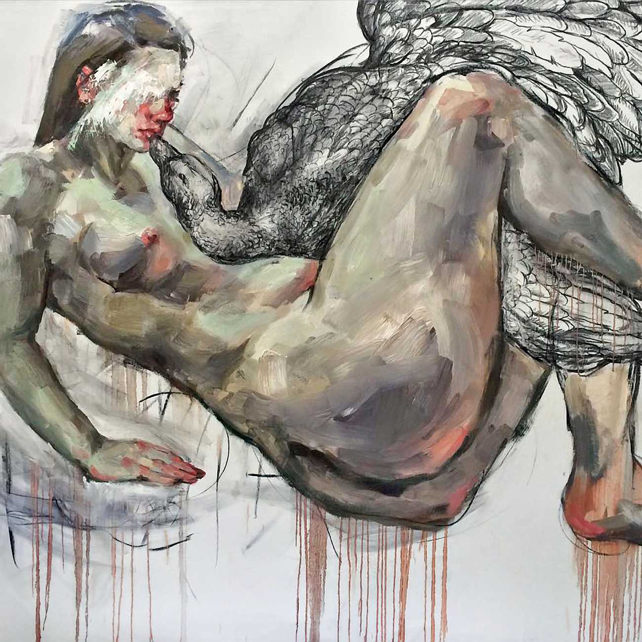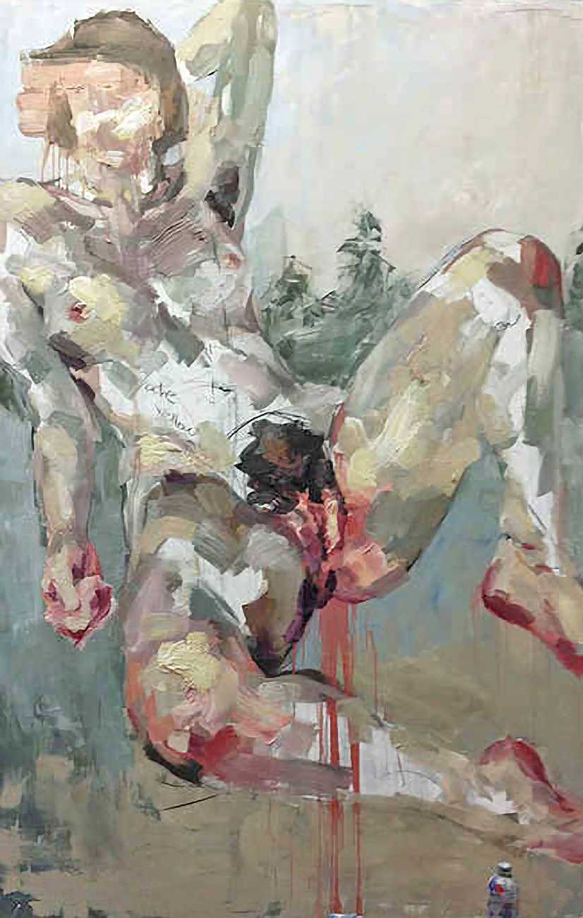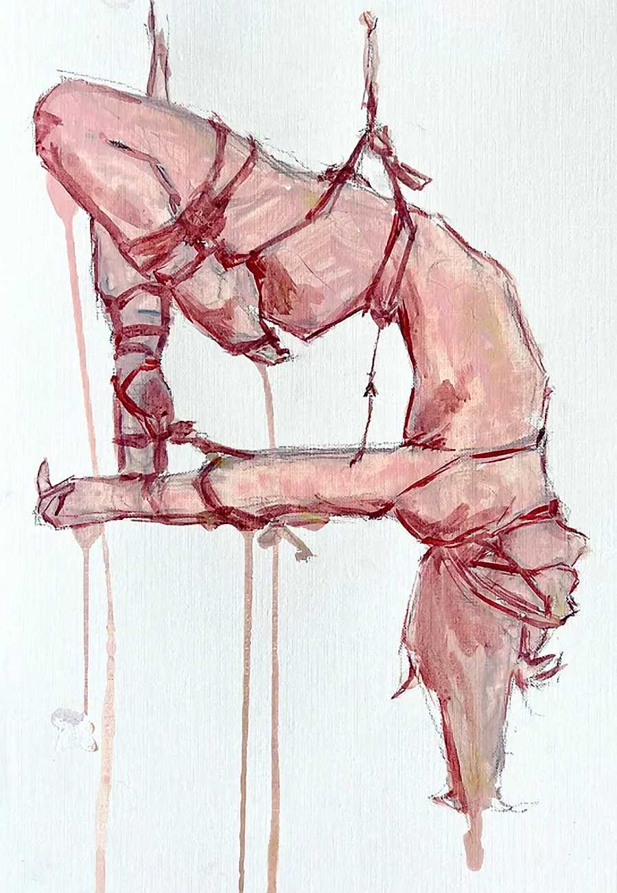 The Canadian artist Elly Smallwood grew up in Ottawa, and has been painting ever since she can remember. She studied art at the Ontario College of Art and Design, and now lives and works in Toronto. She primarily works with oils, creating large-scale paintings which capture the vitality and movement of the human body. Some of the figures have no face, while the rest of their bodies appear slashed through with deep wounds.