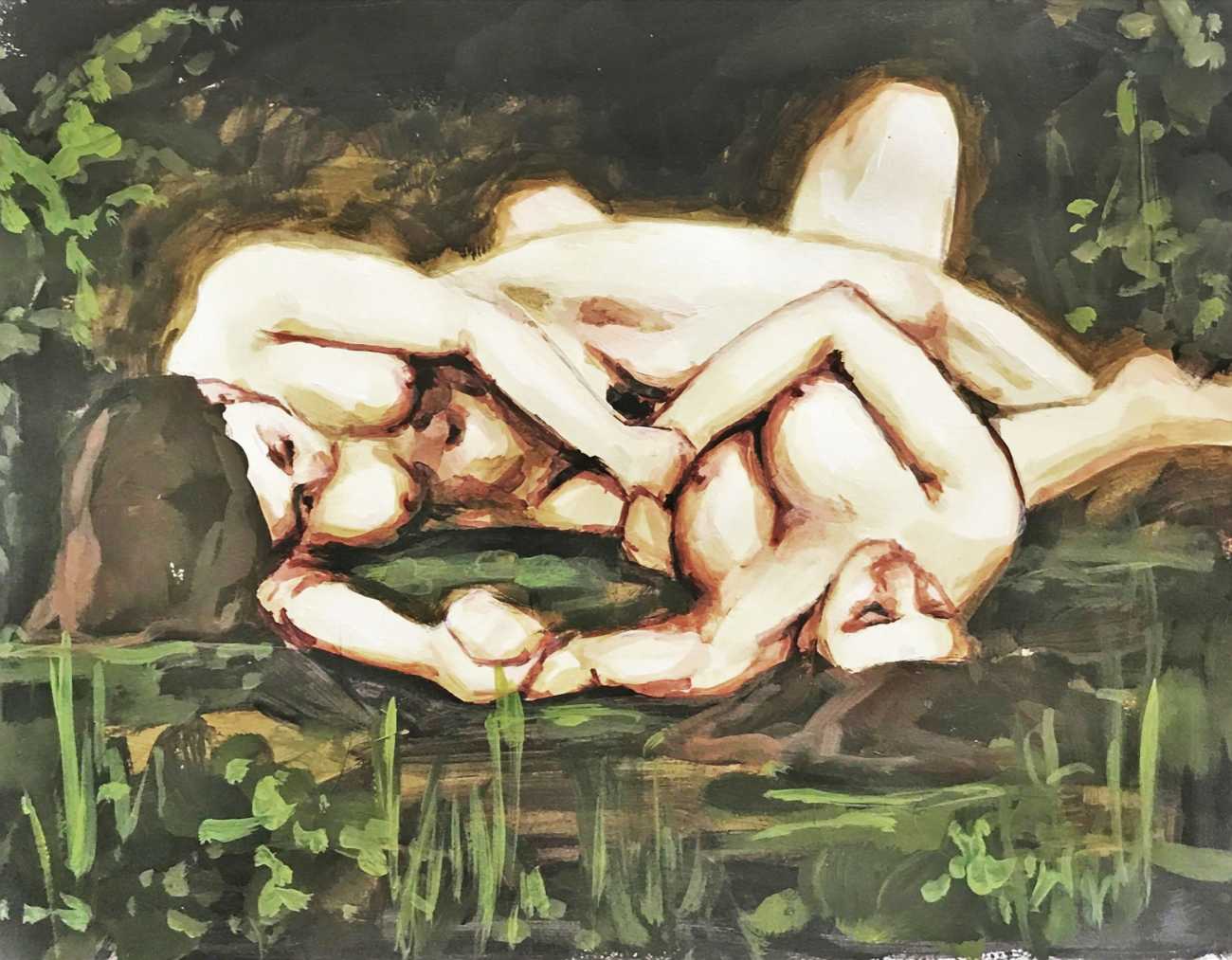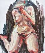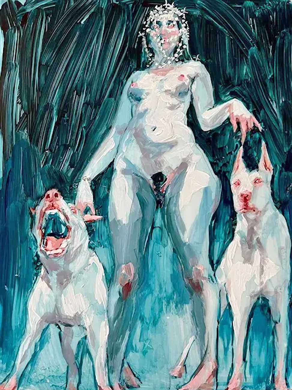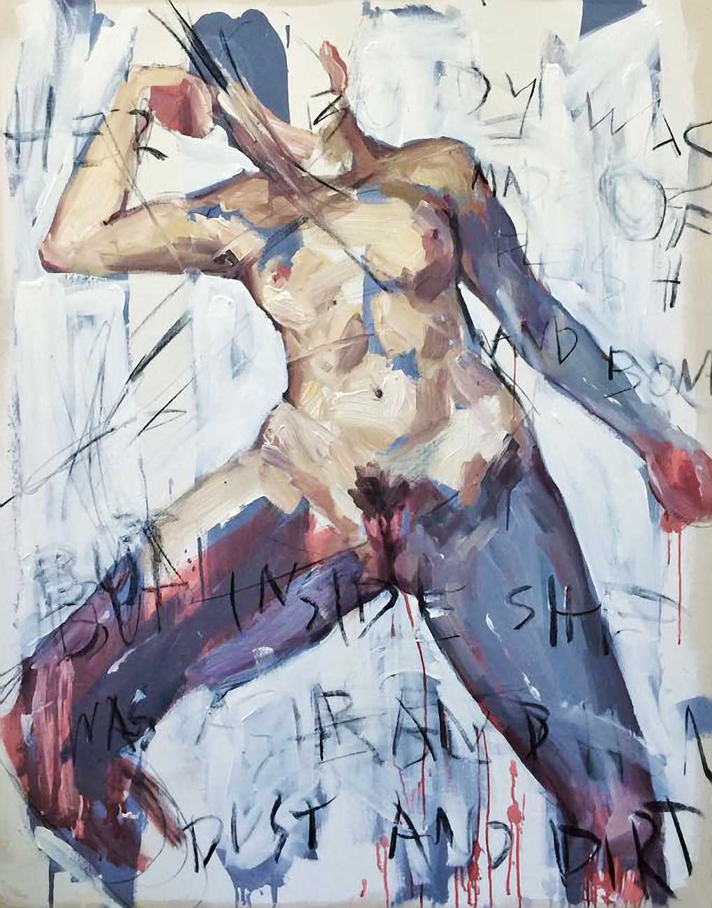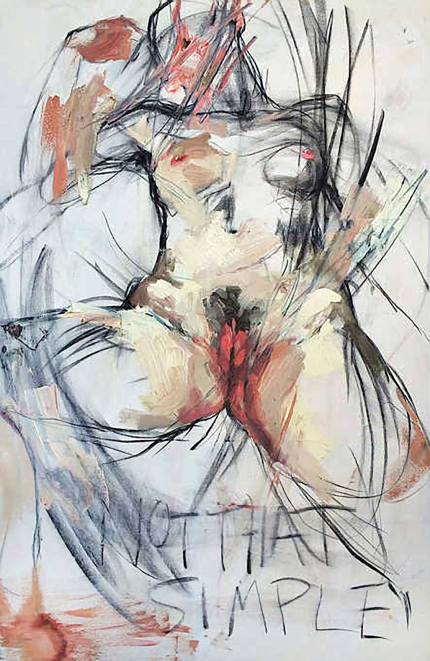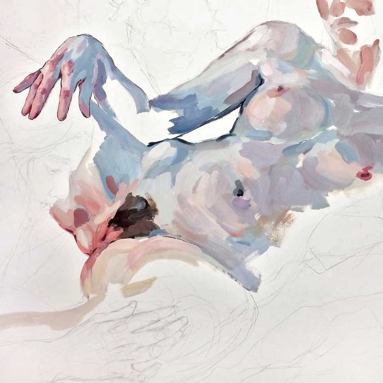 The Canadian artist Elly Smallwood grew up in Ottawa, and has been painting ever since she can remember. She studied art at the Ontario College of Art and Design, and now lives and works in Toronto. She primarily works with oils, creating large-scale paintings which capture the vitality and movement of the human body. Some of the figures have no face, while the rest of their bodies appear slashed through with deep wounds.