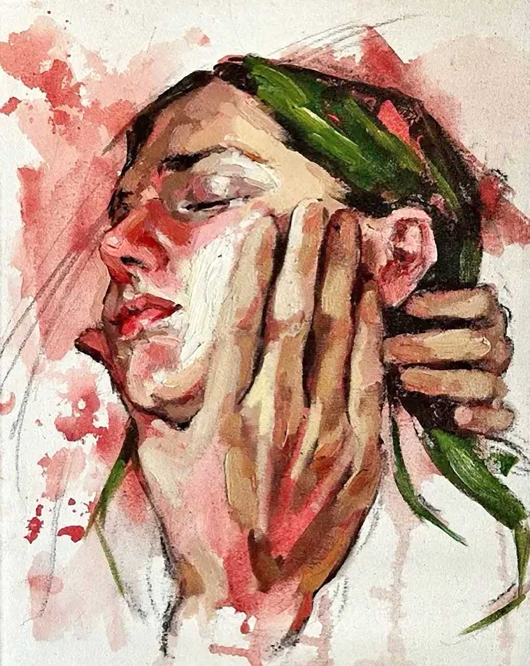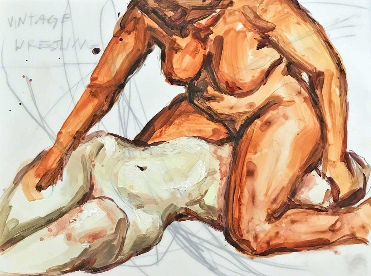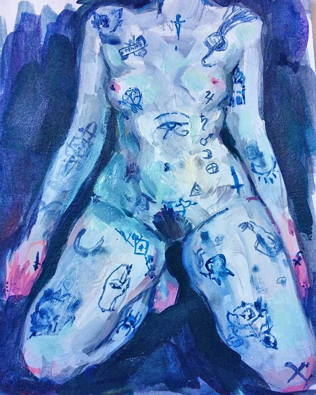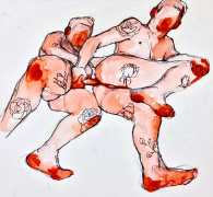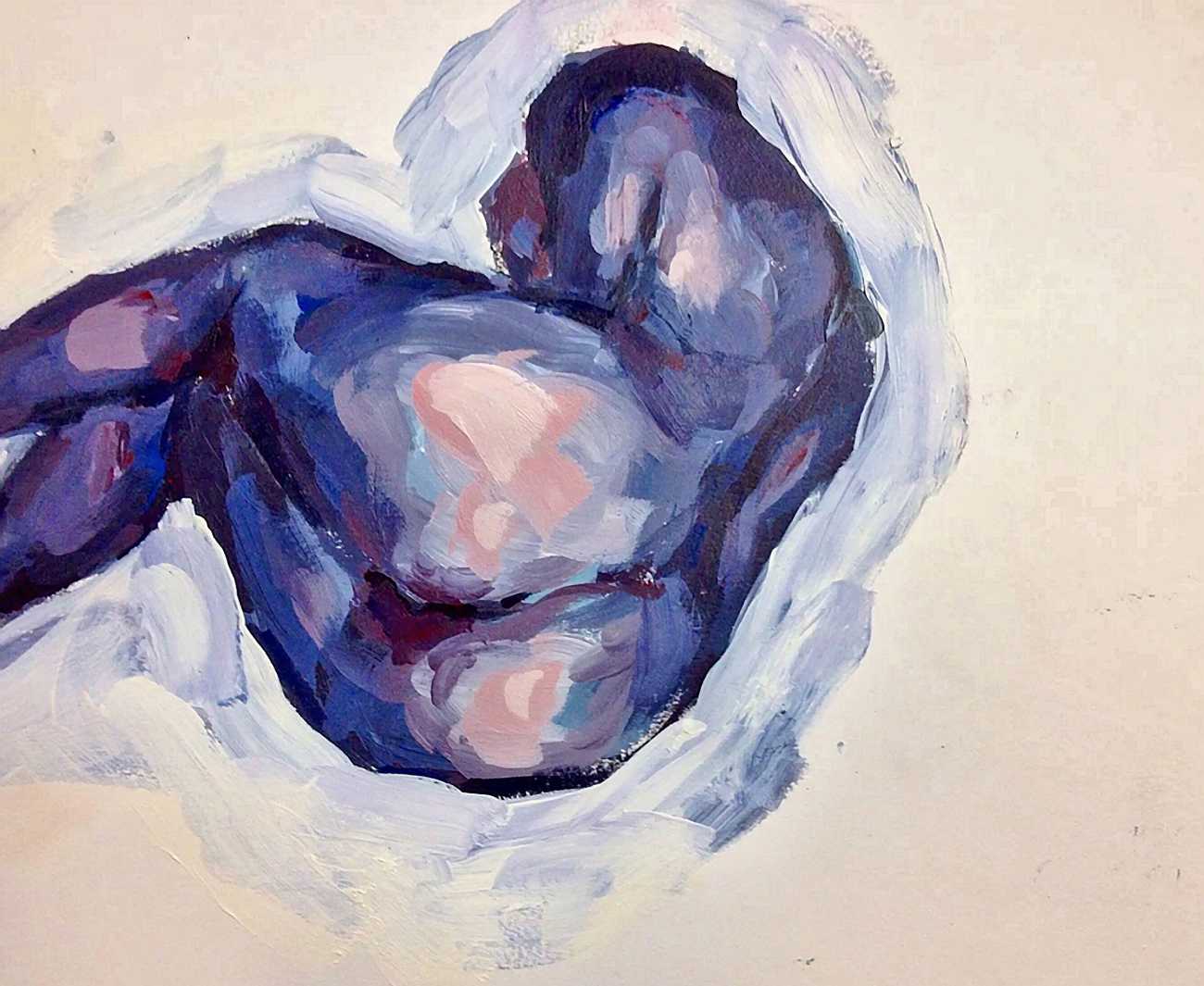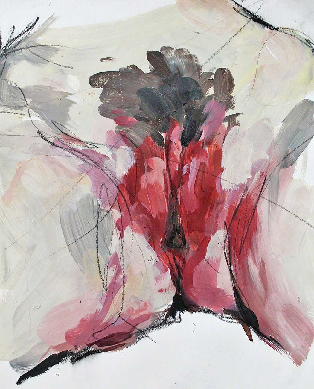 The Canadian artist Elly Smallwood grew up in Ottawa, and has been painting ever since she can remember. She studied art at the Ontario College of Art and Design, and now lives and works in Toronto. She primarily works with oils, creating large-scale paintings which capture the vitality and movement of the human body. Some of the figures have no face, while the rest of their bodies appear slashed through with deep wounds.