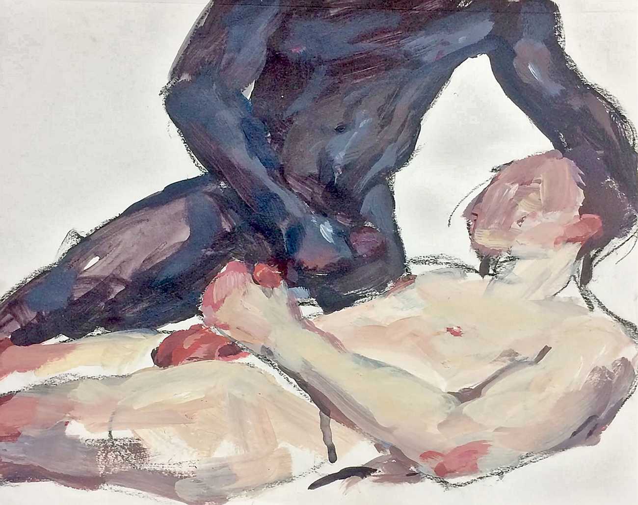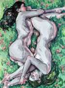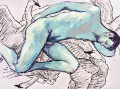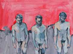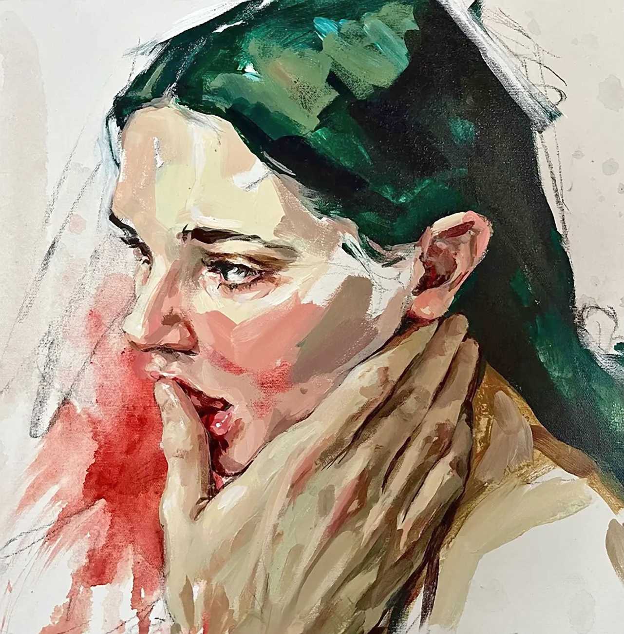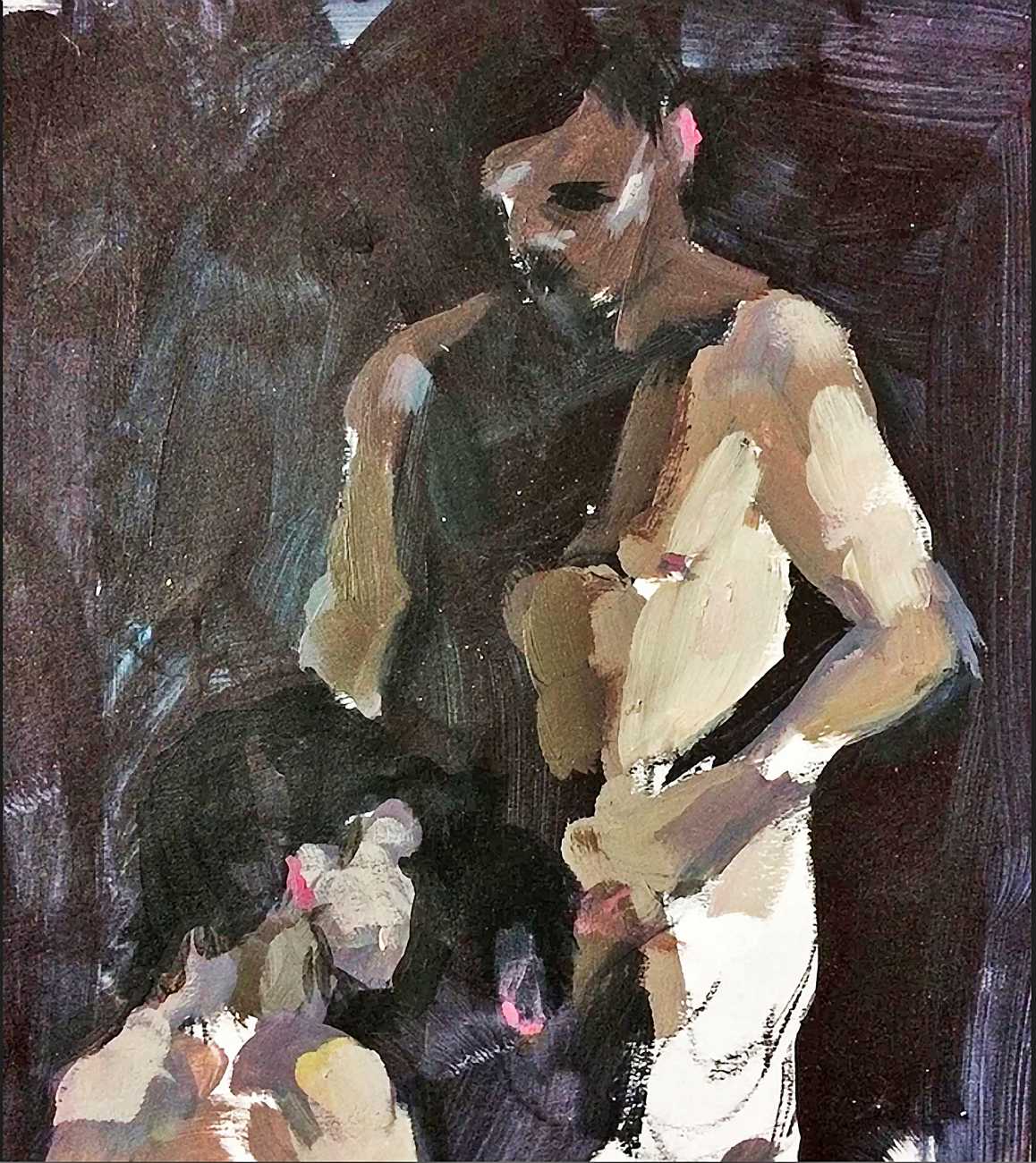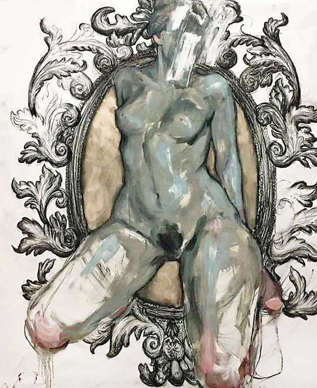 The Canadian artist Elly Smallwood grew up in Ottawa, and has been painting ever since she can remember. She studied art at the Ontario College of Art and Design, and now lives and works in Toronto. She primarily works with oils, creating large-scale paintings which capture the vitality and movement of the human body. Some of the figures have no face, while the rest of their bodies appear slashed through with deep wounds.