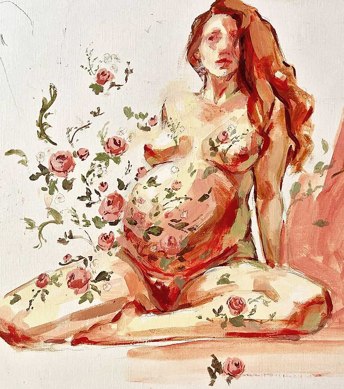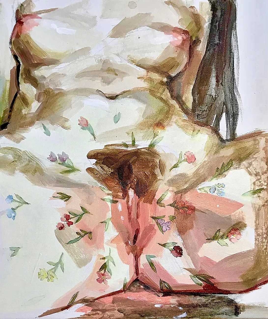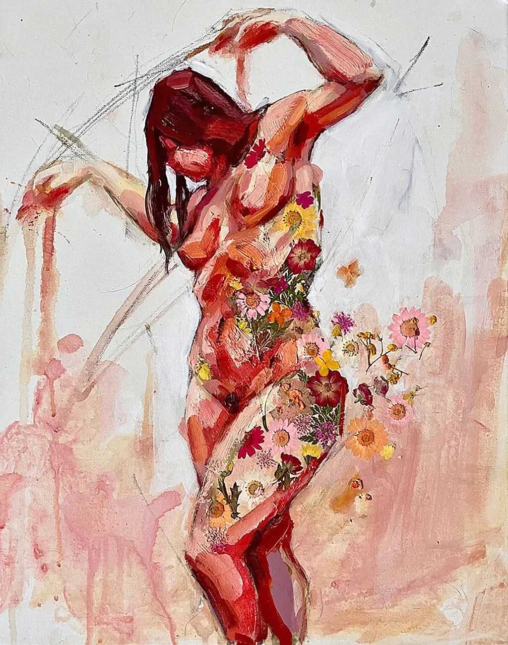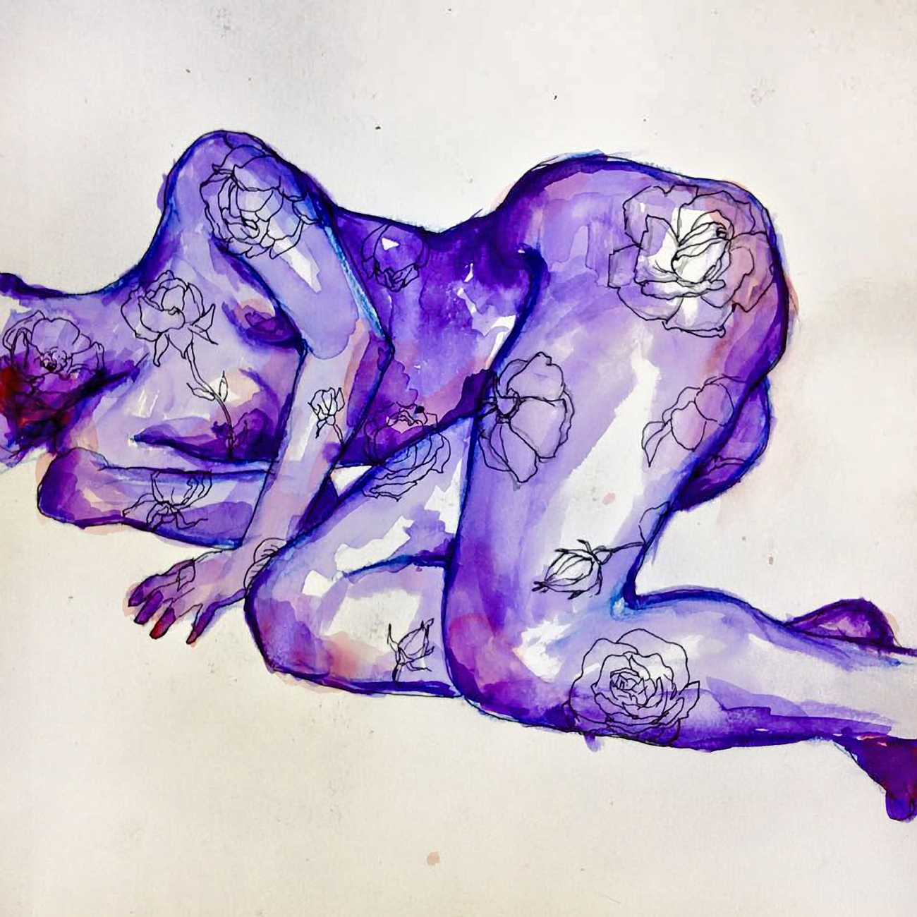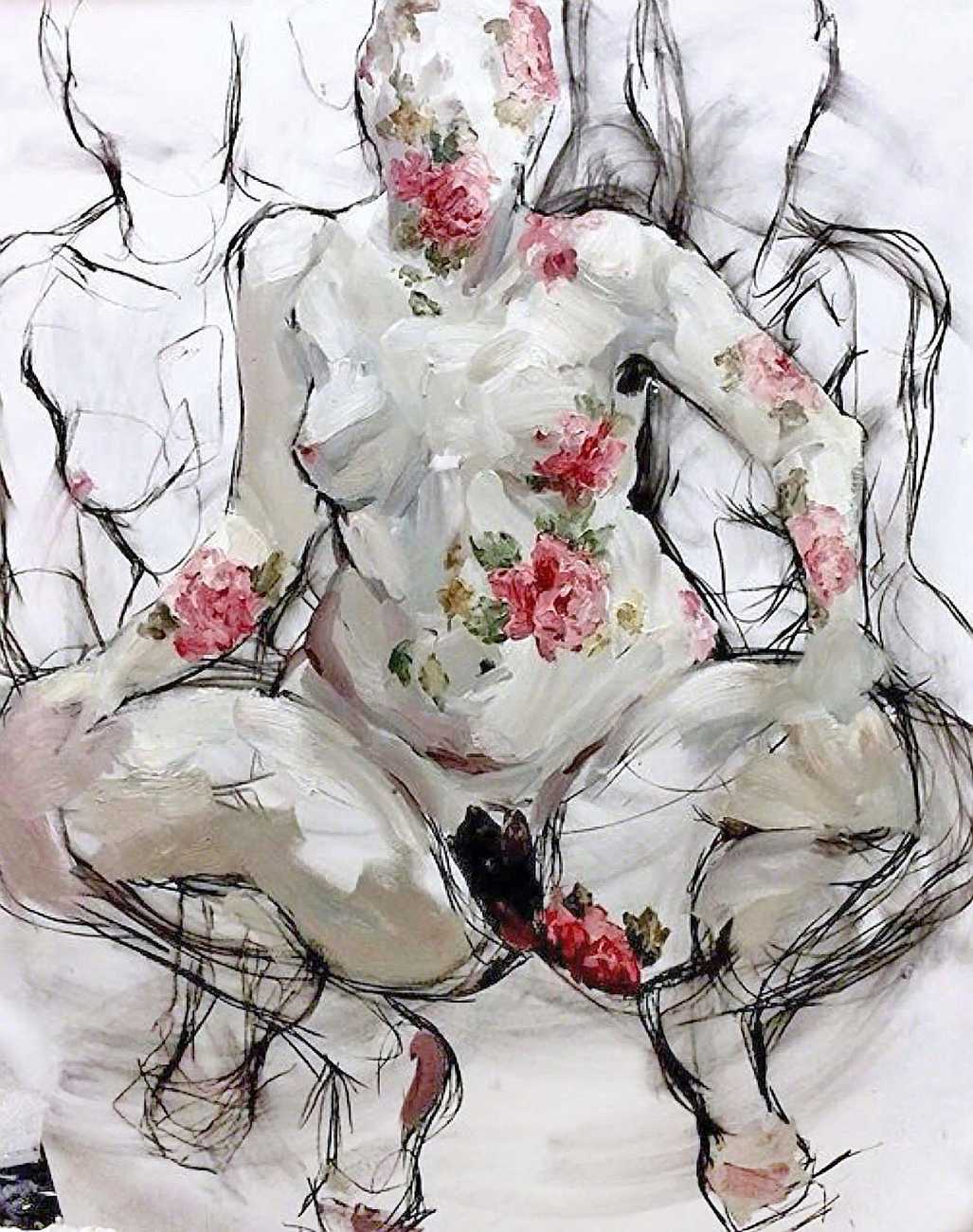 As fellow artist Riddhi Kanetkar has written, ‘I love the way in which Smallwood paints the female body; she uses a variety of body types that deviate from the traditional female body that is often constructed under the male artistic gaze. In particular, Smallwood’s amalgamation of flowers, superimposed onto a figure of the female body, both enhances the delicacy of it, whilst the bold outline attributes it with a degree of agency and power. The brush strokes are big, bold, and encompass the fluidity and ever-changing nature of the body – it is never static. Smallwood uses expressionism as a medium to convey her ideas; her work therefore reflects her own perceptions of femininity and female sexuality. This underpins the very notion of feminism – the fact that there is no one set of images that represent women’s experience, but rather it is an expression of all our individual thoughts and experiences. Her work demonstrates how art can be a powerful tool to express our identity.’