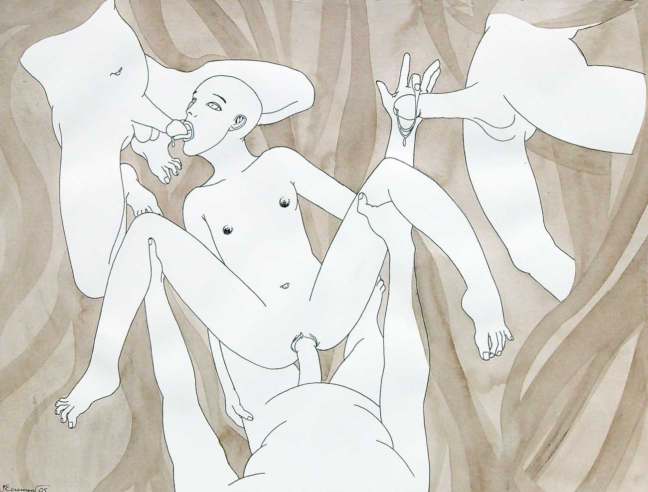 In 2018 blogger Elisabeth Brennan wrote of Ecrement’s drawings, ‘His work is almost obsessive, its common thread is a woman, probably his woman, the origin of his fantasies. His muse is represented in dreamlike, surreal scenes populated sometimes by men, but also by gnomes, satyrs, grotesque characters from the depths of the collective imagination. Though the muse may at first sight look as though she is being abused, it is most often she who leads the way.’