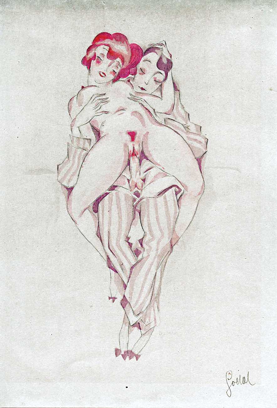 Erich Godal was also involved in the film industry; he worked with director Max Reinhardt on the set design for films including Zwei schwarze Laternen (Two Black Lanterns) in 1921 and Adolf Abter’s Elixiere des Teufels (Elixirs of the Devil) in 1922. In 1927 he created illustrations for Eugen Szatmari’s Berlin volume of Was nicht im Baedeker steht (What is not in Baedeker). Godal was good friends with the composer Werner Richard Heymann and the writer Walter Mehring. It was during the early 1920s that he was regularly drawing and painting erotic art, a reflection of his active social life enjoying the freedom of Weimar Berlin.