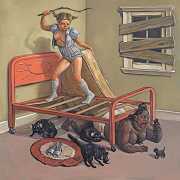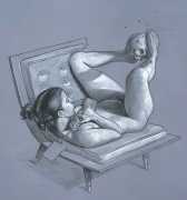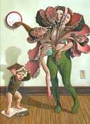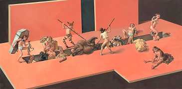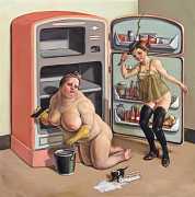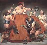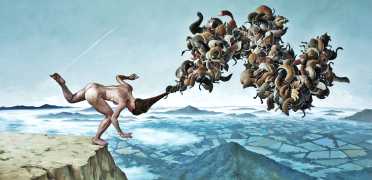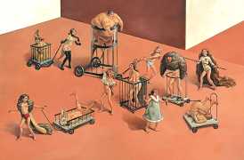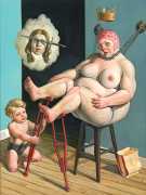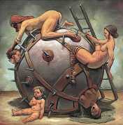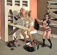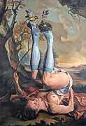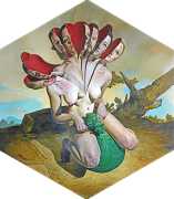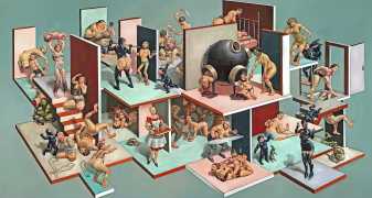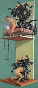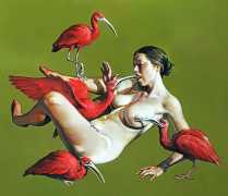 Erik Thor Sandberg creates dark dreamscapes where the protagonists live engulfed in the chaos of a decadent dance of interactions which verge on lucid madness. His painting creates magic illusions in an uncanny connection between oil paints and human flesh. The bodies portrayed are simultaneously beautiful and grotesque, and their impending actions within the narrative constitute visceral allegories which present a psychological portrait of us as a species, with all our failings, vices and virtues, confusion and hope, paranoia and striving for freedom. The themes vary, but the fundamental goal is to show different facets of humanity in an unflinching contrast between what is beautiful and good and what is bad or ugly.