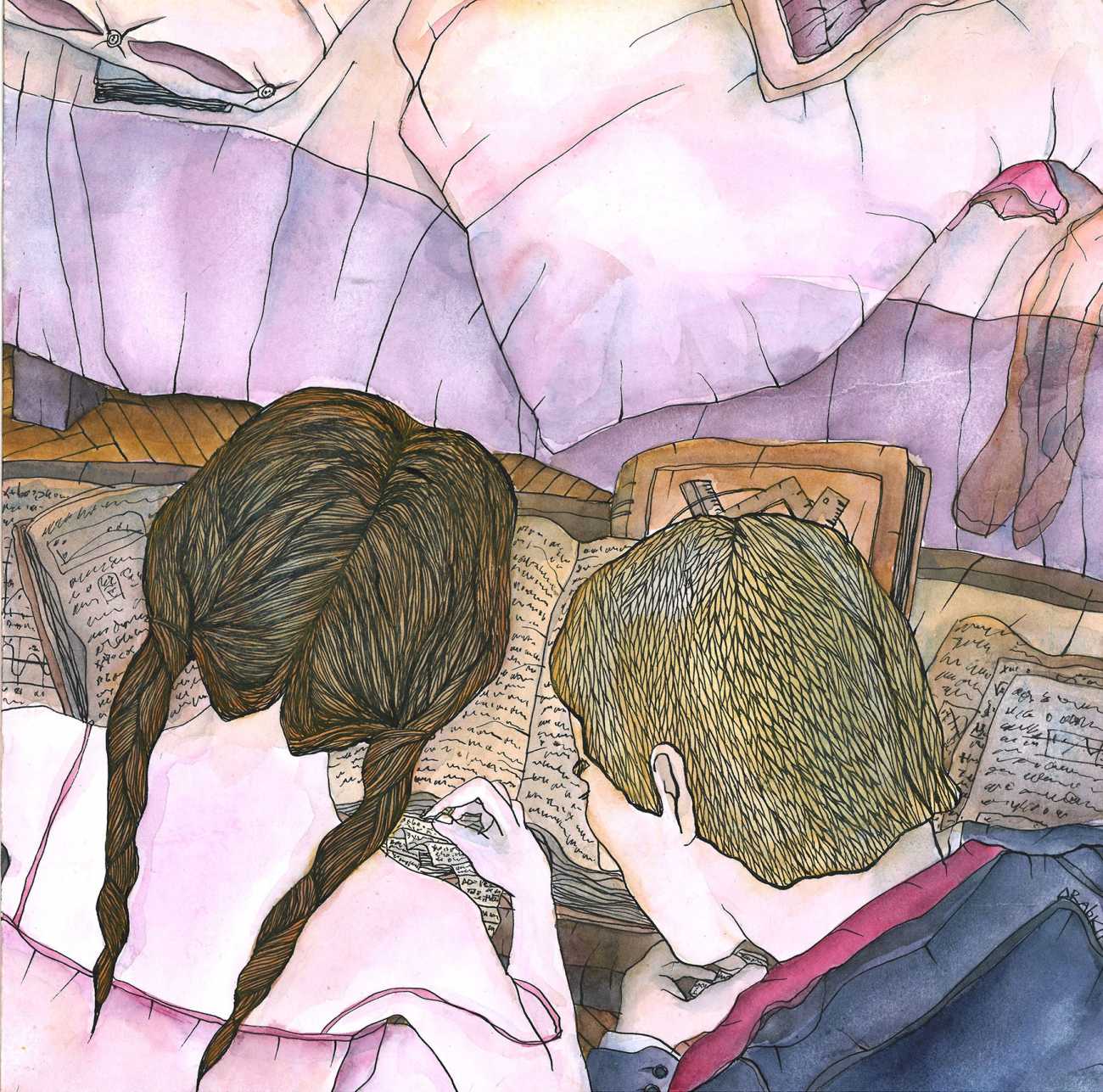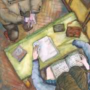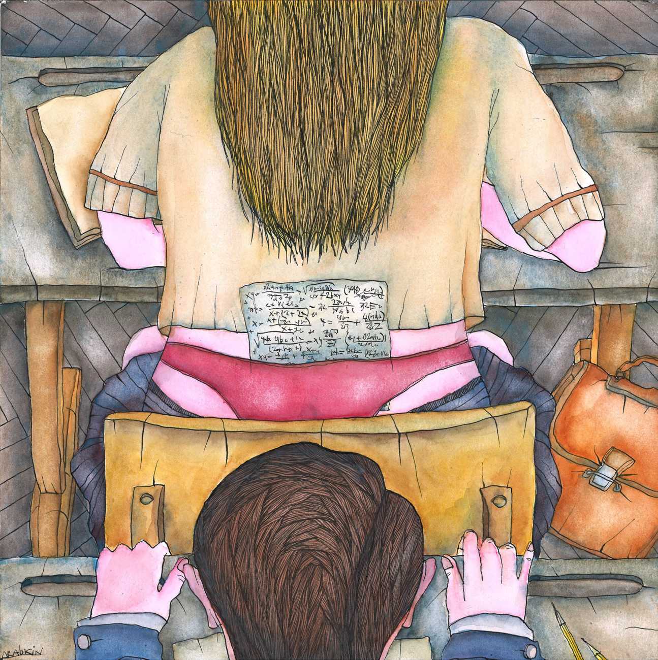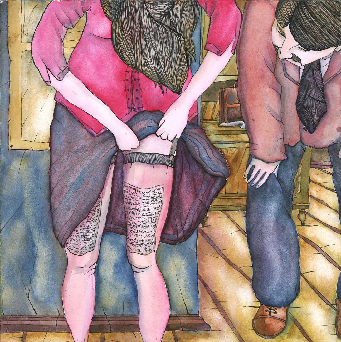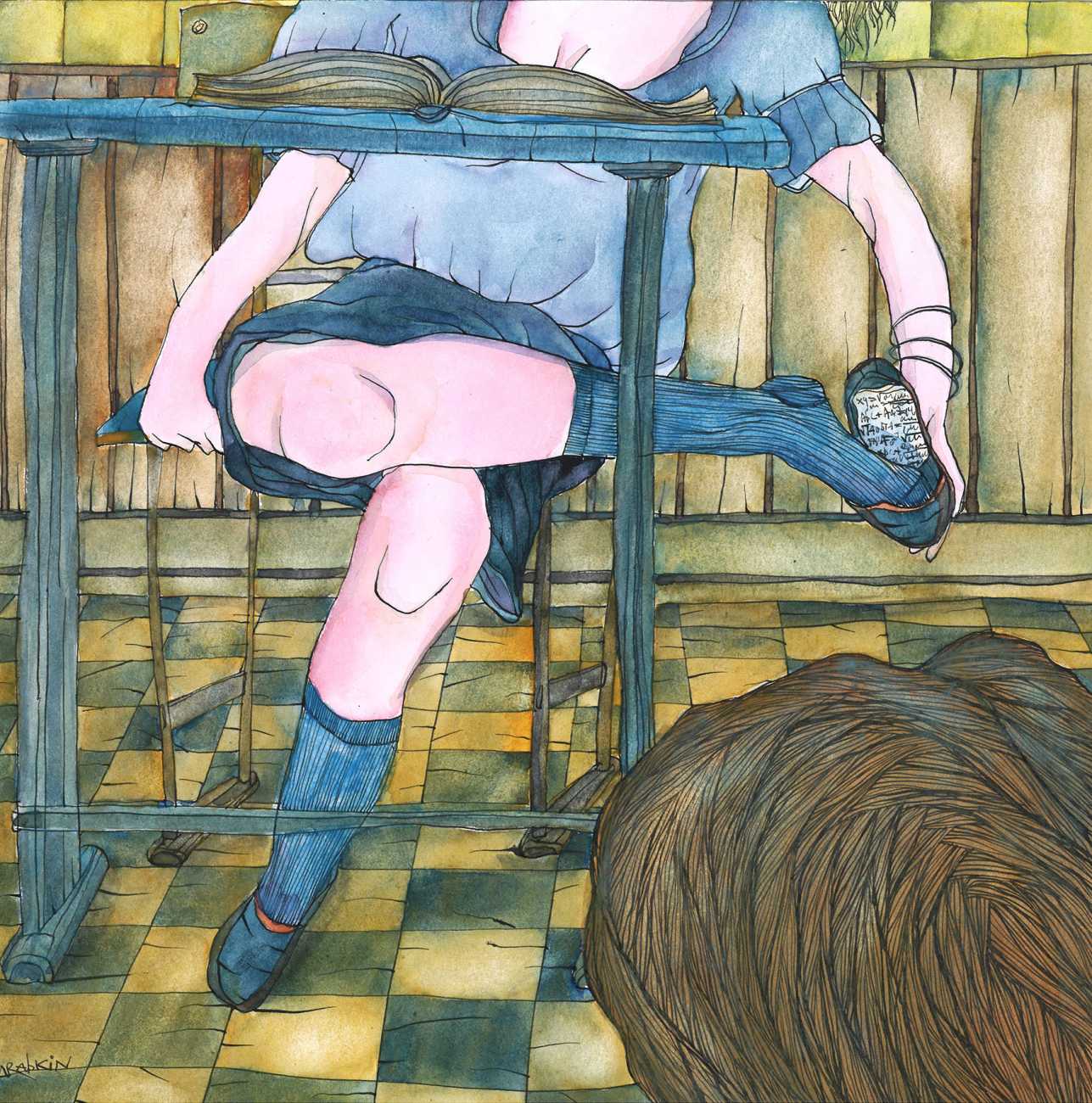 Eugene writes of his art, ‘I create whimsical erotic drawings that sometimes manage to be both philosophical and filthy in equal measure. The drawings are somewhat reminiscent of children’s colouring books, as well as retro erotic photos, favouring ink graphics and watercolour paints. The figures and characters of Poems about Sluts and Sluts Strike Back are depicted in erotic encounters in various ways, settings and situations. Cheats and Cribs features imaginative ways of students cheating in classes and exams, sometimes using quite suggestive methods.’