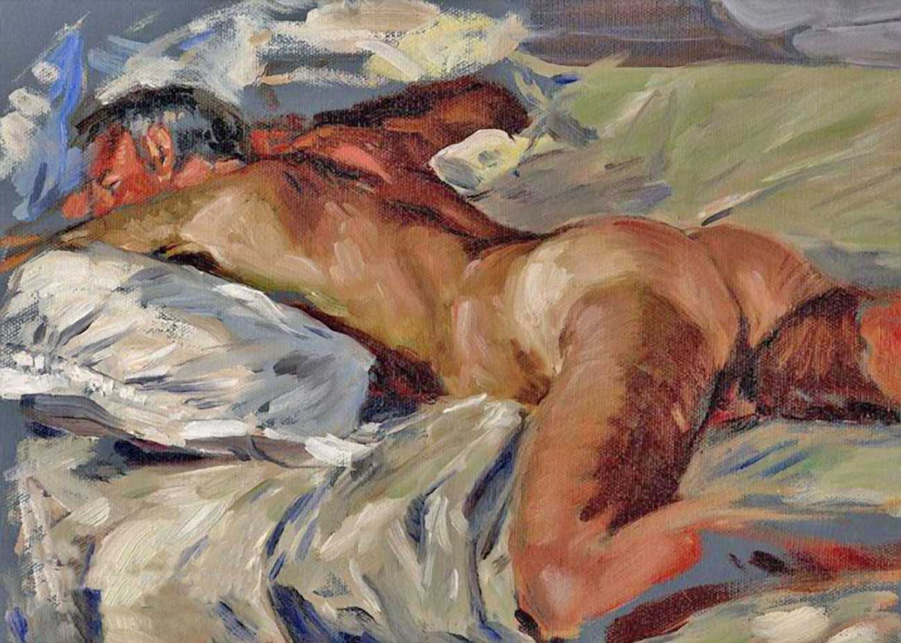 My work is almost like unsubverting queerness. Many of my paintings have a style of a vintage children’s book illustration. There’s a wholesome feeling when you’re looking at it – whether I’m painting an old queer couple kissing in a vintage setting or a super-erotic kinky sex scene. In either case, there is a sense of wholesomeness. My work is also body-positive and sex-positive. Whereas some queer work depicts homosexuality as somehow shameful, my work strips sex and queer bodies of that historical shame.