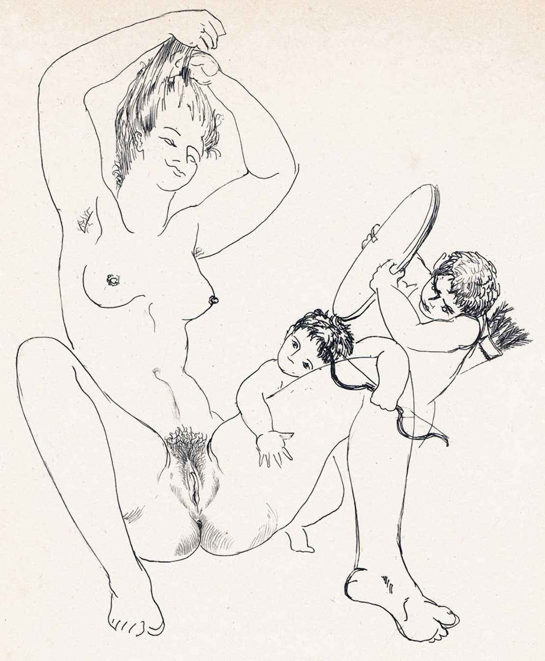 Hertenberger was in his late sixties, still single, when he was commissioned by a group of friends to illustrate by far his most explicitly sexual portfolio, Le trophée des vulves légendaires (The Prize for Legendary Vulvas), its simple style quite different from the detailed etchings he was known for. We know nothing of his personal life at the time, but he certainly knew how to draw female genitalia. His last major book commissions were in 1949 for editions of the Eumenides of Aeschylus and La Fontaine’s Fables.