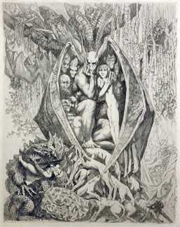 After a relatively unproductive period during the 1930s, when he was teaching drawing and organising regular exhibitions with fellow artists Robert Pougheon and Jean Despujols in Paris’s artistic 14th arrondissement, Hertenberger returned to book illustration in 1943 with an edition of La tentation de saint Antoine (The Temptation of St Anthony). This was followed by etchings for Pierre de Ronsard’s Le bocage (The Grove) in 1946 and Gustave Flaubert’s Salammbô in 1947.