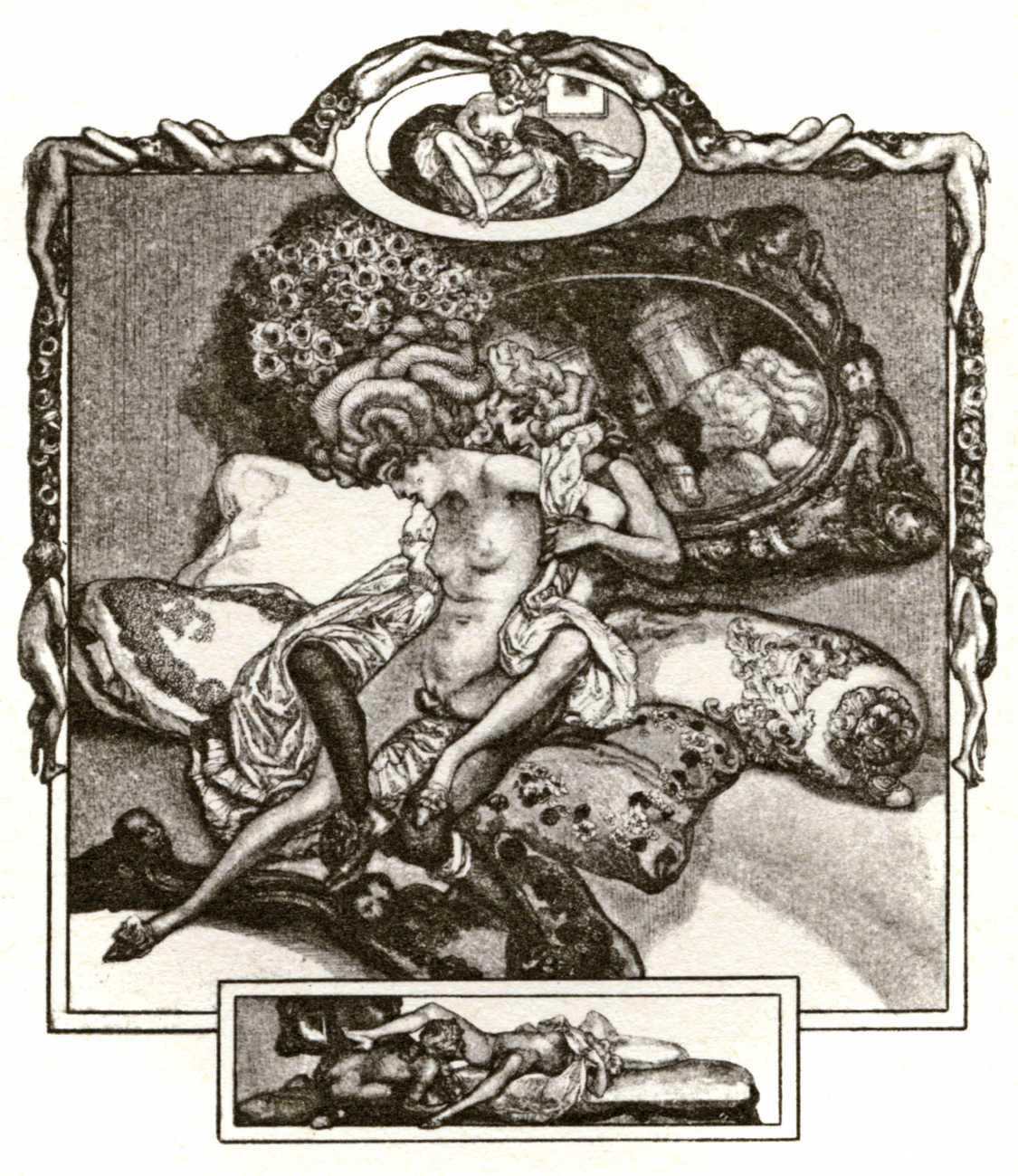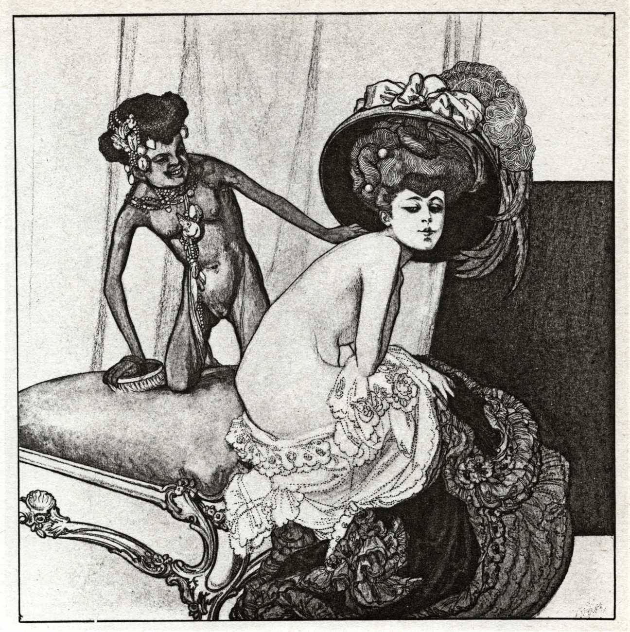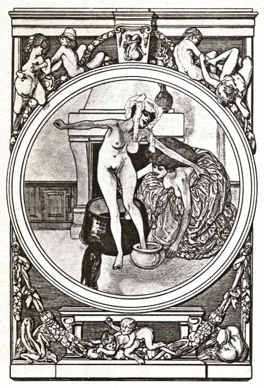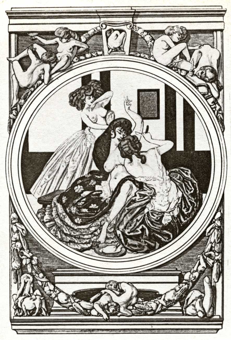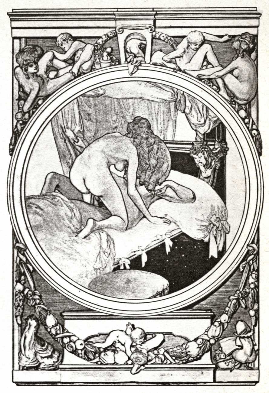 In 1897 Franz turned his back on Vienna and moved to Munich, at that time the art metropolis of the German Reich. The city was one of the main centres of German naturalism; it was also home to important illustrated book publishers including Albert Langen and Georg Müller. He studied at Adolf Hölzel’s academy in Dachau and Heinrich Knirr’s school in Munich, where Paul Klee was also trained. In 1904 Bayros mounted a successful exhibition in Munich, which resulted in several book illustration commissions, including Abbé Prévost’s Manon Lescaut for Insel Verlag and Diderot’s Die geschwätzigen Kleinode (Les bijoux indiscrets) for Georg Müller. But is was his detailed pen and ink drawings on erotic themes, clearly inspired by Aubrey Beardsley and Bayros’s extensive study of French rococo, that brought him the most attention and income. The privately published Fleurettens Purpurschnecke in 1905 was the first of several portfolios produced ‘for the discerning connoisseur’, a style and method of publication which would eventually lead to his Erzählungen am Toilettentische being censored and banned in 1911, and Bayros having to leave Munich for a while.