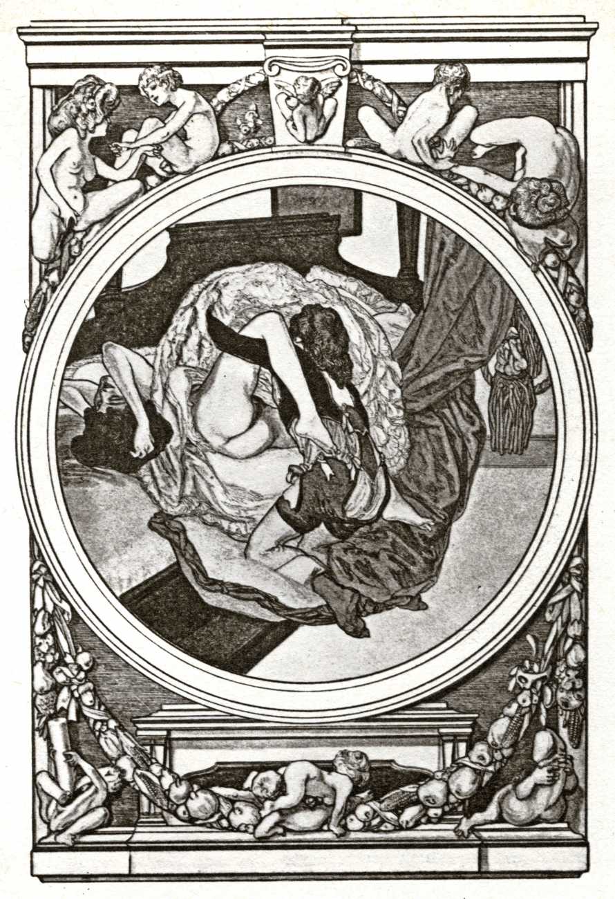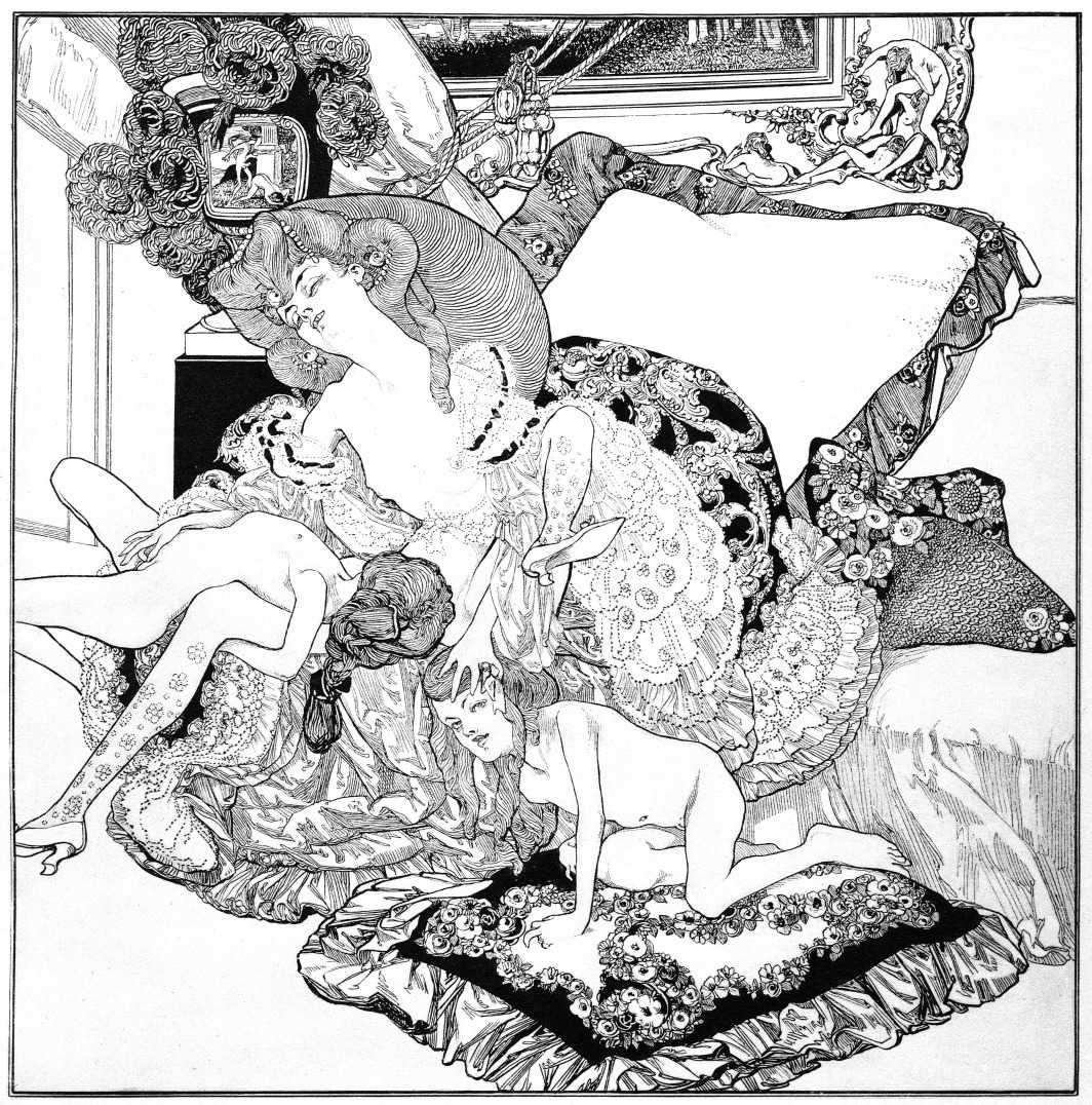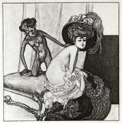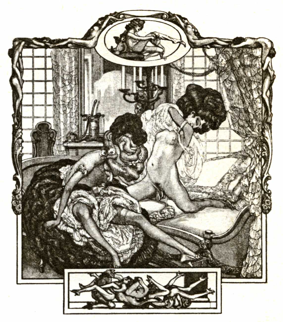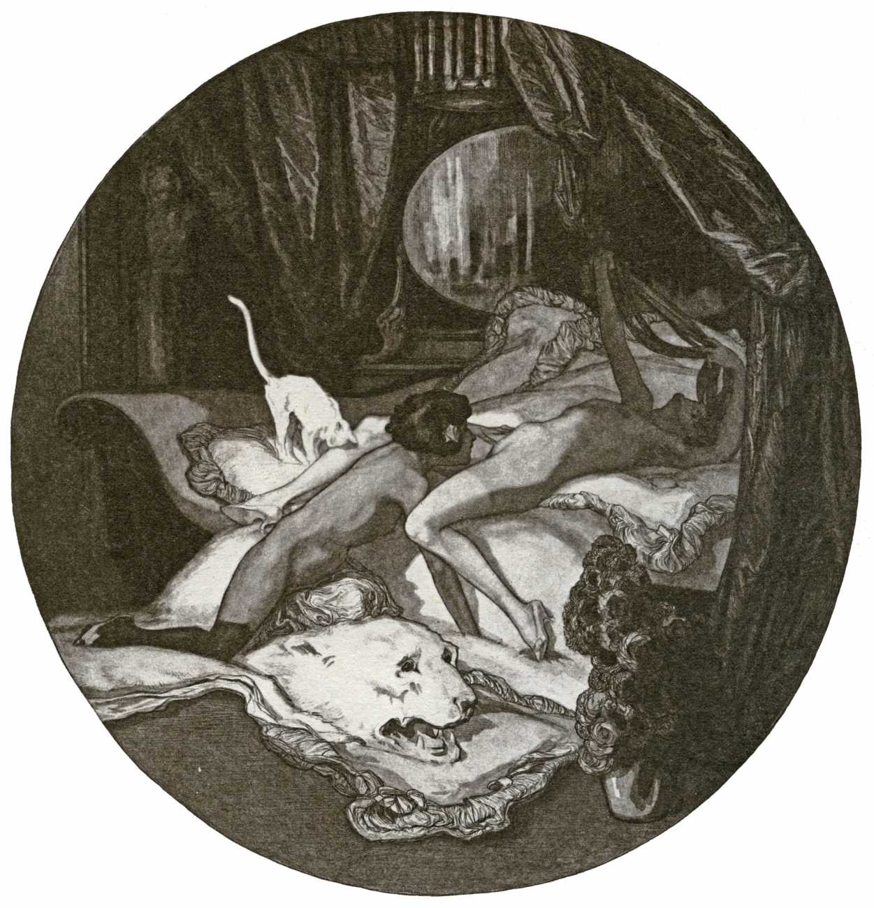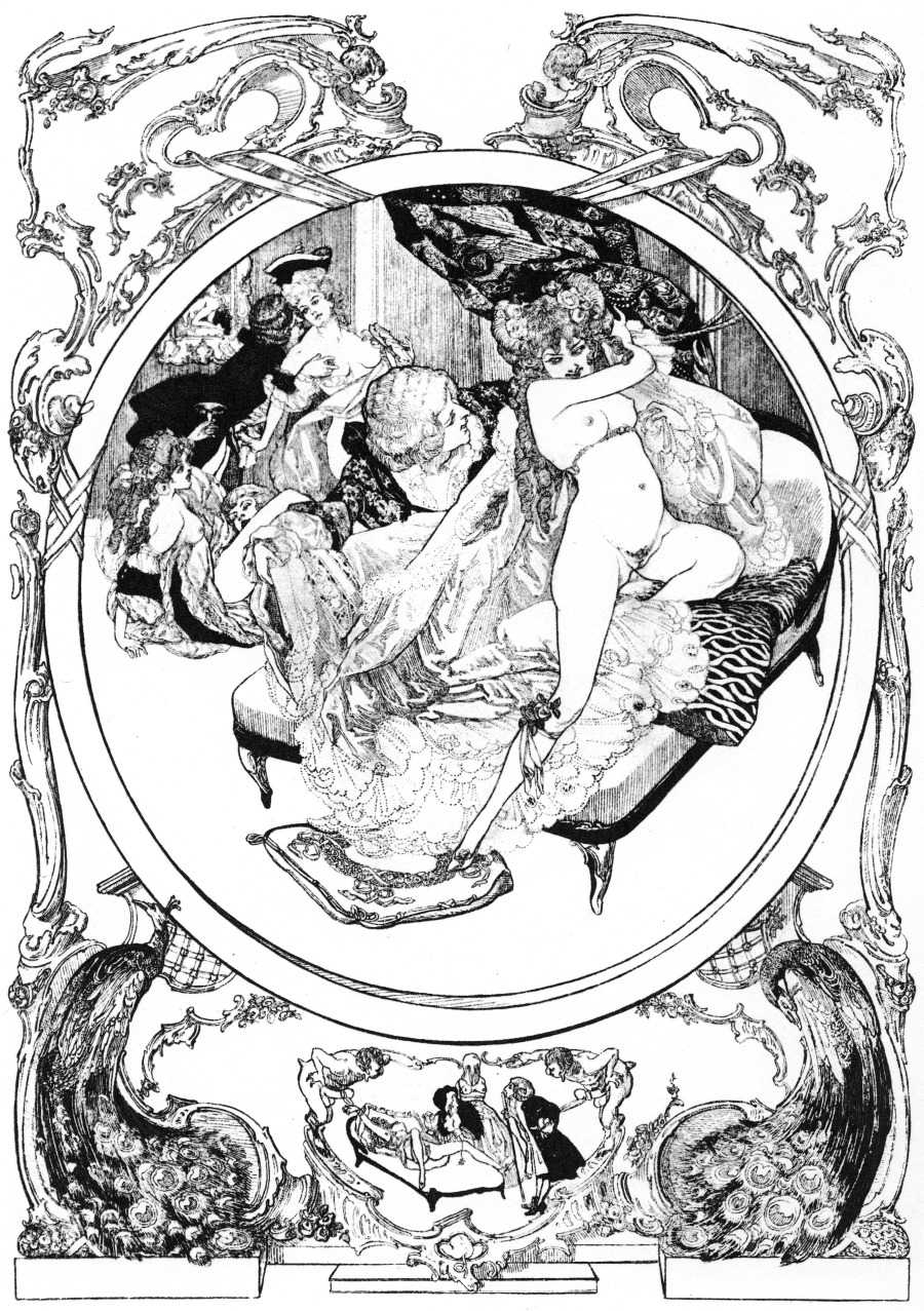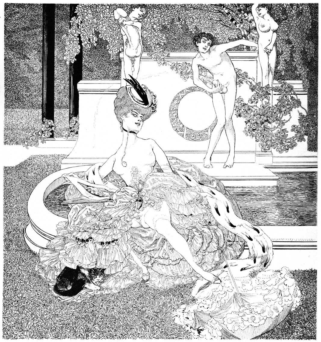 In 1897 Franz turned his back on Vienna and moved to Munich, at that time the art metropolis of the German Reich. The city was one of the main centres of German naturalism; it was also home to important illustrated book publishers including Albert Langen and Georg Müller. He studied at Adolf Hölzel’s academy in Dachau and Heinrich Knirr’s school in Munich, where Paul Klee was also trained. In 1904 Bayros mounted a successful exhibition in Munich, which resulted in several book illustration commissions, including Abbé Prévost’s Manon Lescaut for Insel Verlag and Diderot’s Die geschwätzigen Kleinode (Les bijoux indiscrets) for Georg Müller. But is was his detailed pen and ink drawings on erotic themes, clearly inspired by Aubrey Beardsley and Bayros’s extensive study of French rococo, that brought him the most attention and income. The privately published Fleurettens Purpurschnecke in 1905 was the first of several portfolios produced ‘for the discerning connoisseur’, a style and method of publication which would eventually lead to his Erzählungen am Toilettentische being censored and banned in 1911, and Bayros having to leave Munich for a while.