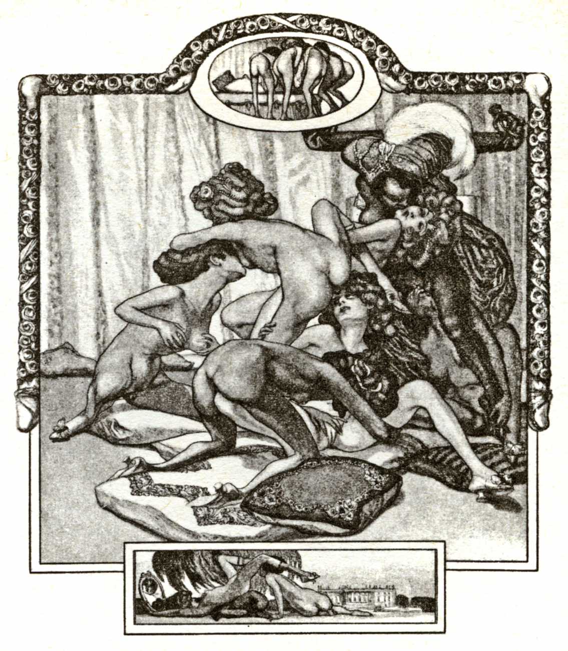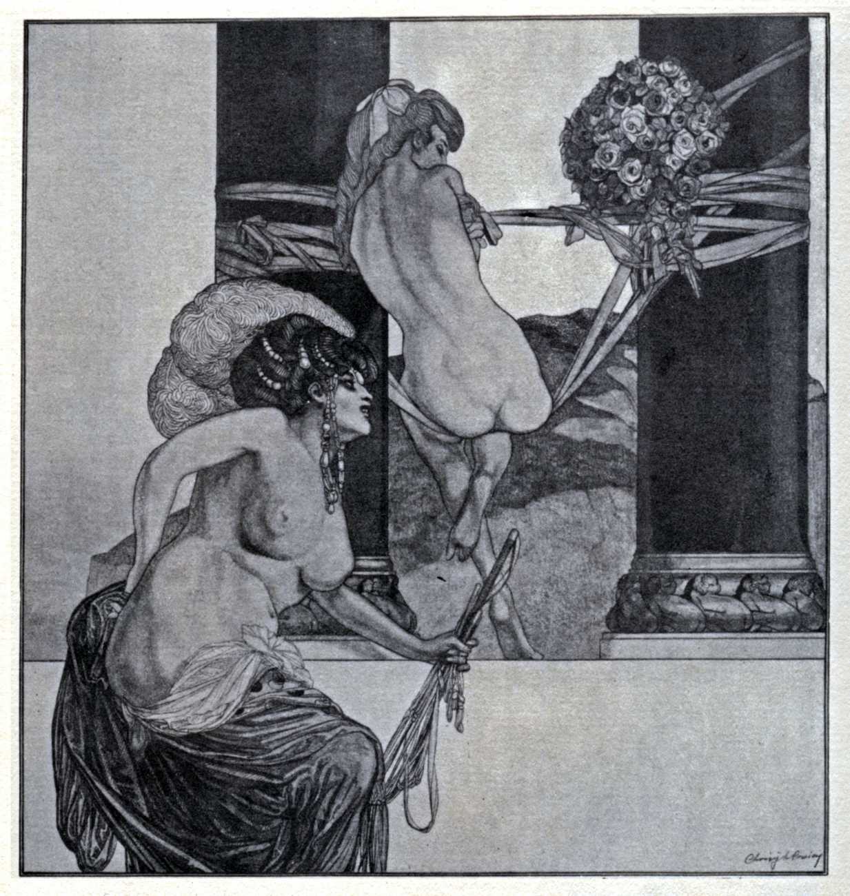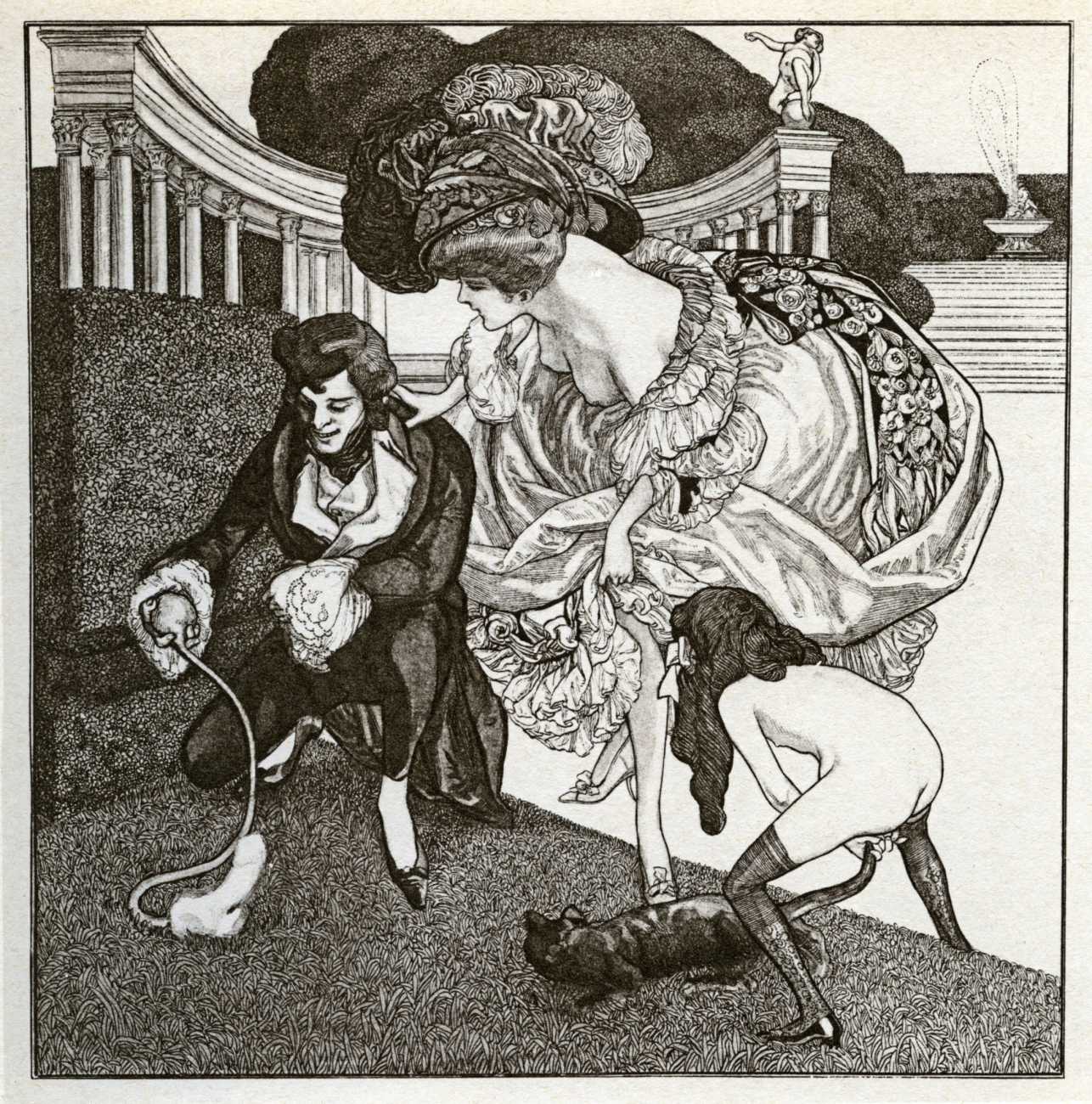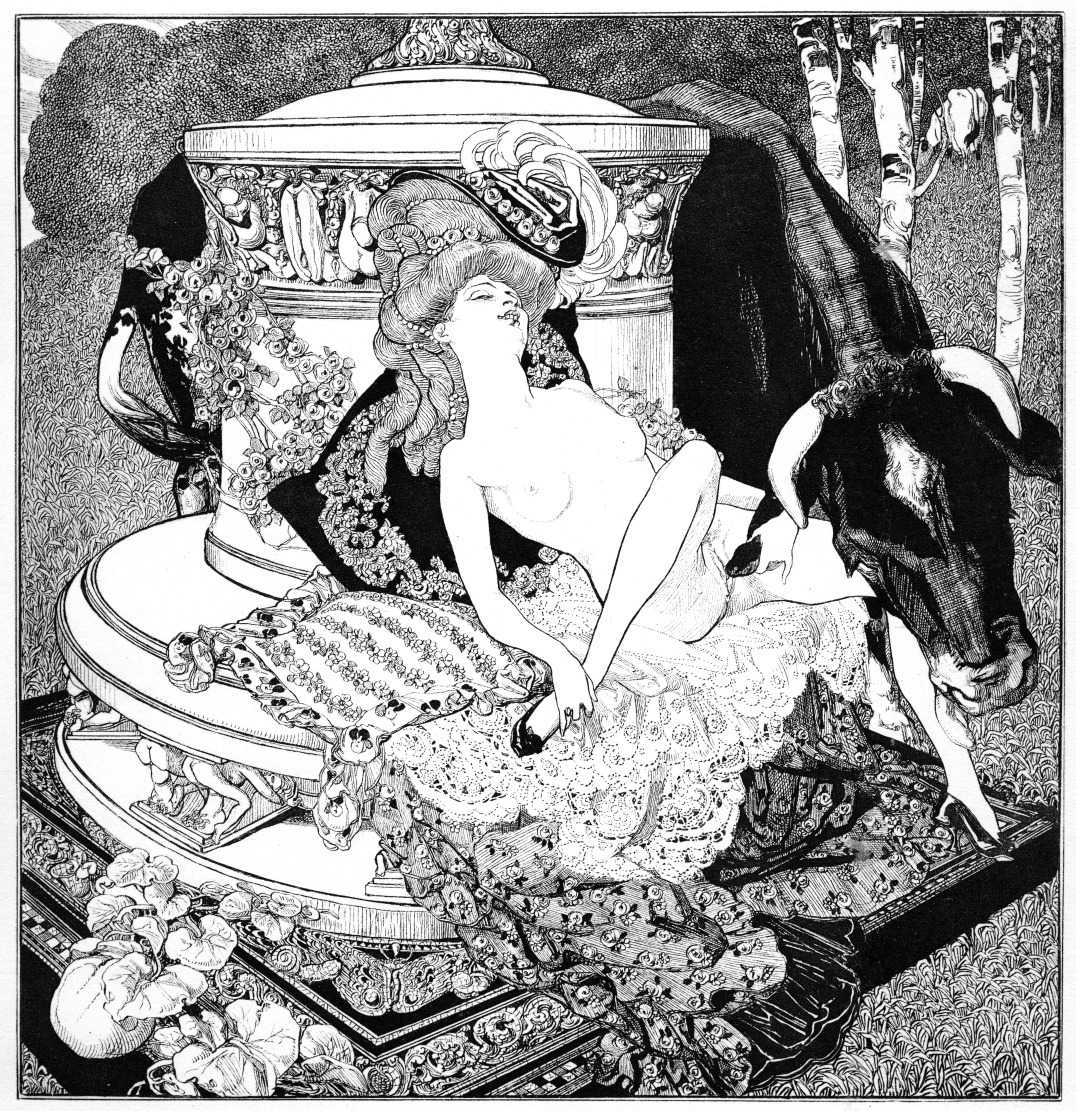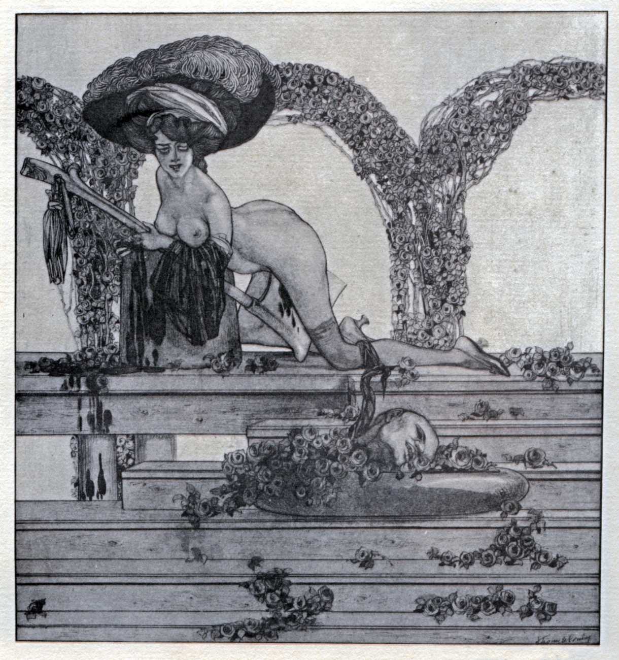 In 1897 Franz turned his back on Vienna and moved to Munich, at that time the art metropolis of the German Reich. The city was one of the main centres of German naturalism; it was also home to important illustrated book publishers including Albert Langen and Georg Müller. He studied at Adolf Hölzel’s academy in Dachau and Heinrich Knirr’s school in Munich, where Paul Klee was also trained. In 1904 Bayros mounted a successful exhibition in Munich, which resulted in several book illustration commissions, including Abbé Prévost’s Manon Lescaut for Insel Verlag and Diderot’s Die geschwätzigen Kleinode (Les bijoux indiscrets) for Georg Müller. But is was his detailed pen and ink drawings on erotic themes, clearly inspired by Aubrey Beardsley and Bayros’s extensive study of French rococo, that brought him the most attention and income. The privately published Fleurettens Purpurschnecke in 1905 was the first of several portfolios produced ‘for the discerning connoisseur’, a style and method of publication which would eventually lead to his Erzählungen am Toilettentische being censored and banned in 1911, and Bayros having to leave Munich for a while.