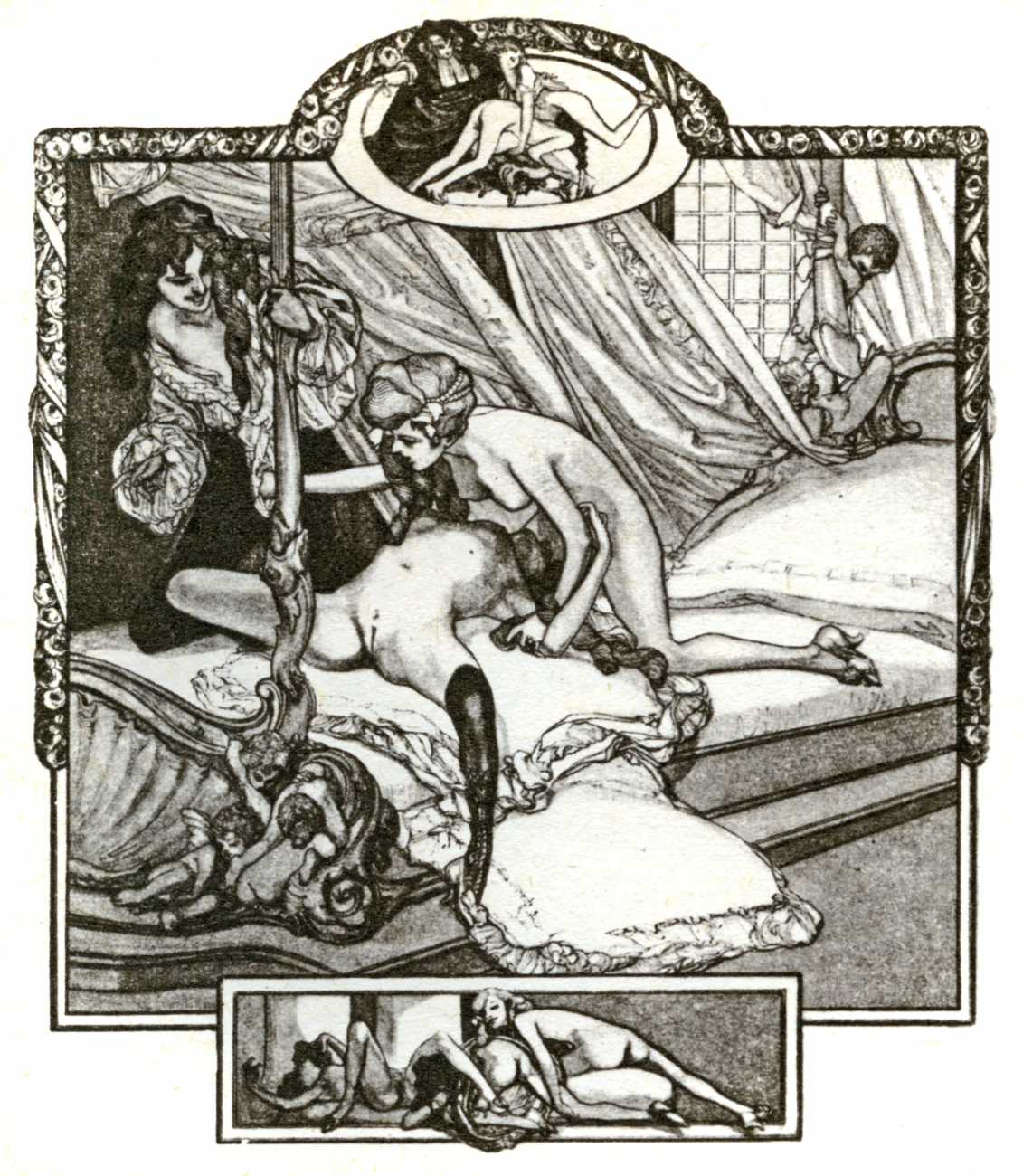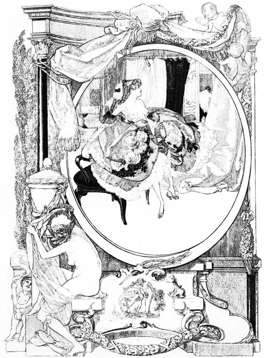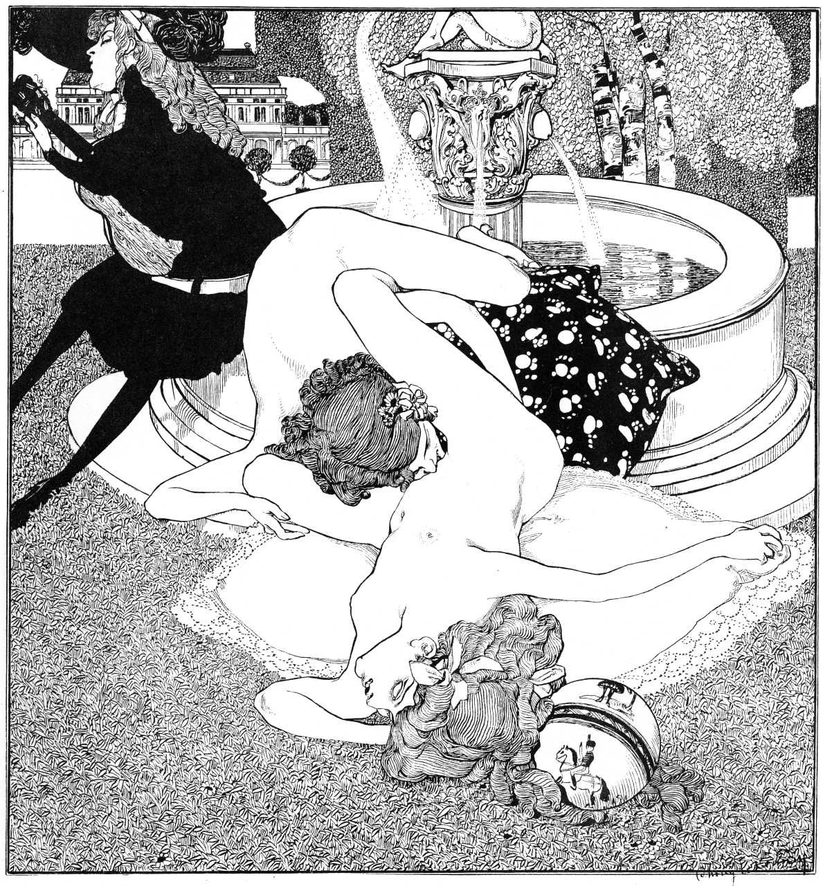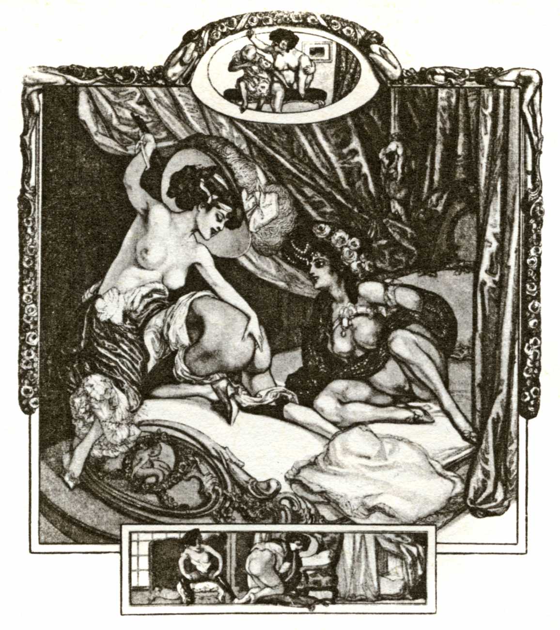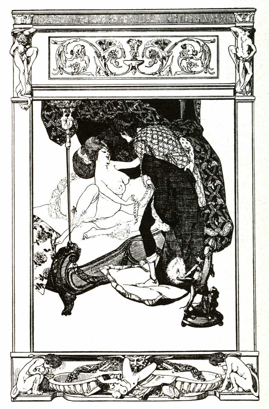 In 1897 Franz turned his back on Vienna and moved to Munich, at that time the art metropolis of the German Reich. The city was one of the main centres of German naturalism; it was also home to important illustrated book publishers including Albert Langen and Georg Müller. He studied at Adolf Hölzel’s academy in Dachau and Heinrich Knirr’s school in Munich, where Paul Klee was also trained. In 1904 Bayros mounted a successful exhibition in Munich, which resulted in several book illustration commissions, including Abbé Prévost’s Manon Lescaut for Insel Verlag and Diderot’s Die geschwätzigen Kleinode (Les bijoux indiscrets) for Georg Müller. But is was his detailed pen and ink drawings on erotic themes, clearly inspired by Aubrey Beardsley and Bayros’s extensive study of French rococo, that brought him the most attention and income. The privately published Fleurettens Purpurschnecke in 1905 was the first of several portfolios produced ‘for the discerning connoisseur’, a style and method of publication which would eventually lead to his Erzählungen am Toilettentische being censored and banned in 1911, and Bayros having to leave Munich for a while.
