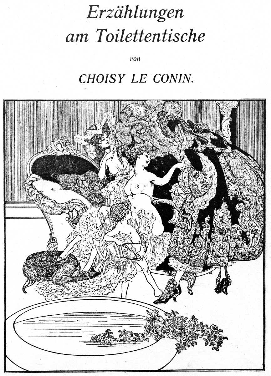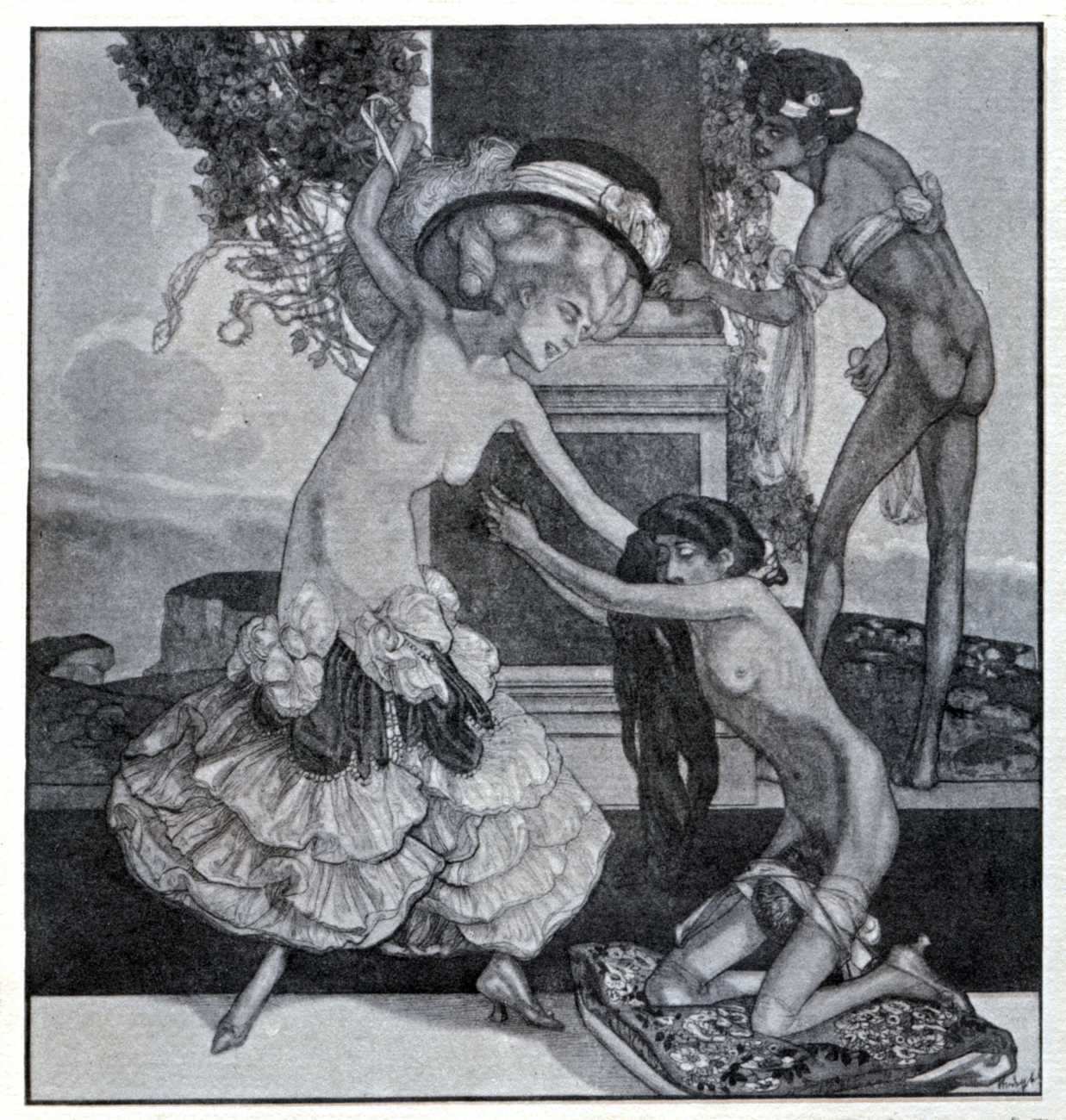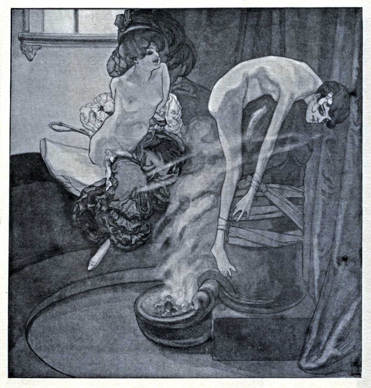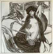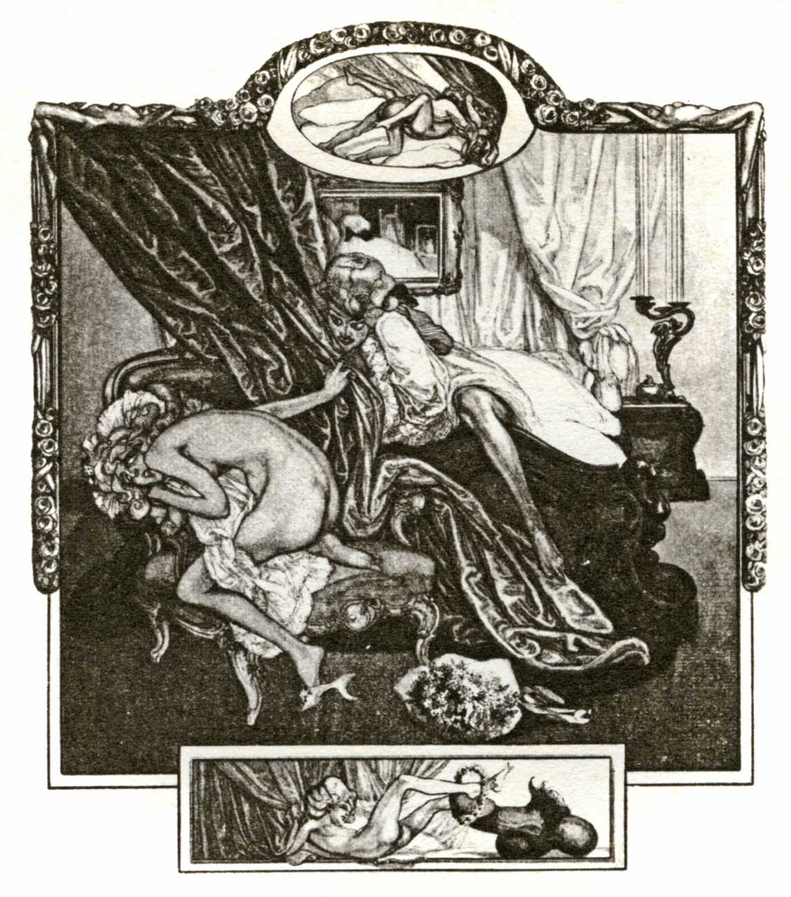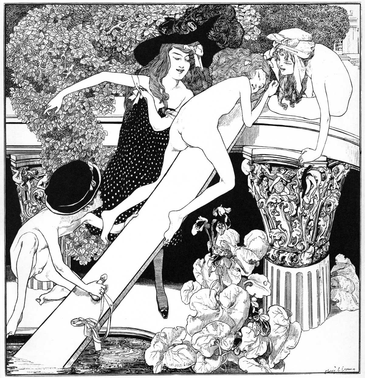 In 1897 Franz turned his back on Vienna and moved to Munich, at that time the art metropolis of the German Reich. The city was one of the main centres of German naturalism; it was also home to important illustrated book publishers including Albert Langen and Georg Müller. He studied at Adolf Hölzel’s academy in Dachau and Heinrich Knirr’s school in Munich, where Paul Klee was also trained. In 1904 Bayros mounted a successful exhibition in Munich, which resulted in several book illustration commissions, including Abbé Prévost’s Manon Lescaut for Insel Verlag and Diderot’s Die geschwätzigen Kleinode (Les bijoux indiscrets) for Georg Müller. But is was his detailed pen and ink drawings on erotic themes, clearly inspired by Aubrey Beardsley and Bayros’s extensive study of French rococo, that brought him the most attention and income. The privately published Fleurettens Purpurschnecke in 1905 was the first of several portfolios produced ‘for the discerning connoisseur’, a style and method of publication which would eventually lead to his Erzählungen am Toilettentische being censored and banned in 1911, and Bayros having to leave Munich for a while.