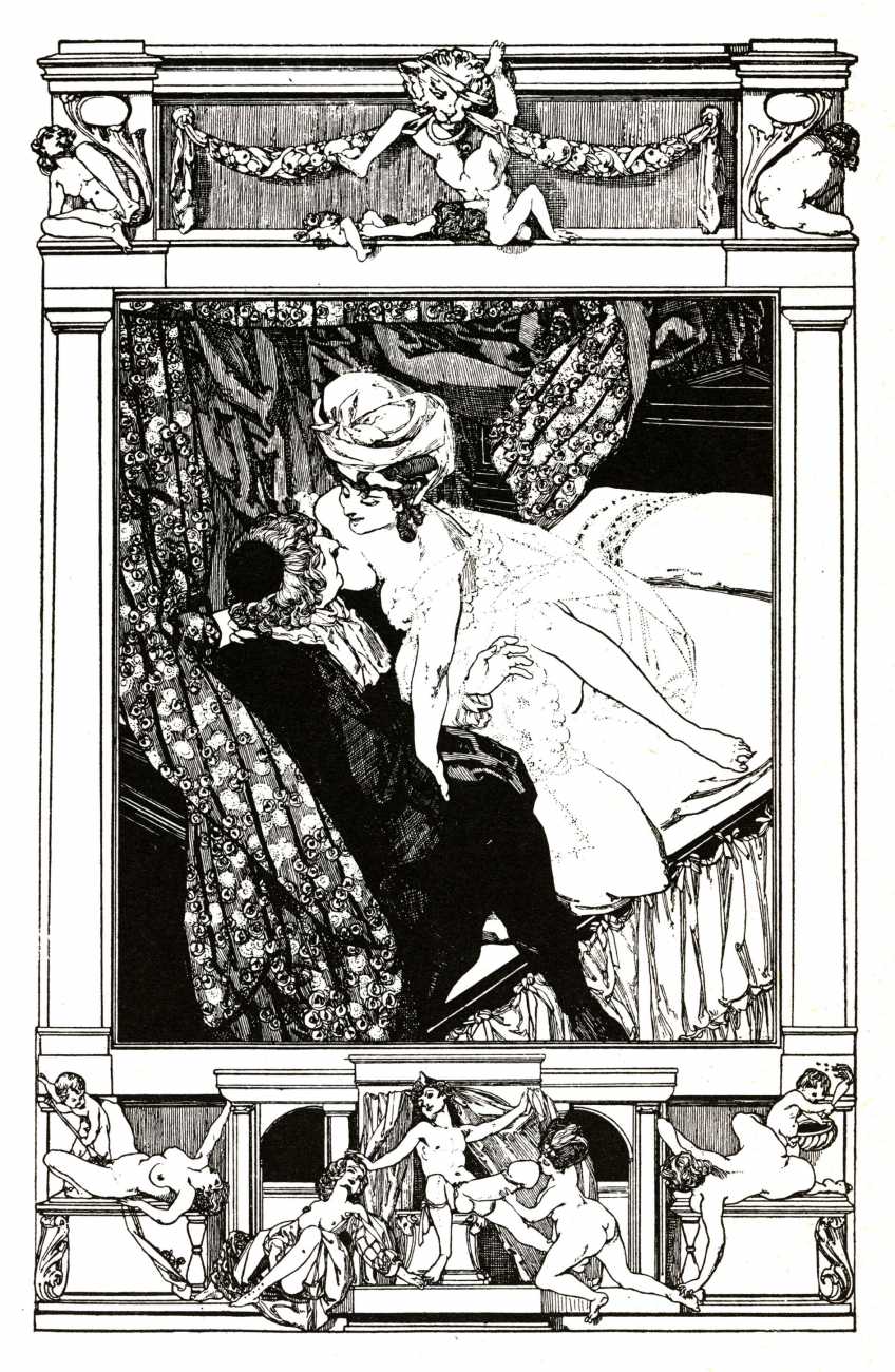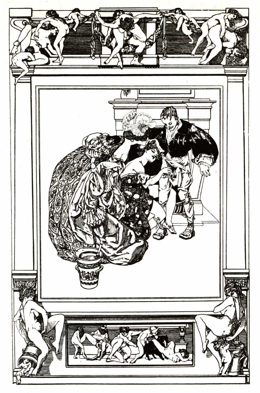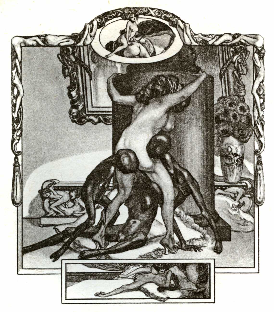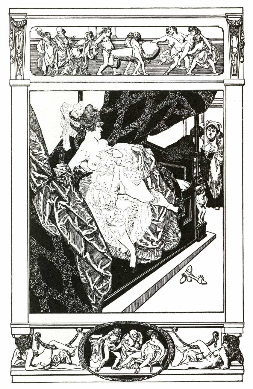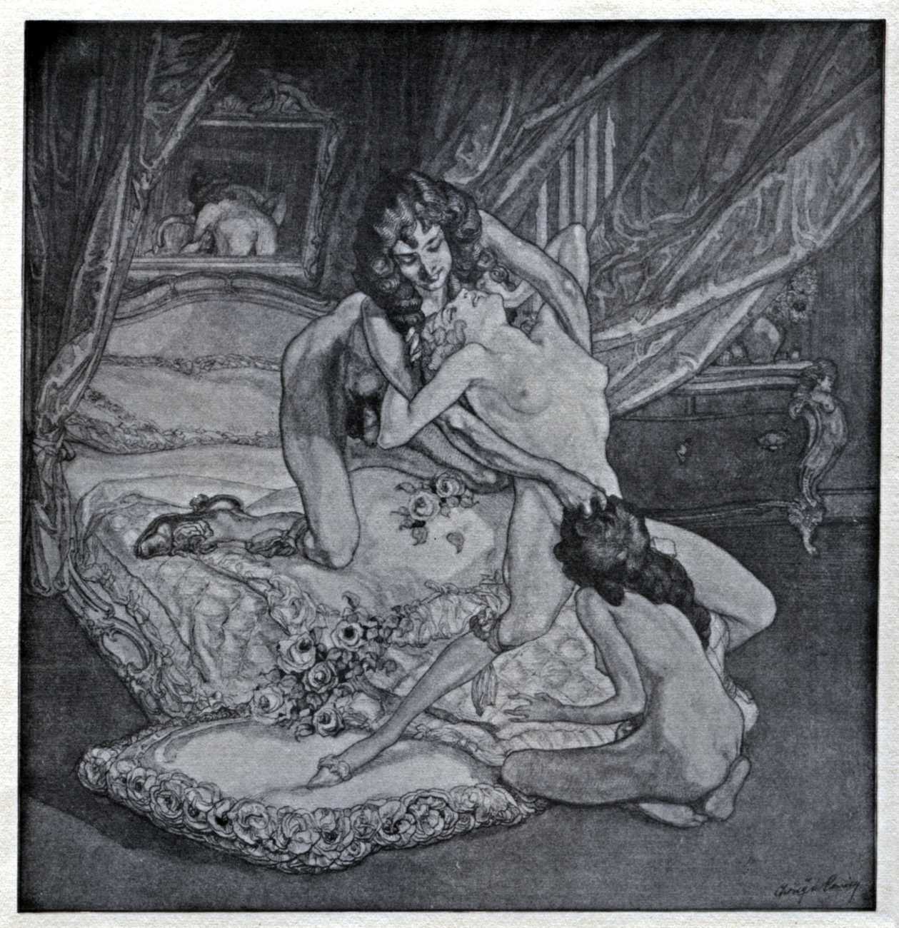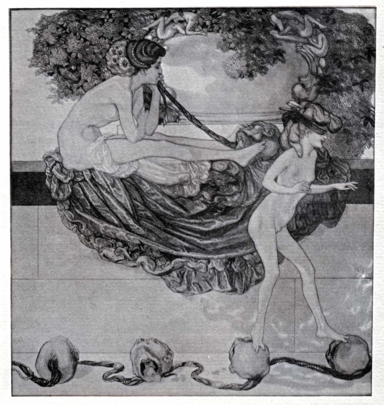 In 1897 Franz turned his back on Vienna and moved to Munich, at that time the art metropolis of the German Reich. The city was one of the main centres of German naturalism; it was also home to important illustrated book publishers including Albert Langen and Georg Müller. He studied at Adolf Hölzel’s academy in Dachau and Heinrich Knirr’s school in Munich, where Paul Klee was also trained. In 1904 Bayros mounted a successful exhibition in Munich, which resulted in several book illustration commissions, including Abbé Prévost’s Manon Lescaut for Insel Verlag and Diderot’s Die geschwätzigen Kleinode (Les bijoux indiscrets) for Georg Müller. But is was his detailed pen and ink drawings on erotic themes, clearly inspired by Aubrey Beardsley and Bayros’s extensive study of French rococo, that brought him the most attention and income. The privately published Fleurettens Purpurschnecke in 1905 was the first of several portfolios produced ‘for the discerning connoisseur’, a style and method of publication which would eventually lead to his Erzählungen am Toilettentische being censored and banned in 1911, and Bayros having to leave Munich for a while.