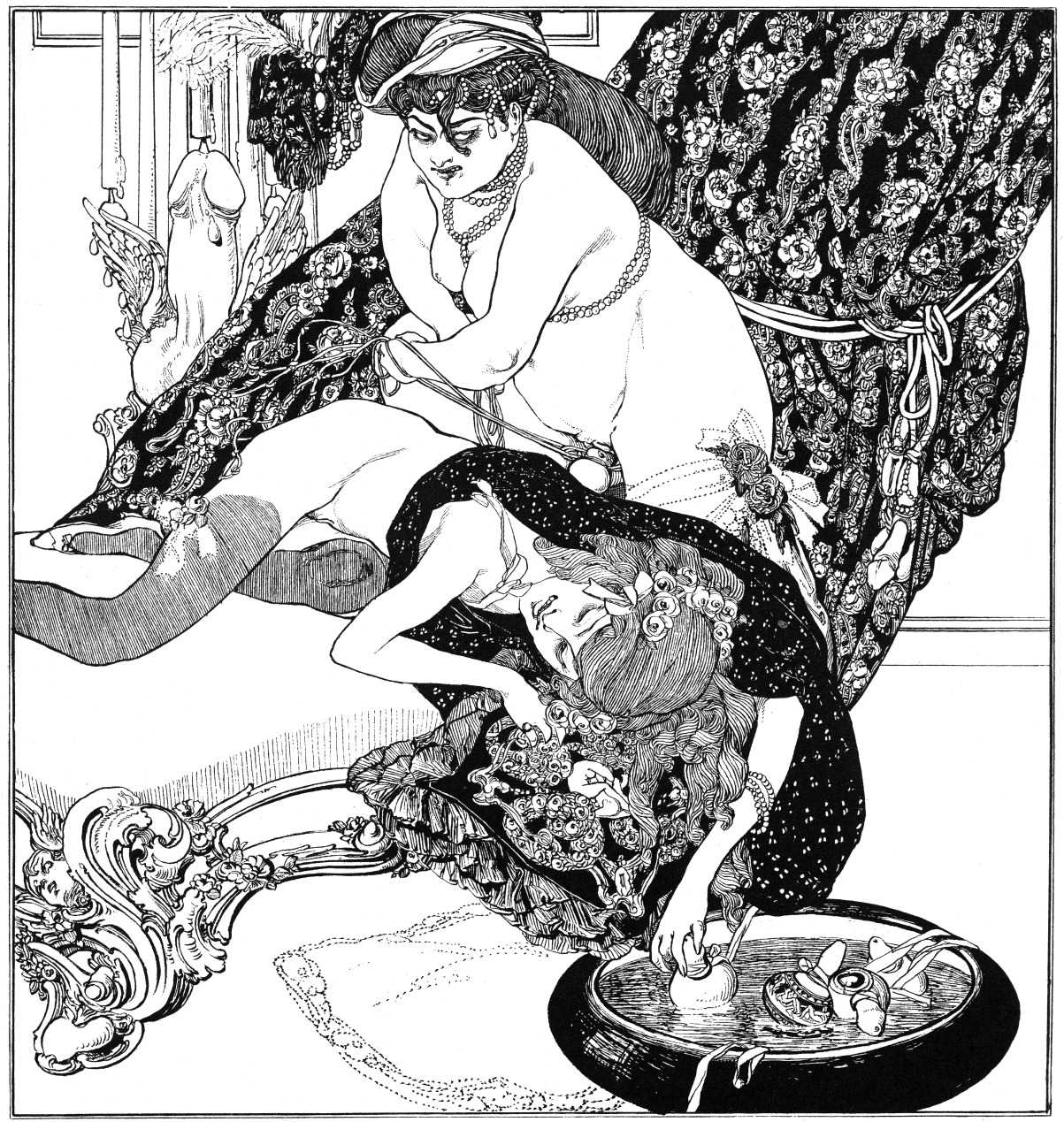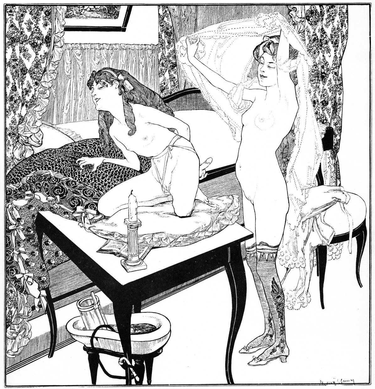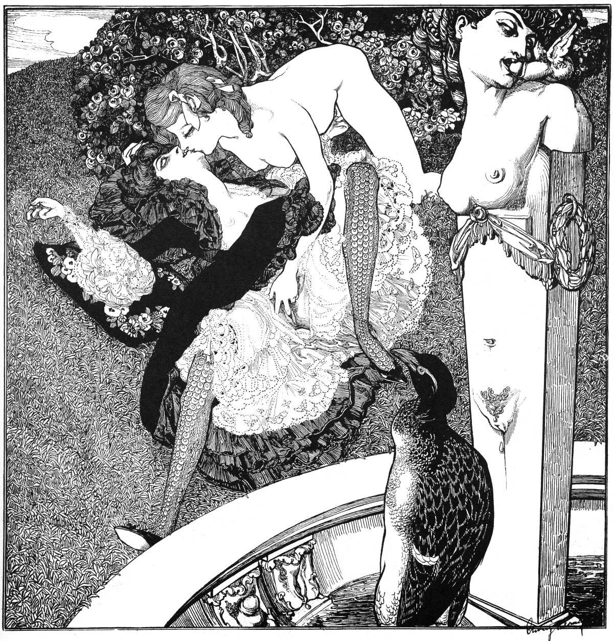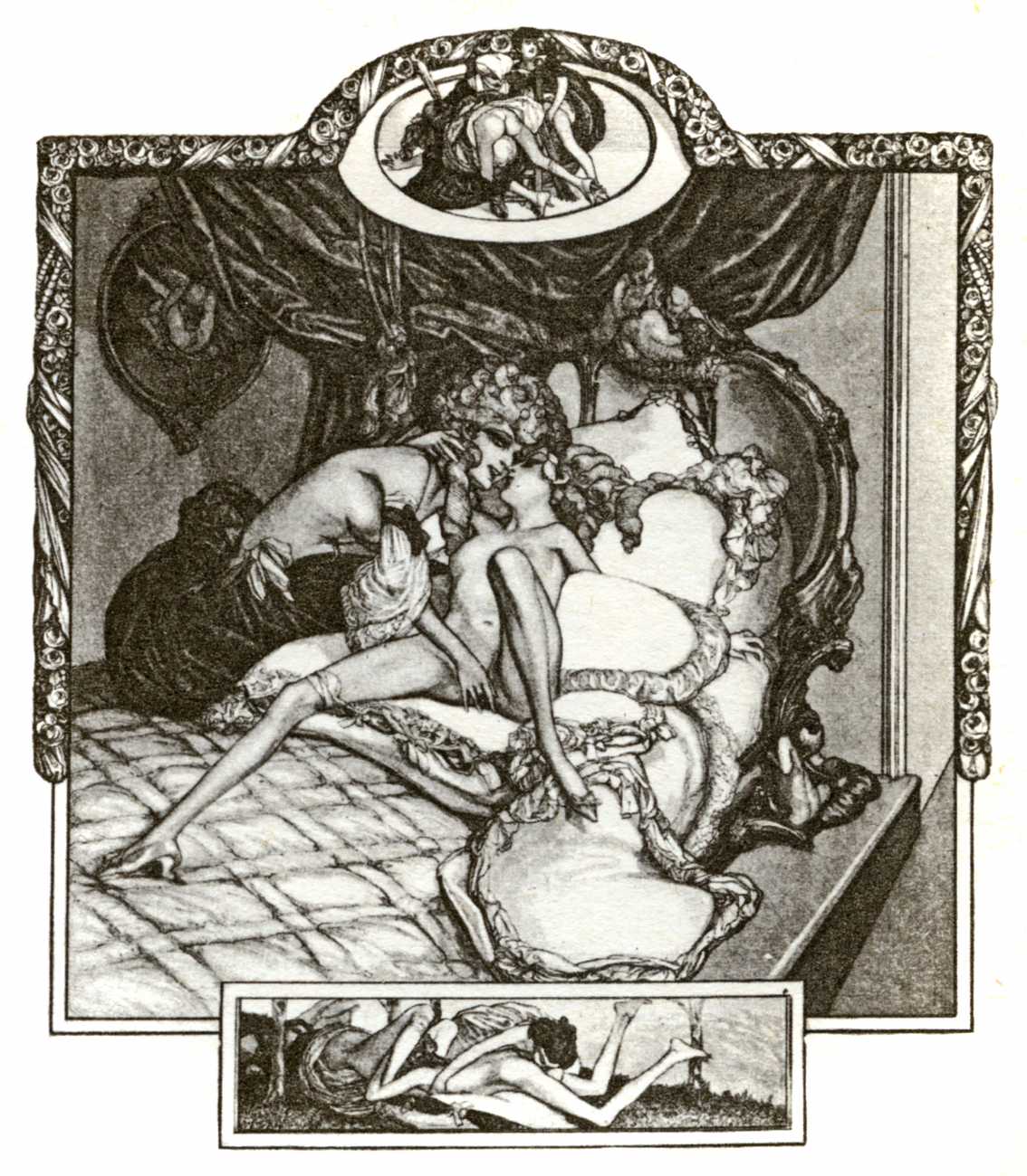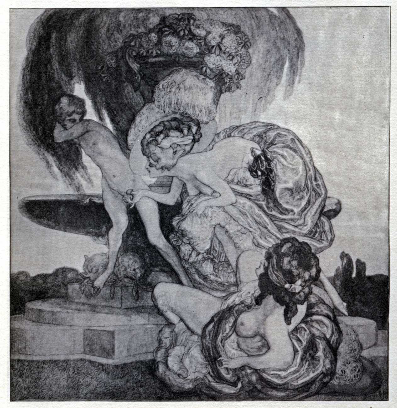 In 1897 Franz turned his back on Vienna and moved to Munich, at that time the art metropolis of the German Reich. The city was one of the main centres of German naturalism; it was also home to important illustrated book publishers including Albert Langen and Georg Müller. He studied at Adolf Hölzel’s academy in Dachau and Heinrich Knirr’s school in Munich, where Paul Klee was also trained. In 1904 Bayros mounted a successful exhibition in Munich, which resulted in several book illustration commissions, including Abbé Prévost’s Manon Lescaut for Insel Verlag and Diderot’s Die geschwätzigen Kleinode (Les bijoux indiscrets) for Georg Müller. But is was his detailed pen and ink drawings on erotic themes, clearly inspired by Aubrey Beardsley and Bayros’s extensive study of French rococo, that brought him the most attention and income. The privately published Fleurettens Purpurschnecke in 1905 was the first of several portfolios produced ‘for the discerning connoisseur’, a style and method of publication which would eventually lead to his Erzählungen am Toilettentische being censored and banned in 1911, and Bayros having to leave Munich for a while.