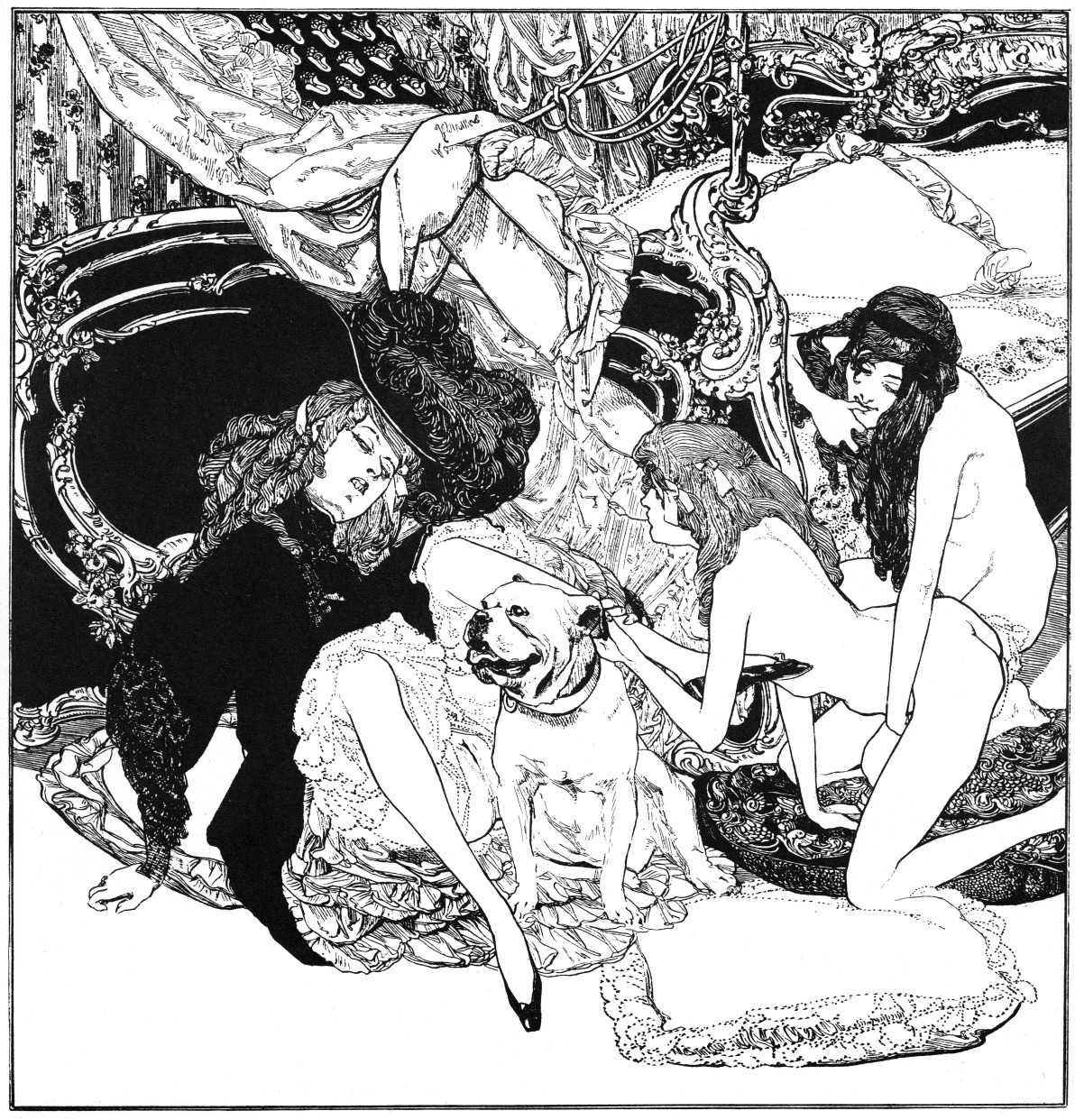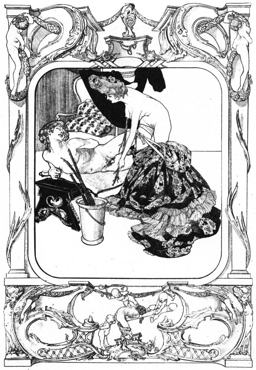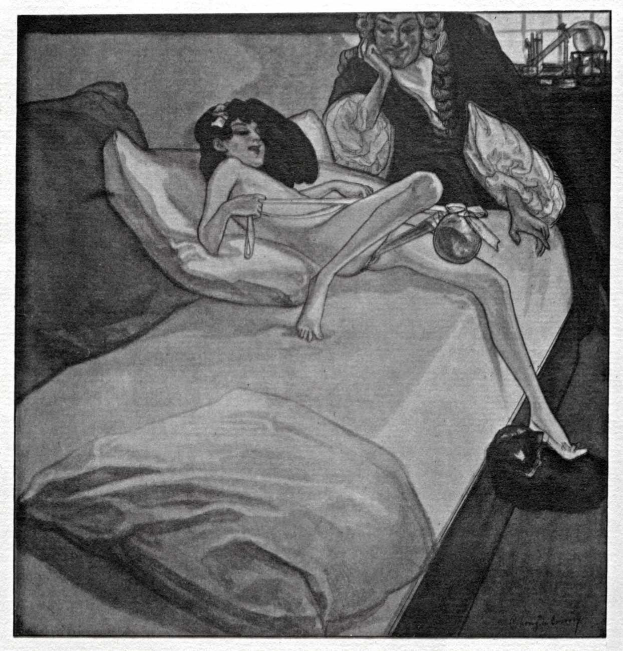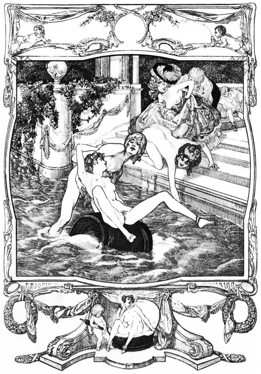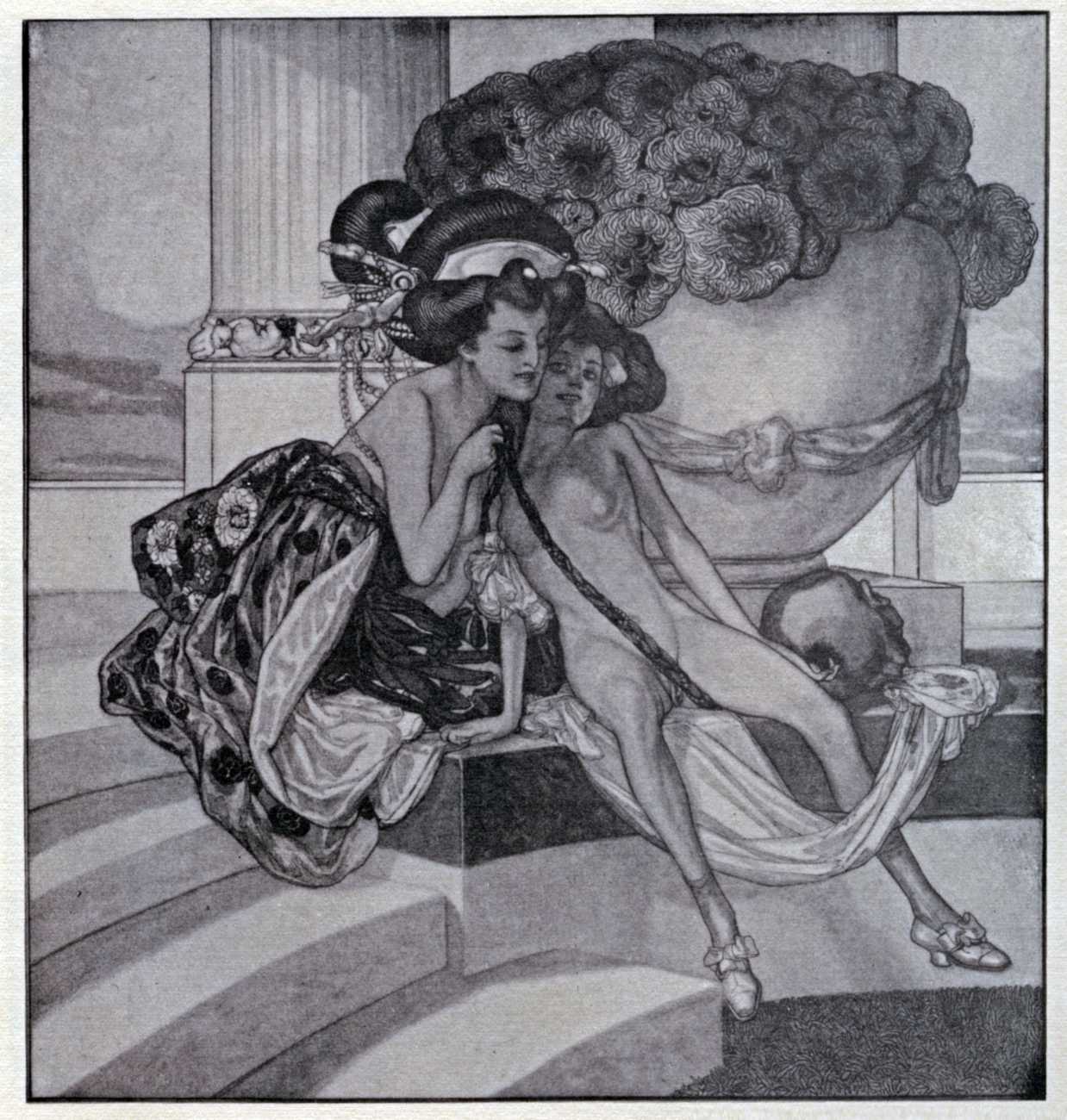 In 1897 Franz turned his back on Vienna and moved to Munich, at that time the art metropolis of the German Reich. The city was one of the main centres of German naturalism; it was also home to important illustrated book publishers including Albert Langen and Georg Müller. He studied at Adolf Hölzel’s academy in Dachau and Heinrich Knirr’s school in Munich, where Paul Klee was also trained. In 1904 Bayros mounted a successful exhibition in Munich, which resulted in several book illustration commissions, including Abbé Prévost’s Manon Lescaut for Insel Verlag and Diderot’s Die geschwätzigen Kleinode (Les bijoux indiscrets) for Georg Müller. But is was his detailed pen and ink drawings on erotic themes, clearly inspired by Aubrey Beardsley and Bayros’s extensive study of French rococo, that brought him the most attention and income. The privately published Fleurettens Purpurschnecke in 1905 was the first of several portfolios produced ‘for the discerning connoisseur’, a style and method of publication which would eventually lead to his Erzählungen am Toilettentische being censored and banned in 1911, and Bayros having to leave Munich for a while.
