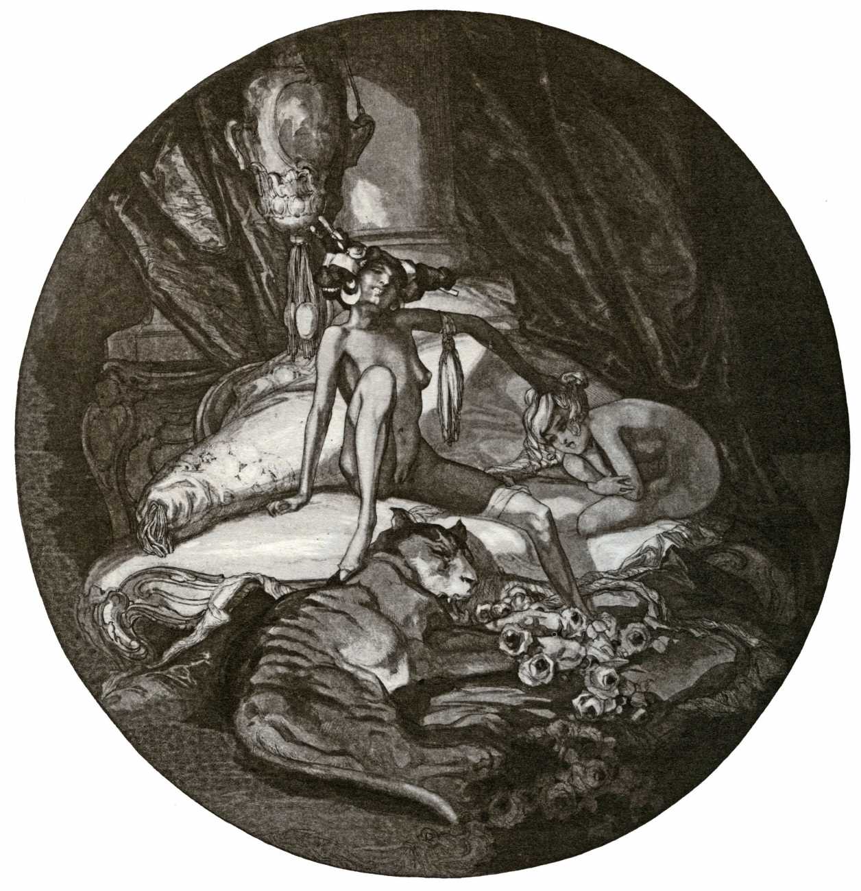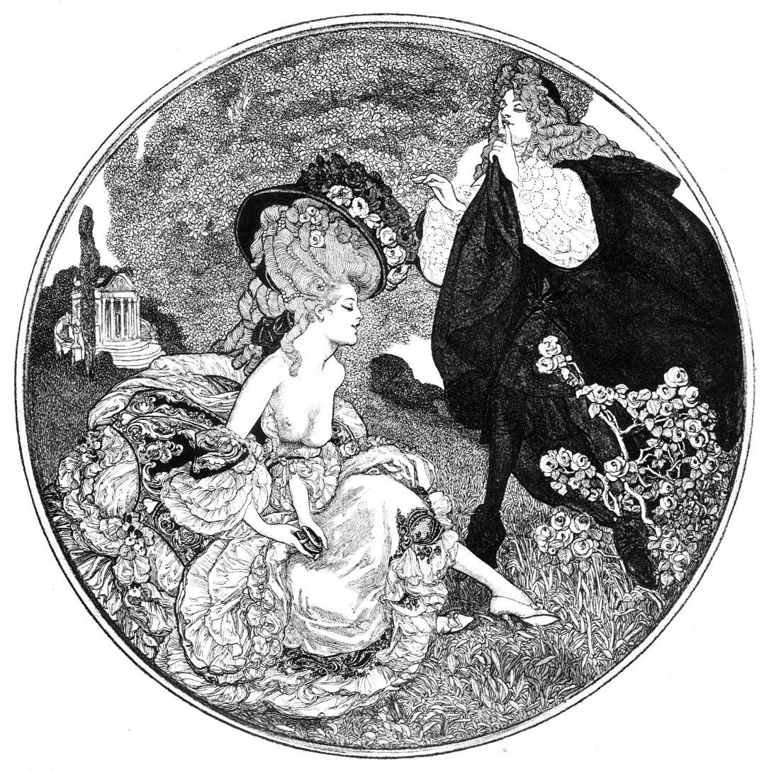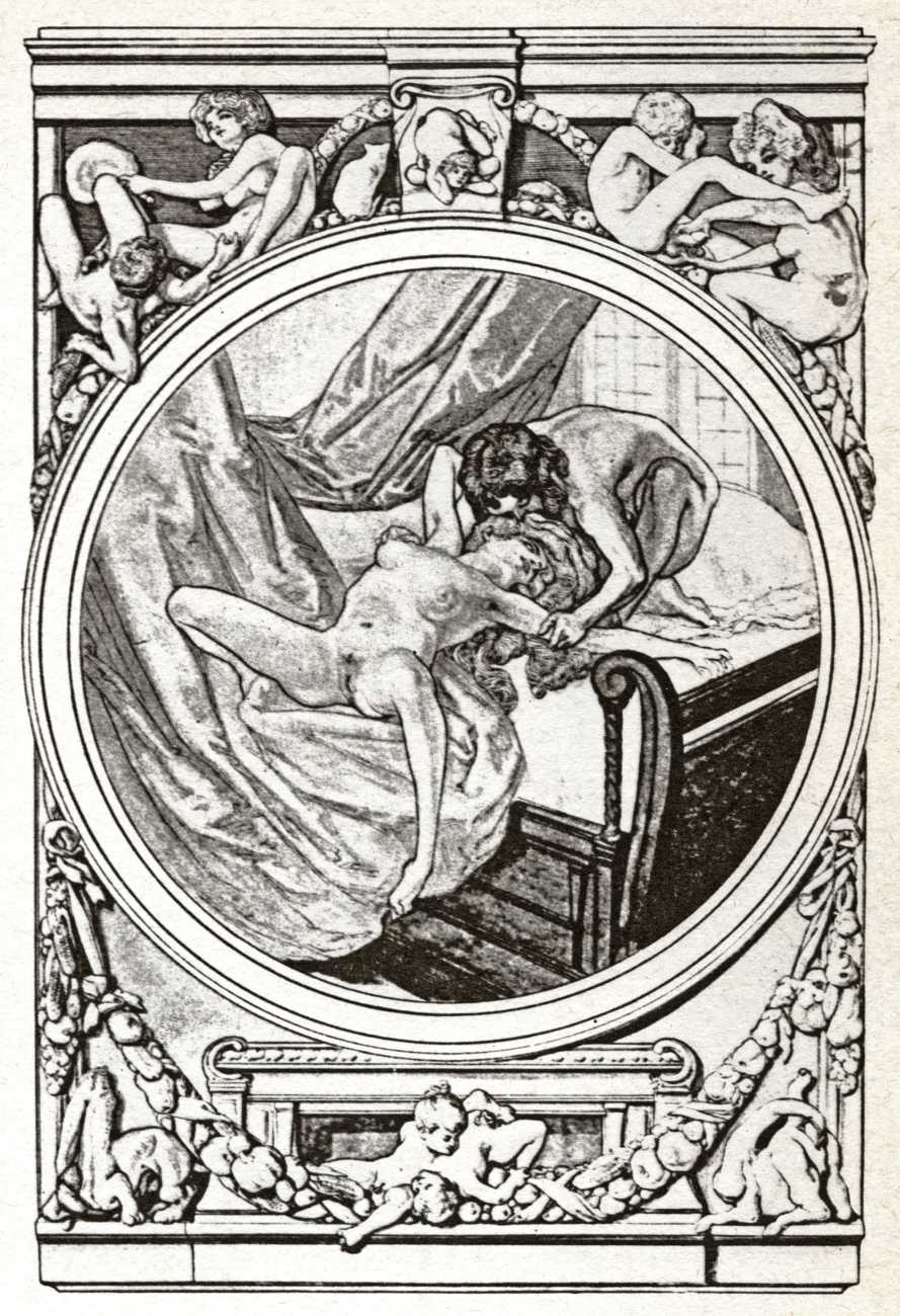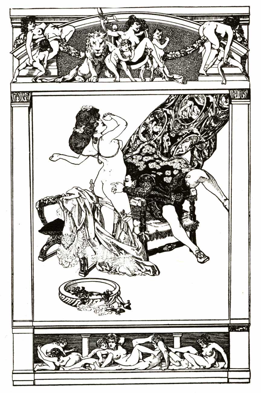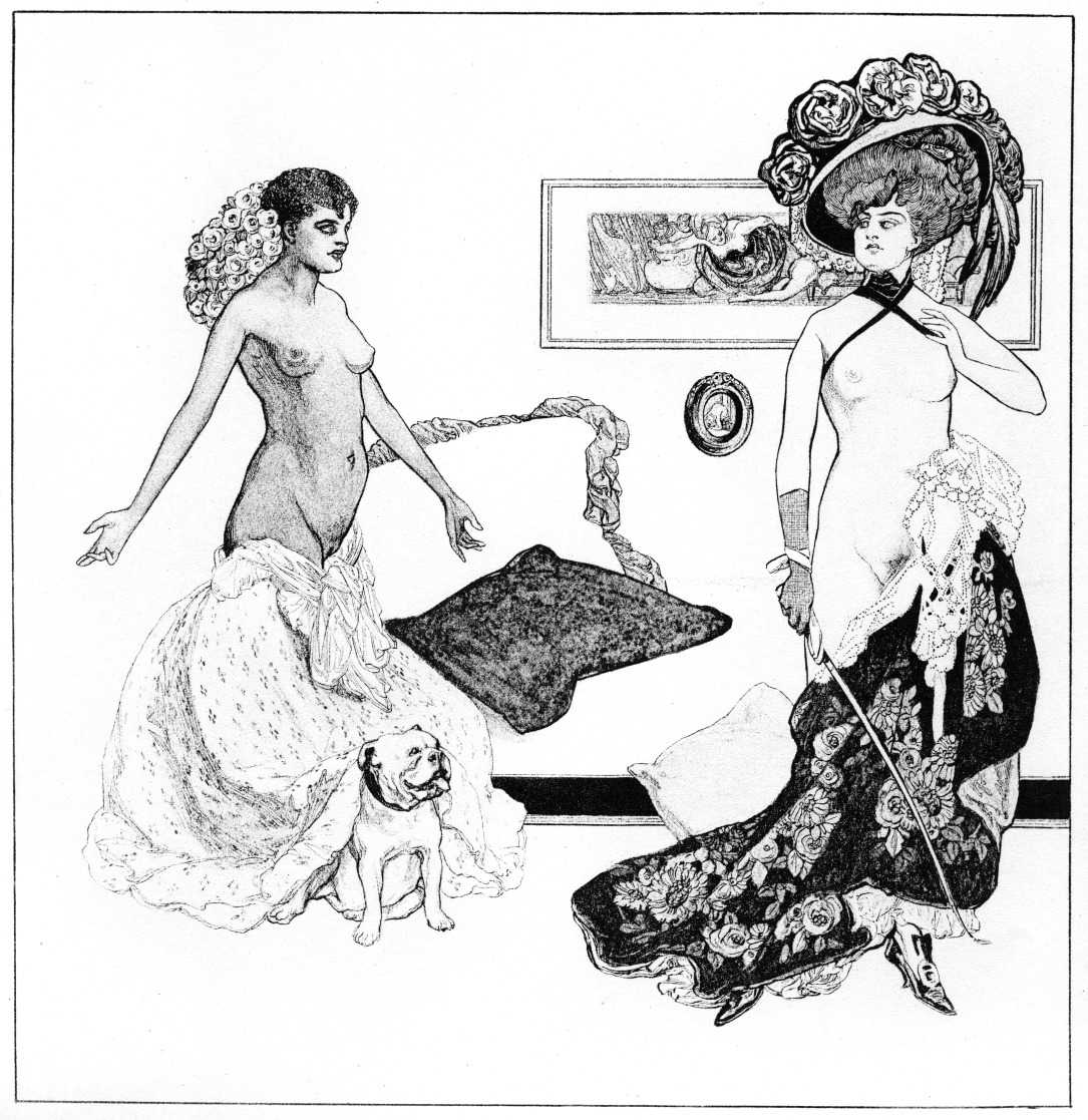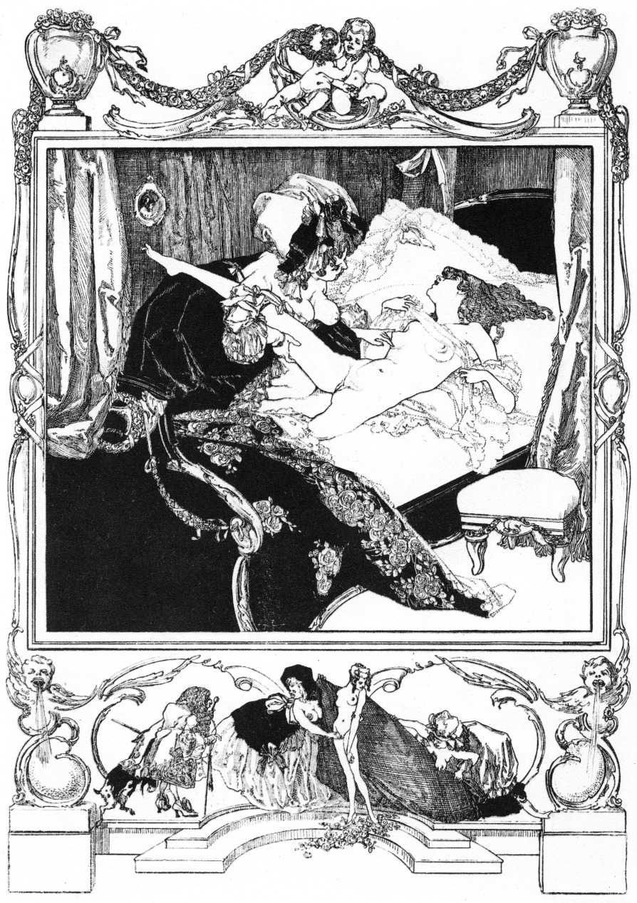 In 1897 Franz turned his back on Vienna and moved to Munich, at that time the art metropolis of the German Reich. The city was one of the main centres of German naturalism; it was also home to important illustrated book publishers including Albert Langen and Georg Müller. He studied at Adolf Hölzel’s academy in Dachau and Heinrich Knirr’s school in Munich, where Paul Klee was also trained. In 1904 Bayros mounted a successful exhibition in Munich, which resulted in several book illustration commissions, including Abbé Prévost’s Manon Lescaut for Insel Verlag and Diderot’s Die geschwätzigen Kleinode (Les bijoux indiscrets) for Georg Müller. But is was his detailed pen and ink drawings on erotic themes, clearly inspired by Aubrey Beardsley and Bayros’s extensive study of French rococo, that brought him the most attention and income. The privately published Fleurettens Purpurschnecke in 1905 was the first of several portfolios produced ‘for the discerning connoisseur’, a style and method of publication which would eventually lead to his Erzählungen am Toilettentische being censored and banned in 1911, and Bayros having to leave Munich for a while.