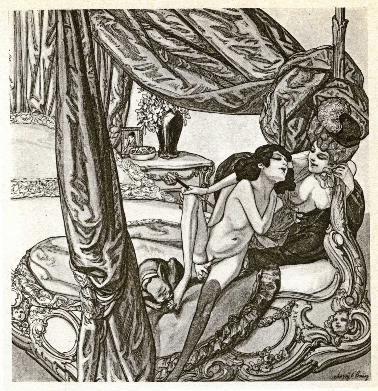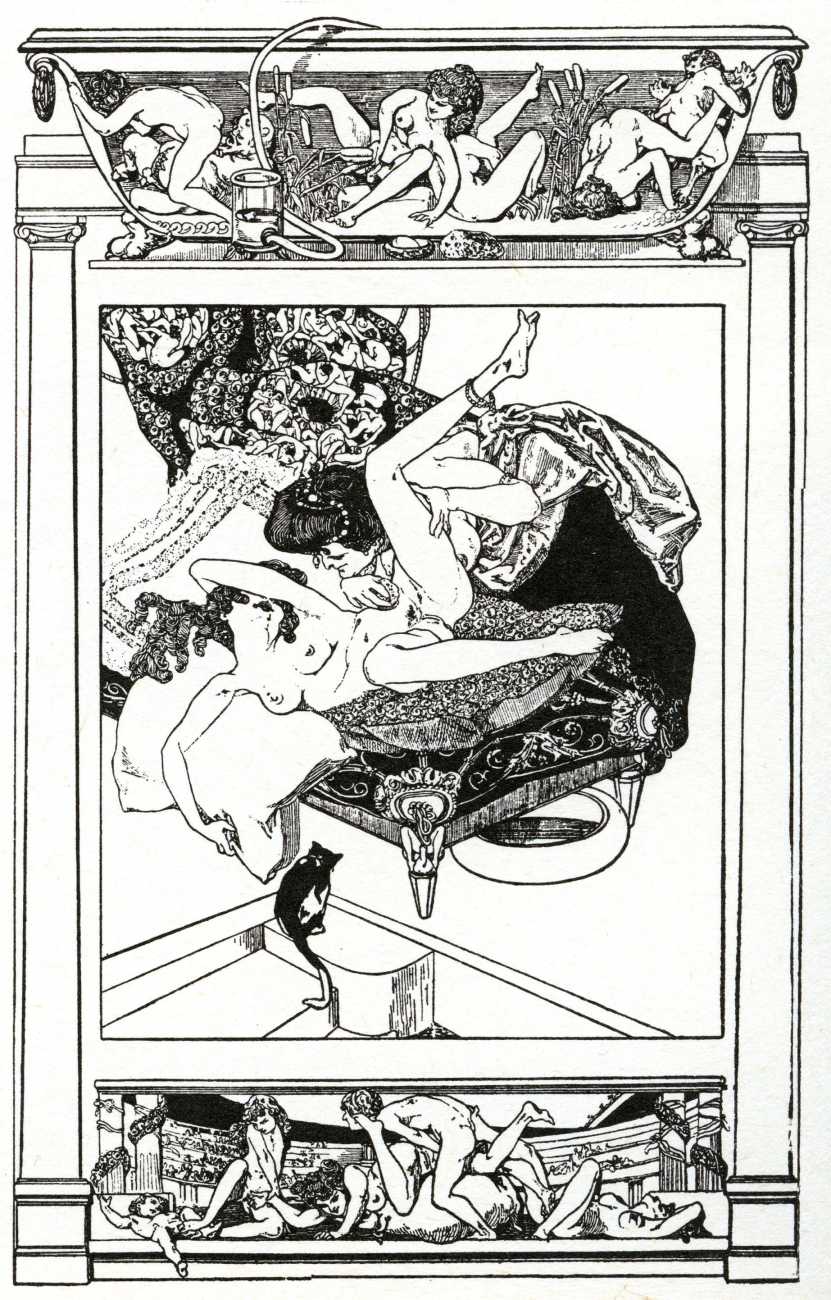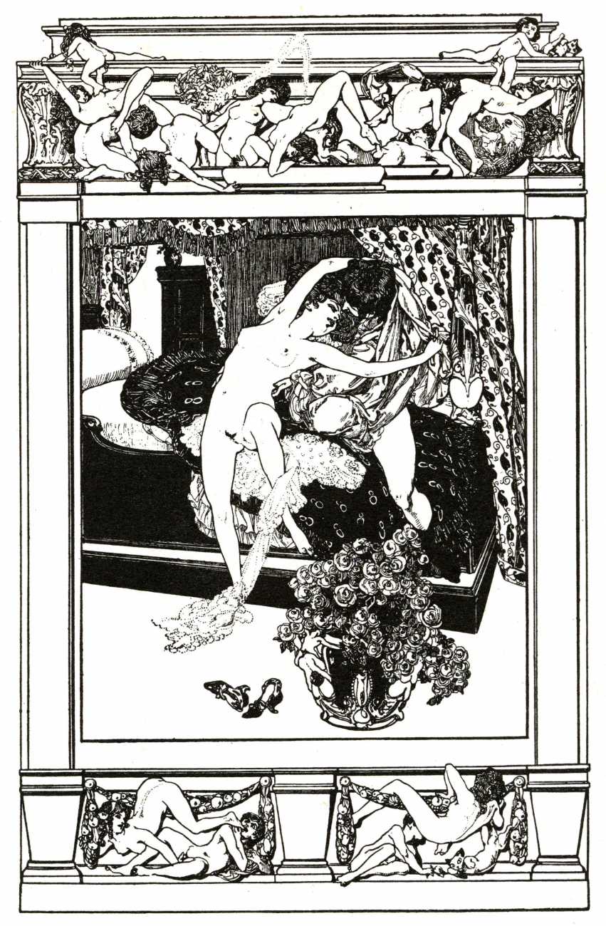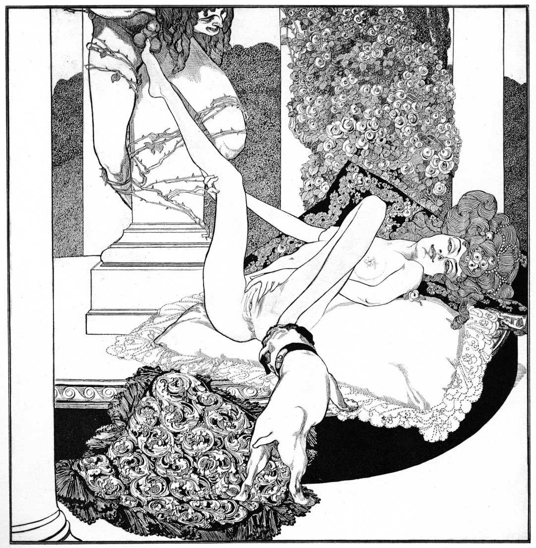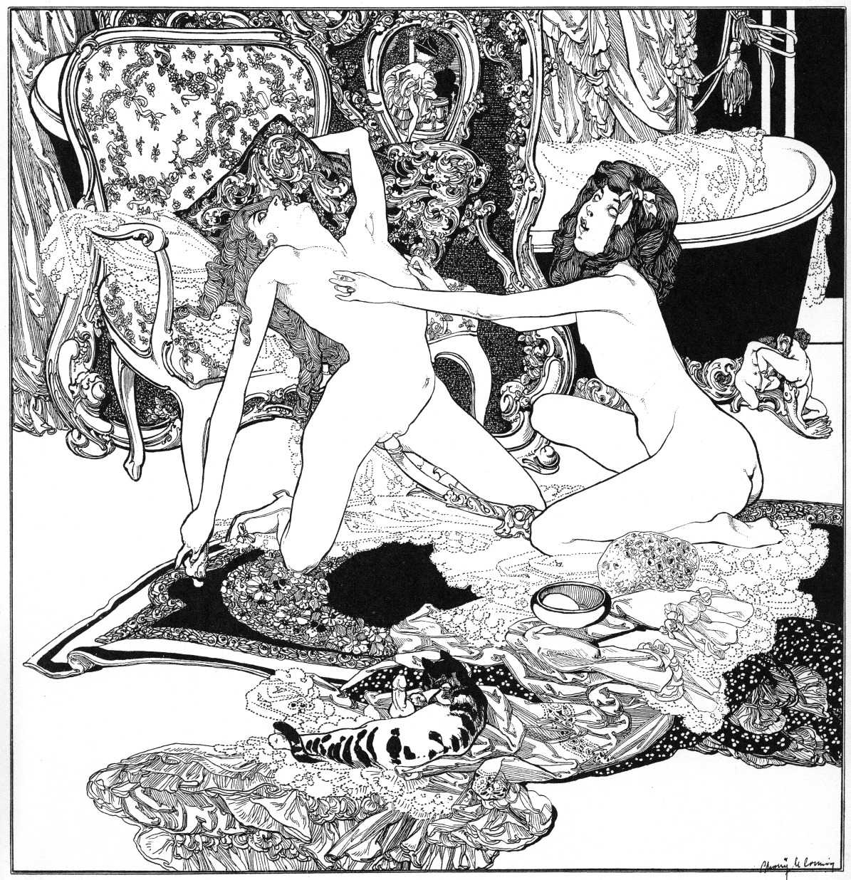 In 1897 Franz turned his back on Vienna and moved to Munich, at that time the art metropolis of the German Reich. The city was one of the main centres of German naturalism; it was also home to important illustrated book publishers including Albert Langen and Georg Müller. He studied at Adolf Hölzel’s academy in Dachau and Heinrich Knirr’s school in Munich, where Paul Klee was also trained. In 1904 Bayros mounted a successful exhibition in Munich, which resulted in several book illustration commissions, including Abbé Prévost’s Manon Lescaut for Insel Verlag and Diderot’s Die geschwätzigen Kleinode (Les bijoux indiscrets) for Georg Müller. But is was his detailed pen and ink drawings on erotic themes, clearly inspired by Aubrey Beardsley and Bayros’s extensive study of French rococo, that brought him the most attention and income. The privately published Fleurettens Purpurschnecke in 1905 was the first of several portfolios produced ‘for the discerning connoisseur’, a style and method of publication which would eventually lead to his Erzählungen am Toilettentische being censored and banned in 1911, and Bayros having to leave Munich for a while.