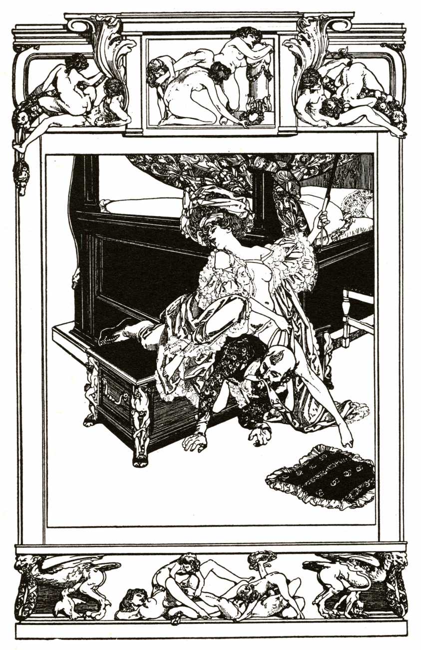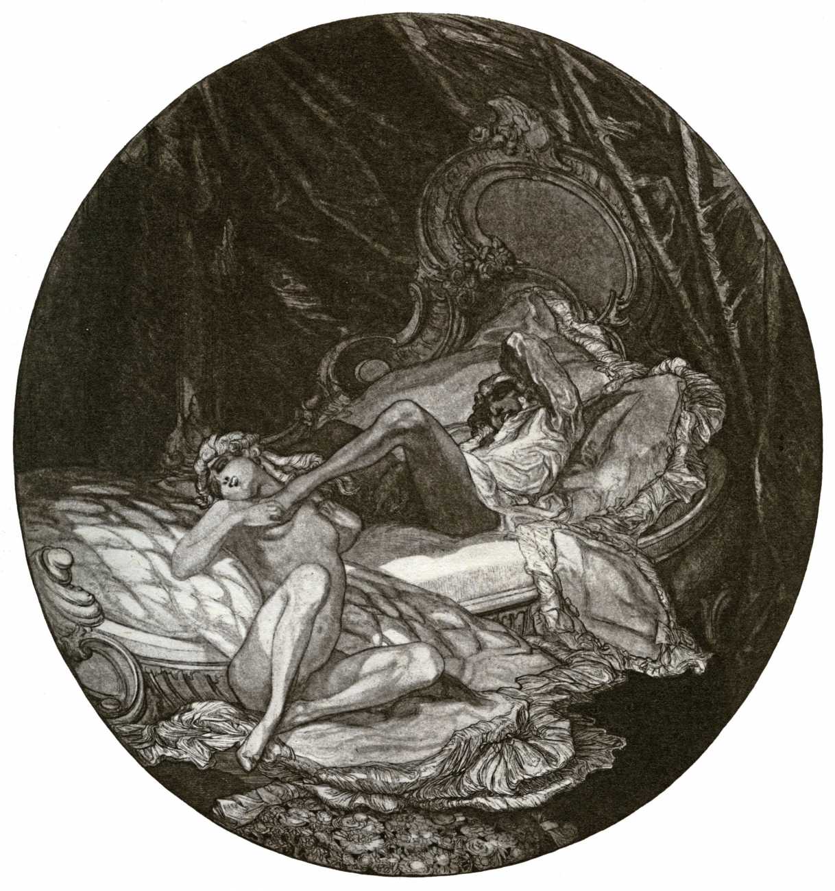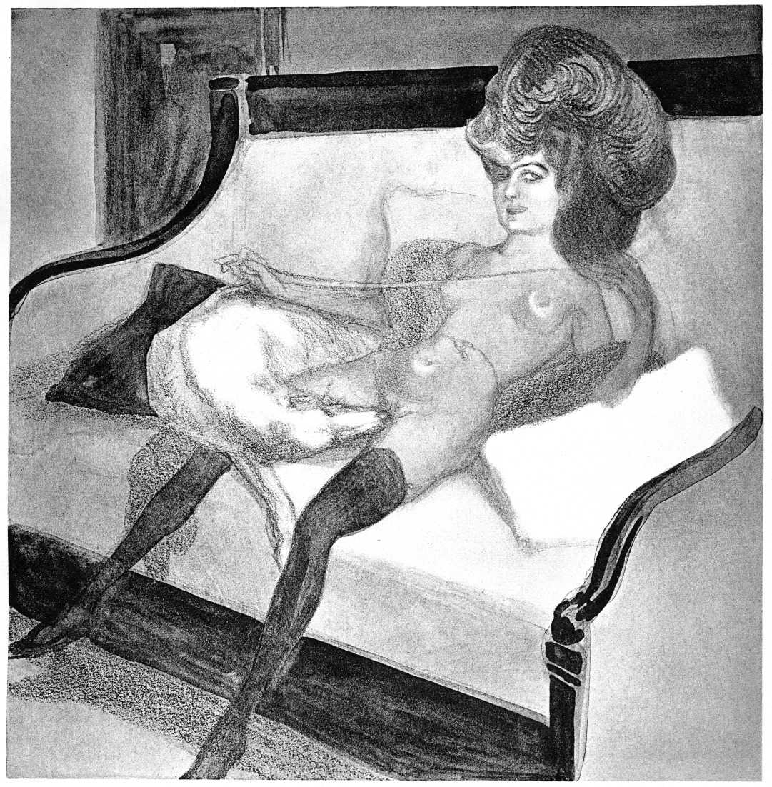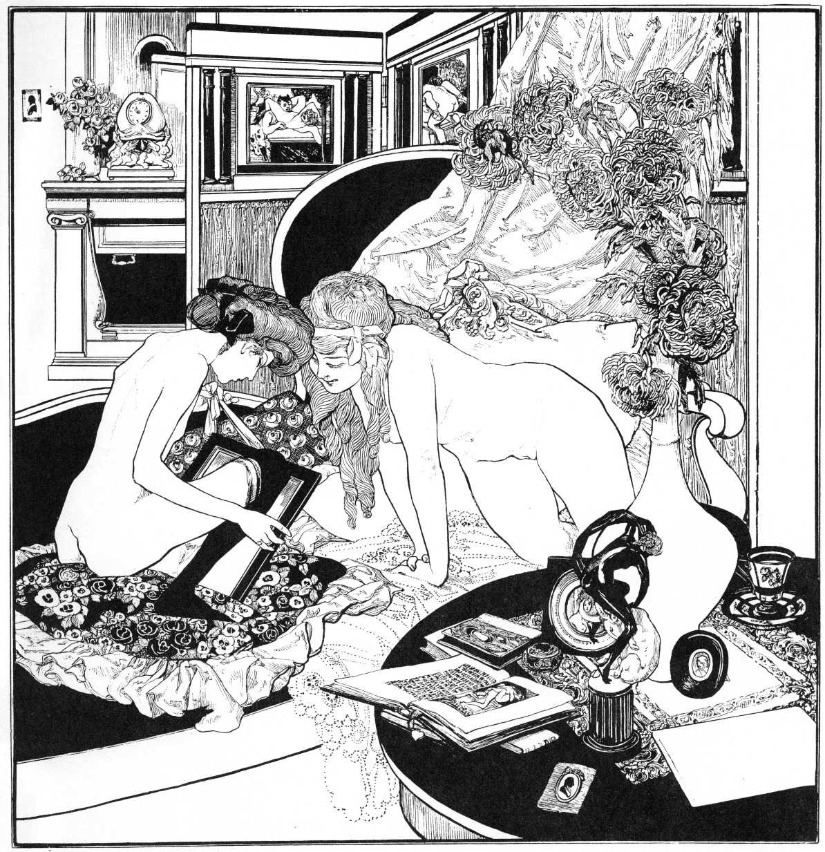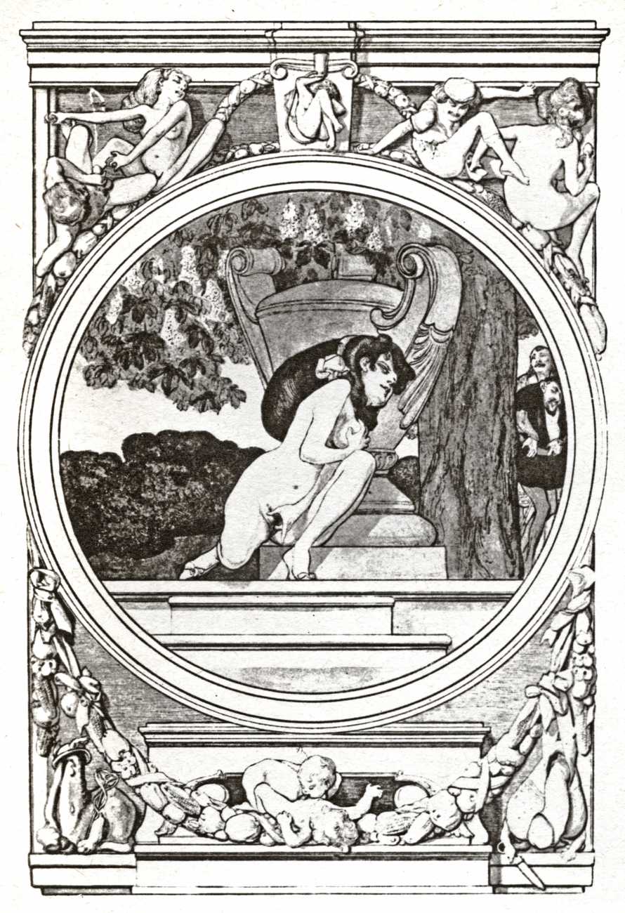 In 1897 Franz turned his back on Vienna and moved to Munich, at that time the art metropolis of the German Reich. The city was one of the main centres of German naturalism; it was also home to important illustrated book publishers including Albert Langen and Georg Müller. He studied at Adolf Hölzel’s academy in Dachau and Heinrich Knirr’s school in Munich, where Paul Klee was also trained. In 1904 Bayros mounted a successful exhibition in Munich, which resulted in several book illustration commissions, including Abbé Prévost’s Manon Lescaut for Insel Verlag and Diderot’s Die geschwätzigen Kleinode (Les bijoux indiscrets) for Georg Müller. But is was his detailed pen and ink drawings on erotic themes, clearly inspired by Aubrey Beardsley and Bayros’s extensive study of French rococo, that brought him the most attention and income. The privately published Fleurettens Purpurschnecke in 1905 was the first of several portfolios produced ‘for the discerning connoisseur’, a style and method of publication which would eventually lead to his Erzählungen am Toilettentische being censored and banned in 1911, and Bayros having to leave Munich for a while.