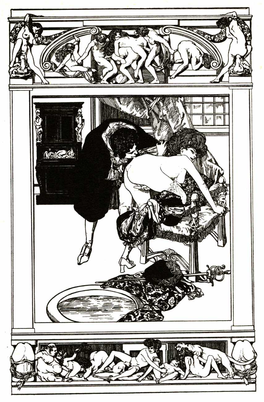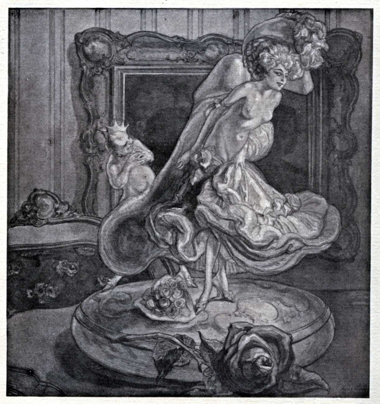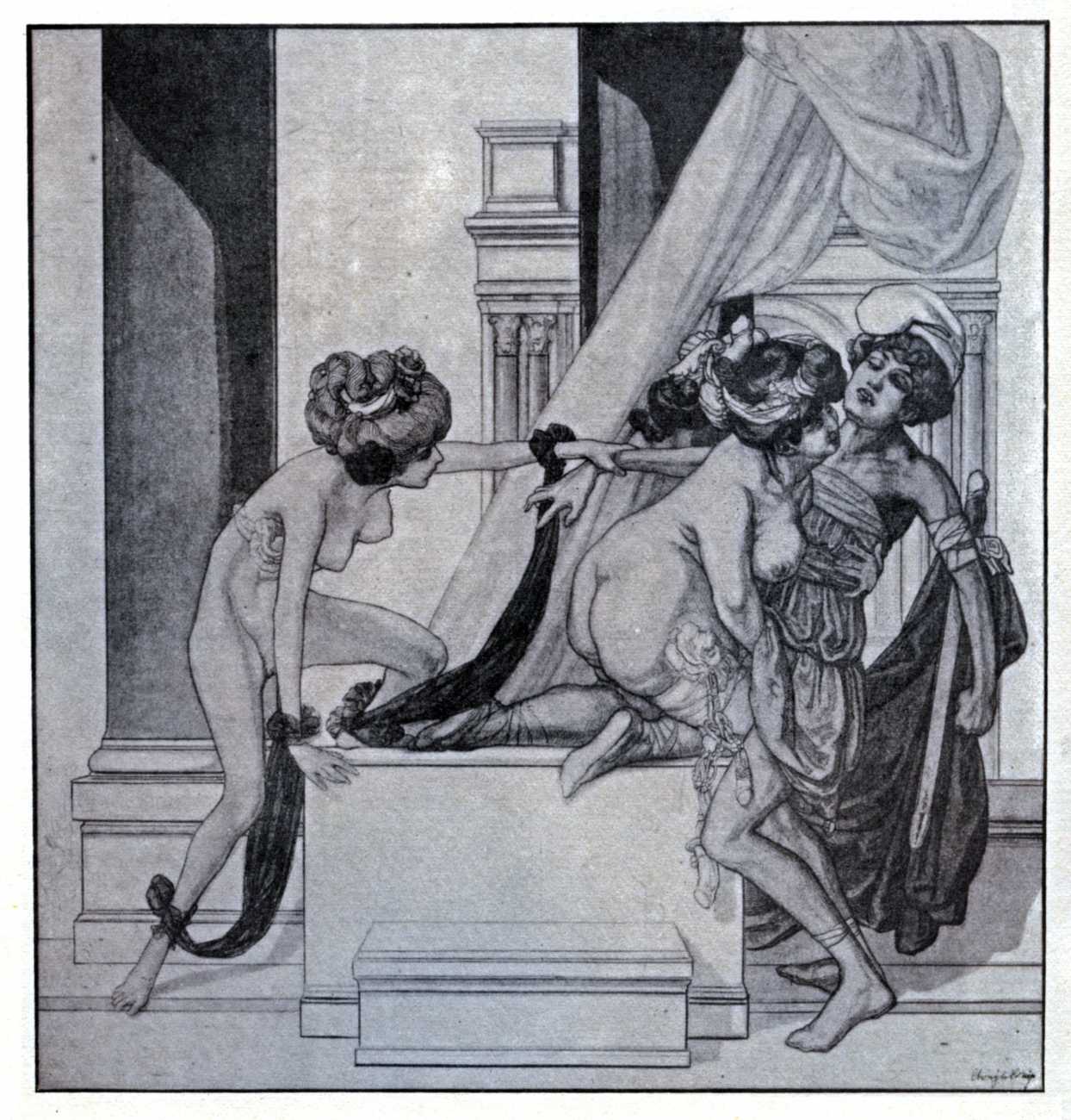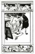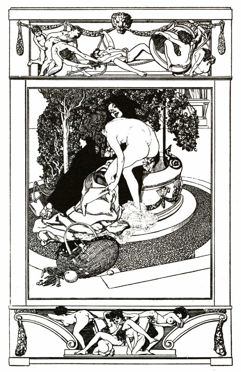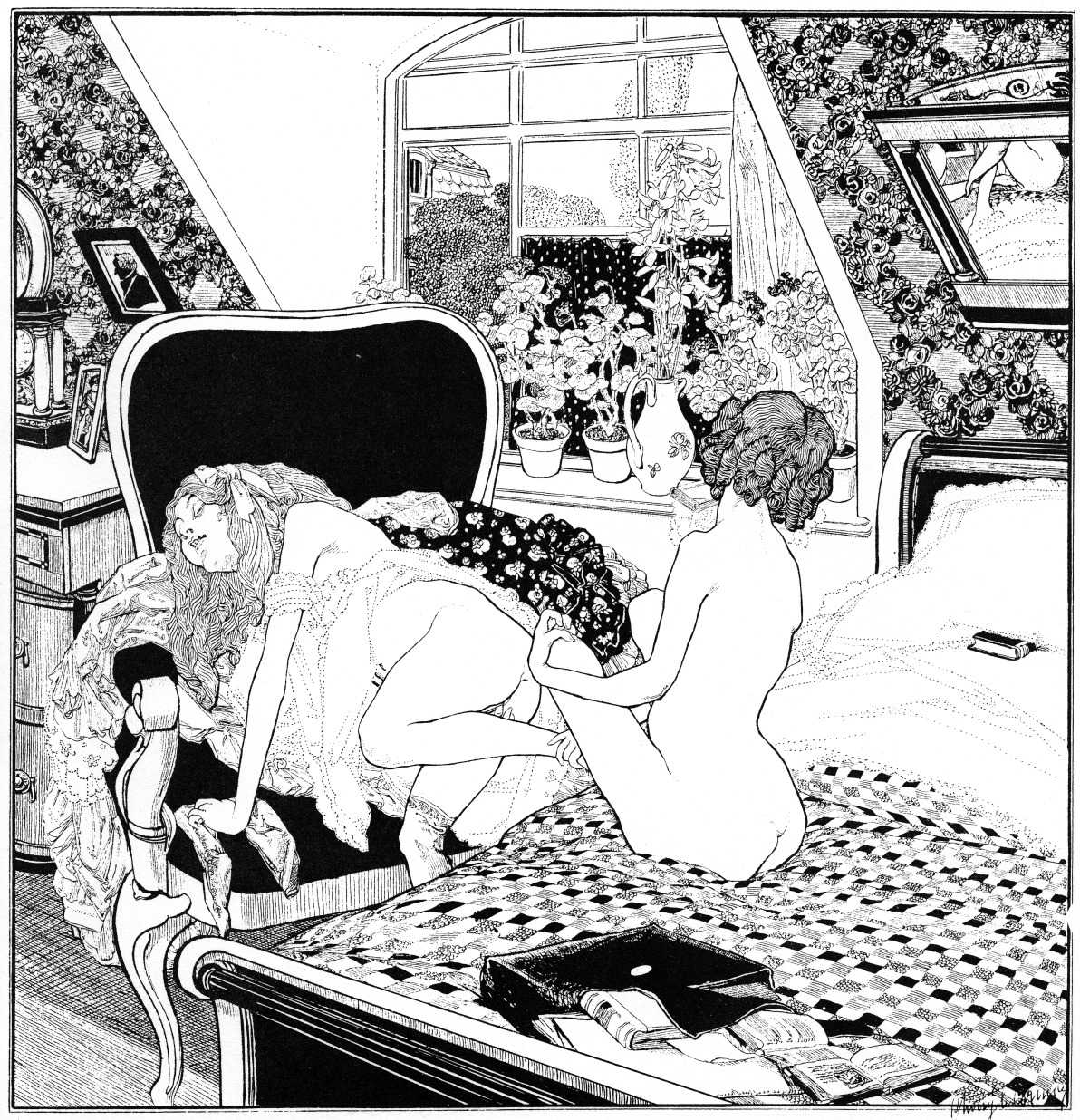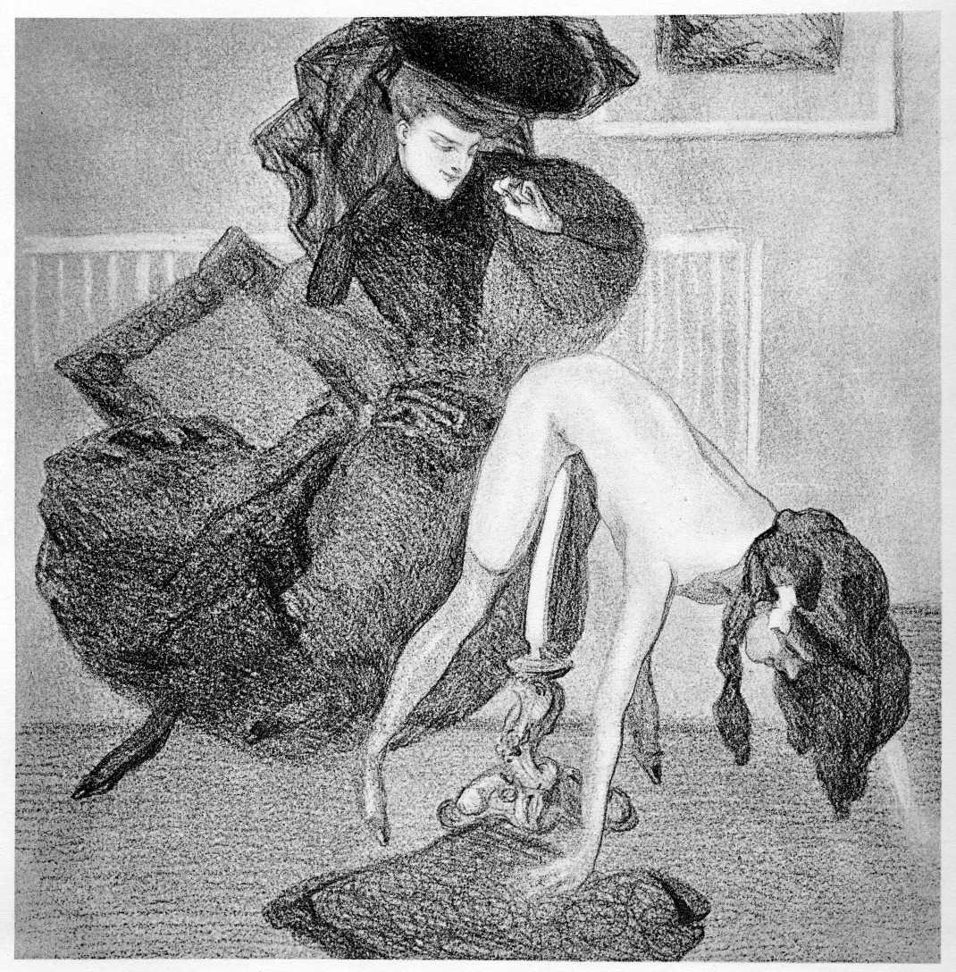 In 1897 Franz turned his back on Vienna and moved to Munich, at that time the art metropolis of the German Reich. The city was one of the main centres of German naturalism; it was also home to important illustrated book publishers including Albert Langen and Georg Müller. He studied at Adolf Hölzel’s academy in Dachau and Heinrich Knirr’s school in Munich, where Paul Klee was also trained. In 1904 Bayros mounted a successful exhibition in Munich, which resulted in several book illustration commissions, including Abbé Prévost’s Manon Lescaut for Insel Verlag and Diderot’s Die geschwätzigen Kleinode (Les bijoux indiscrets) for Georg Müller. But is was his detailed pen and ink drawings on erotic themes, clearly inspired by Aubrey Beardsley and Bayros’s extensive study of French rococo, that brought him the most attention and income. The privately published Fleurettens Purpurschnecke in 1905 was the first of several portfolios produced ‘for the discerning connoisseur’, a style and method of publication which would eventually lead to his Erzählungen am Toilettentische being censored and banned in 1911, and Bayros having to leave Munich for a while.
