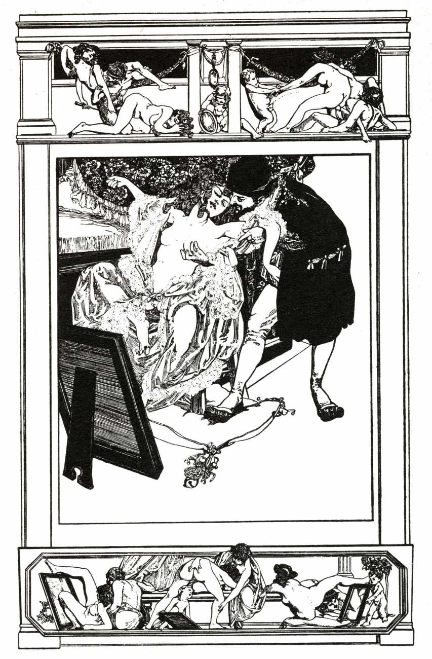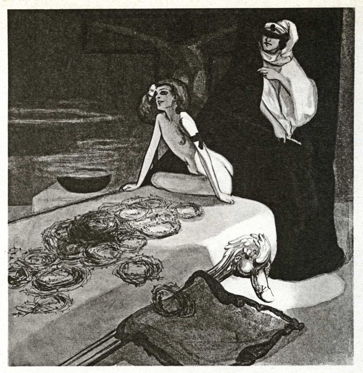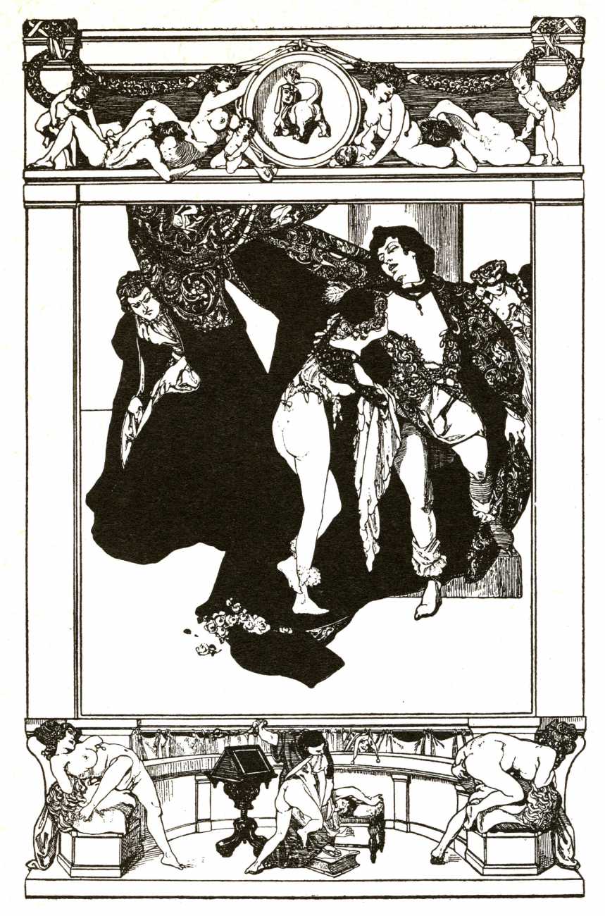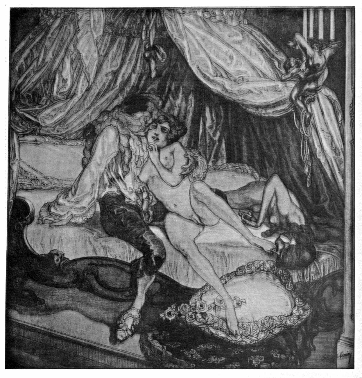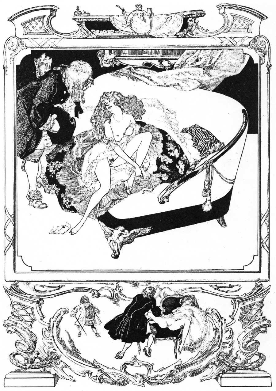 In 1897 Franz turned his back on Vienna and moved to Munich, at that time the art metropolis of the German Reich. The city was one of the main centres of German naturalism; it was also home to important illustrated book publishers including Albert Langen and Georg Müller. He studied at Adolf Hölzel’s academy in Dachau and Heinrich Knirr’s school in Munich, where Paul Klee was also trained. In 1904 Bayros mounted a successful exhibition in Munich, which resulted in several book illustration commissions, including Abbé Prévost’s Manon Lescaut for Insel Verlag and Diderot’s Die geschwätzigen Kleinode (Les bijoux indiscrets) for Georg Müller. But is was his detailed pen and ink drawings on erotic themes, clearly inspired by Aubrey Beardsley and Bayros’s extensive study of French rococo, that brought him the most attention and income. The privately published Fleurettens Purpurschnecke in 1905 was the first of several portfolios produced ‘for the discerning connoisseur’, a style and method of publication which would eventually lead to his Erzählungen am Toilettentische being censored and banned in 1911, and Bayros having to leave Munich for a while.