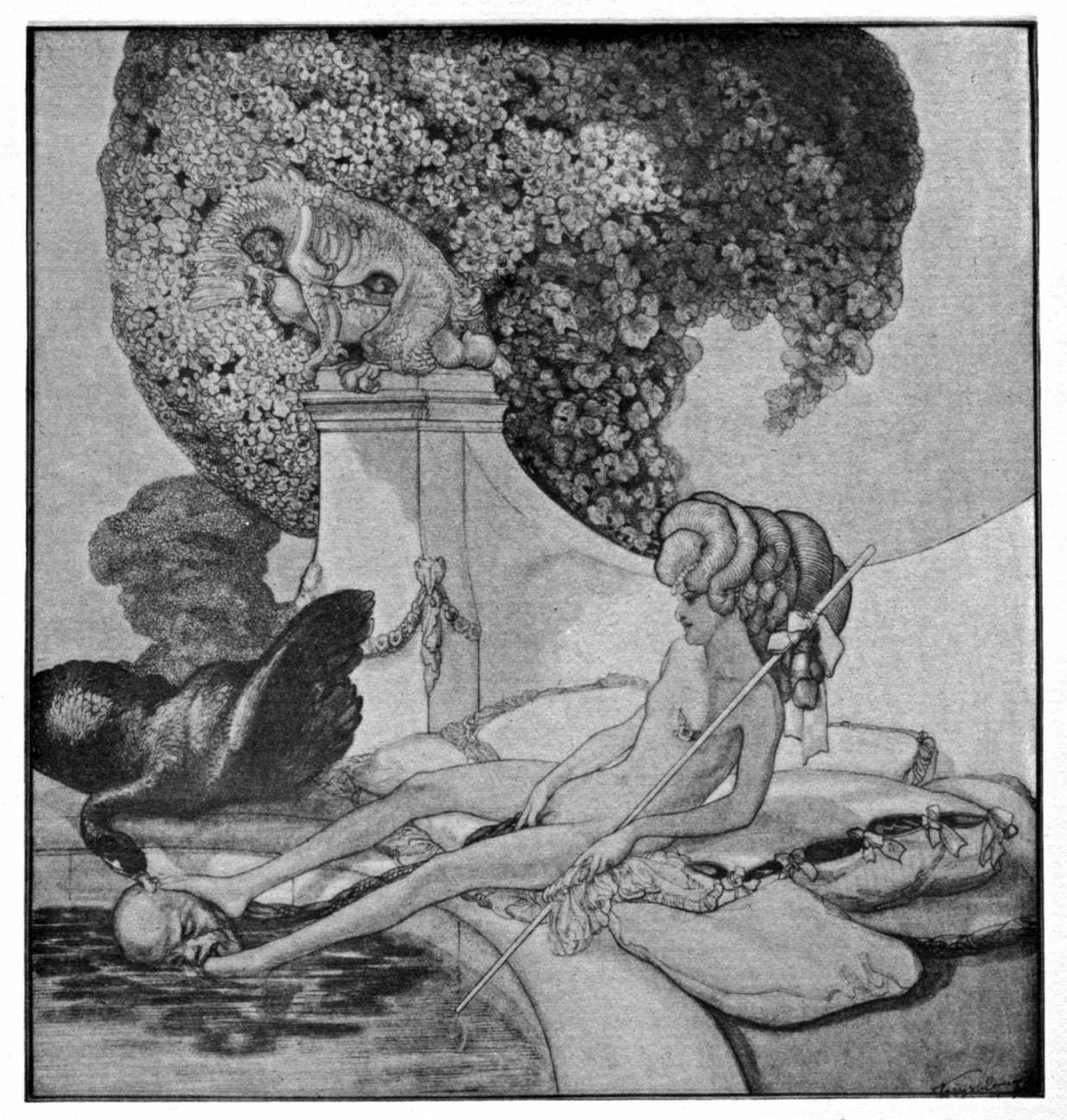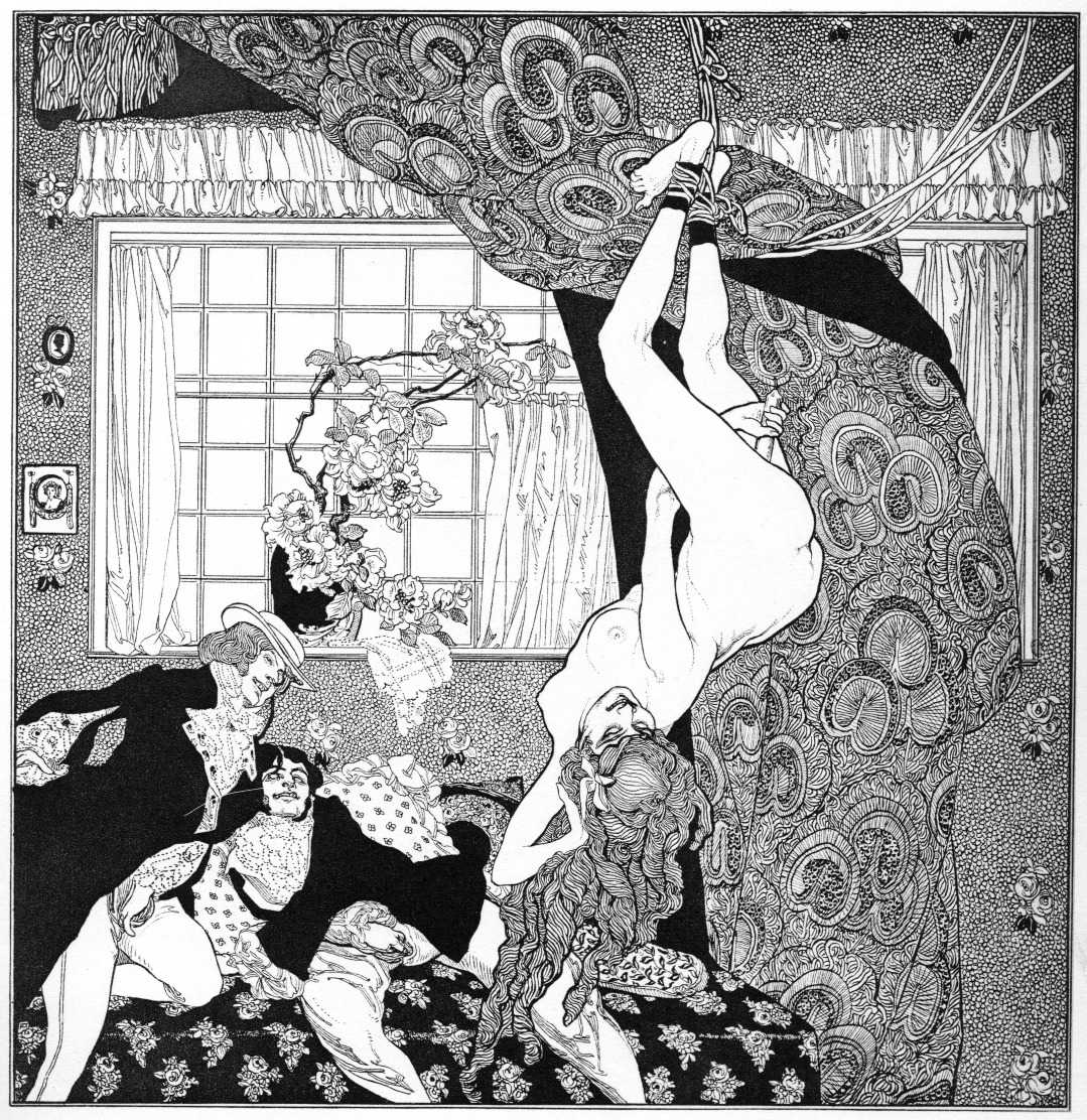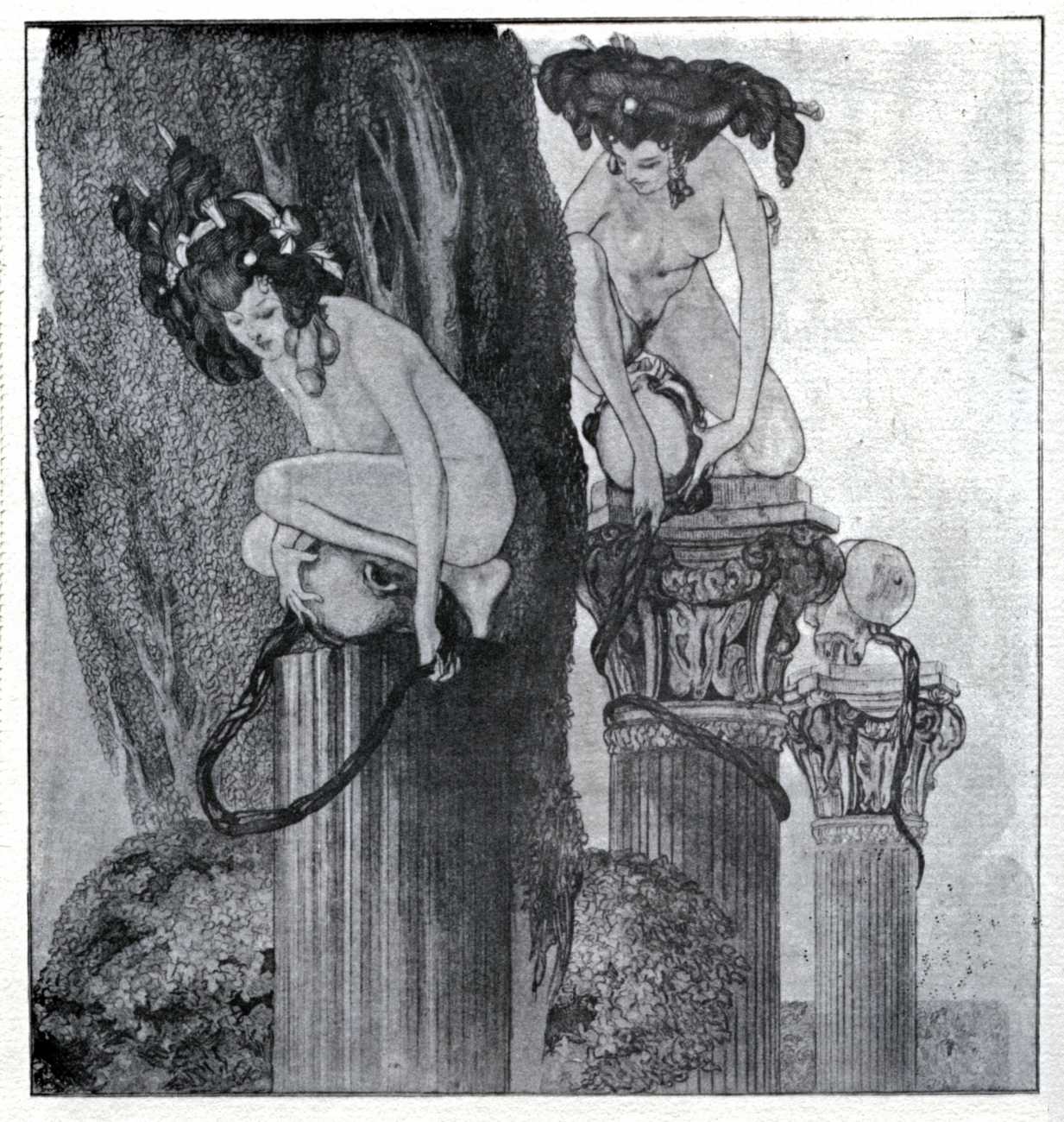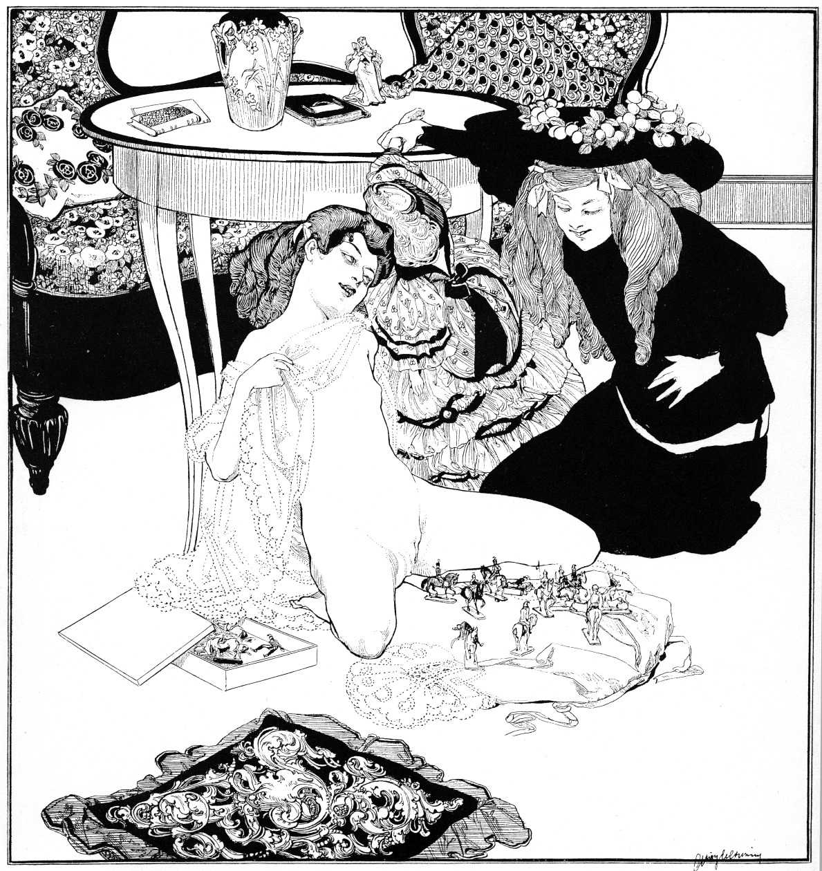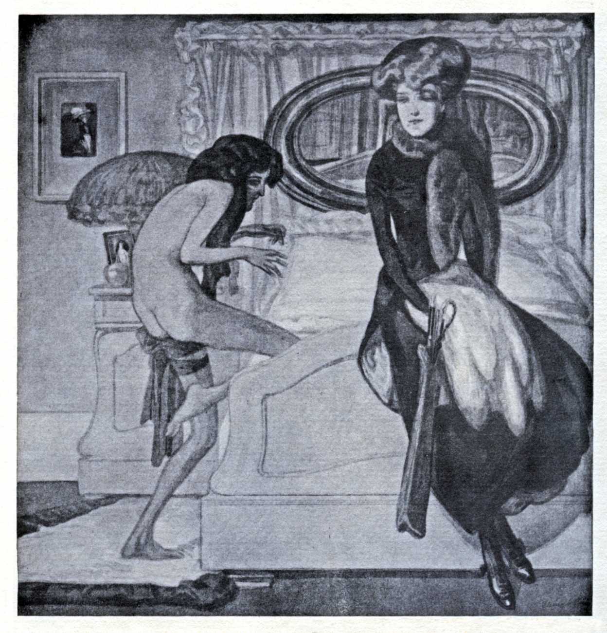 In 1897 Franz turned his back on Vienna and moved to Munich, at that time the art metropolis of the German Reich. The city was one of the main centres of German naturalism; it was also home to important illustrated book publishers including Albert Langen and Georg Müller. He studied at Adolf Hölzel’s academy in Dachau and Heinrich Knirr’s school in Munich, where Paul Klee was also trained. In 1904 Bayros mounted a successful exhibition in Munich, which resulted in several book illustration commissions, including Abbé Prévost’s Manon Lescaut for Insel Verlag and Diderot’s Die geschwätzigen Kleinode (Les bijoux indiscrets) for Georg Müller. But is was his detailed pen and ink drawings on erotic themes, clearly inspired by Aubrey Beardsley and Bayros’s extensive study of French rococo, that brought him the most attention and income. The privately published Fleurettens Purpurschnecke in 1905 was the first of several portfolios produced ‘for the discerning connoisseur’, a style and method of publication which would eventually lead to his Erzählungen am Toilettentische being censored and banned in 1911, and Bayros having to leave Munich for a while.