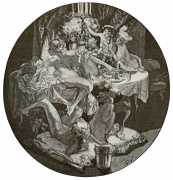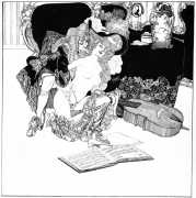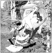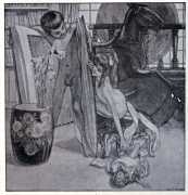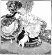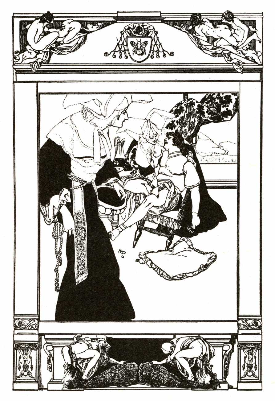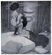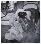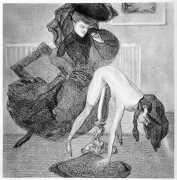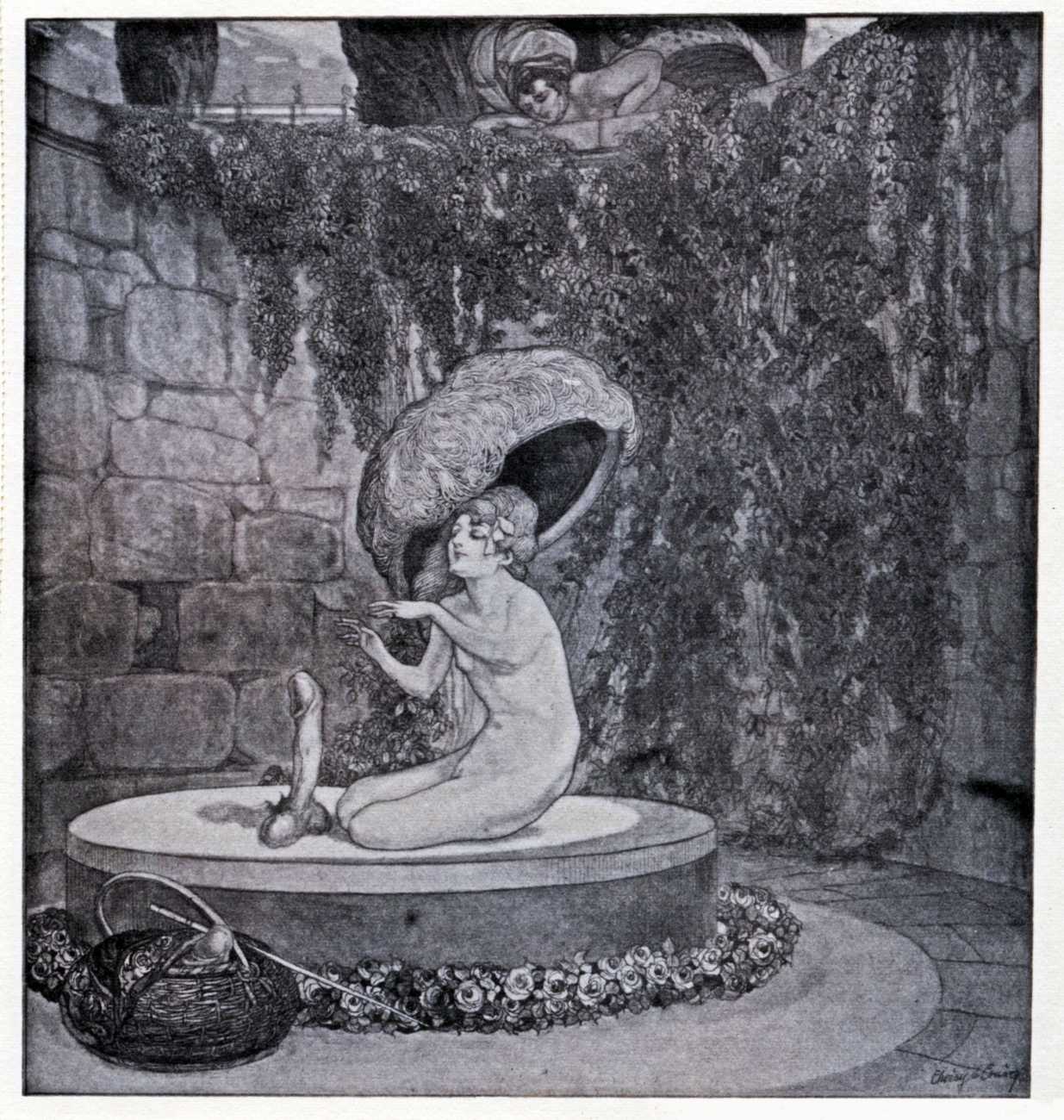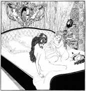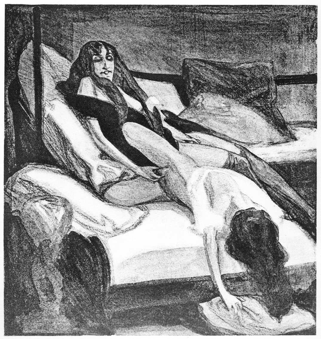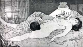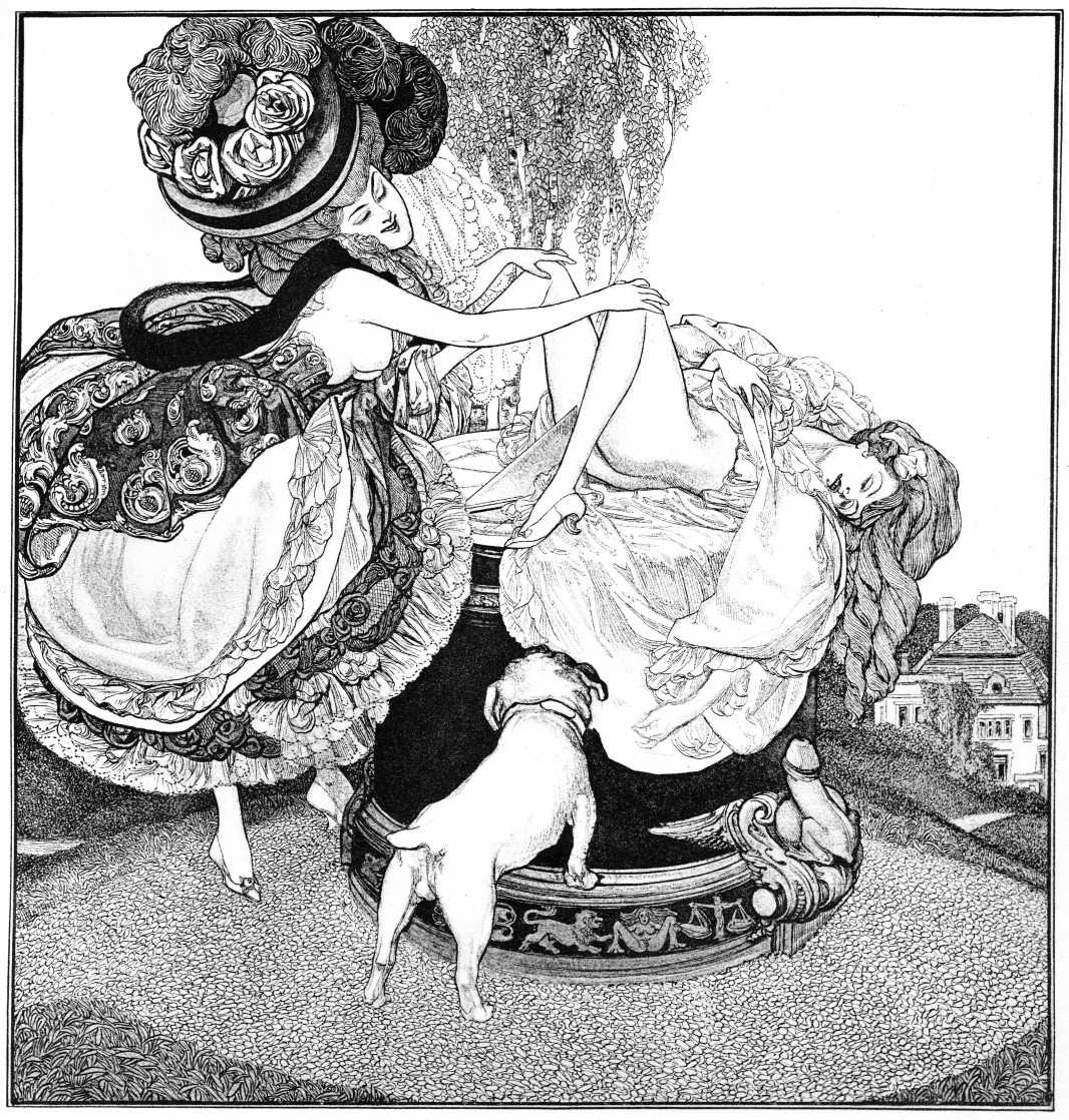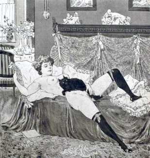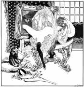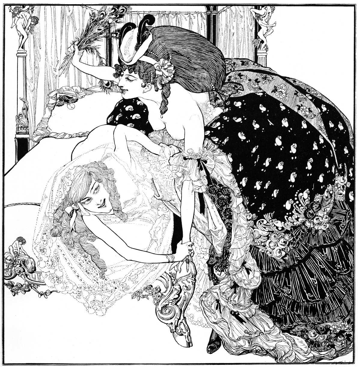 In 1897 Franz turned his back on Vienna and moved to Munich, at that time the art metropolis of the German Reich. The city was one of the main centres of German naturalism; it was also home to important illustrated book publishers including Albert Langen and Georg Müller. He studied at Adolf Hölzel’s academy in Dachau and Heinrich Knirr’s school in Munich, where Paul Klee was also trained. In 1904 Bayros mounted a successful exhibition in Munich, which resulted in several book illustration commissions, including Abbé Prévost’s Manon Lescaut for Insel Verlag and Diderot’s Die geschwätzigen Kleinode (Les bijoux indiscrets) for Georg Müller. But is was his detailed pen and ink drawings on erotic themes, clearly inspired by Aubrey Beardsley and Bayros’s extensive study of French rococo, that brought him the most attention and income. The privately published Fleurettens Purpurschnecke in 1905 was the first of several portfolios produced ‘for the discerning connoisseur’, a style and method of publication which would eventually lead to his Erzählungen am Toilettentische being censored and banned in 1911, and Bayros having to leave Munich for a while.