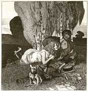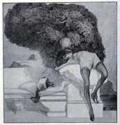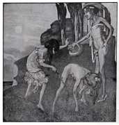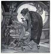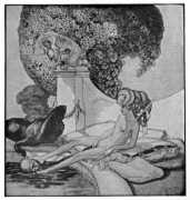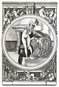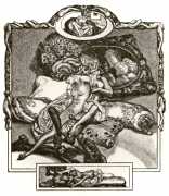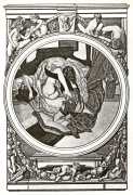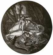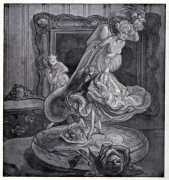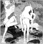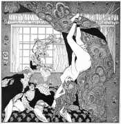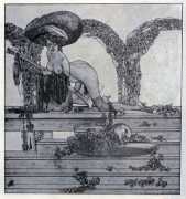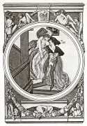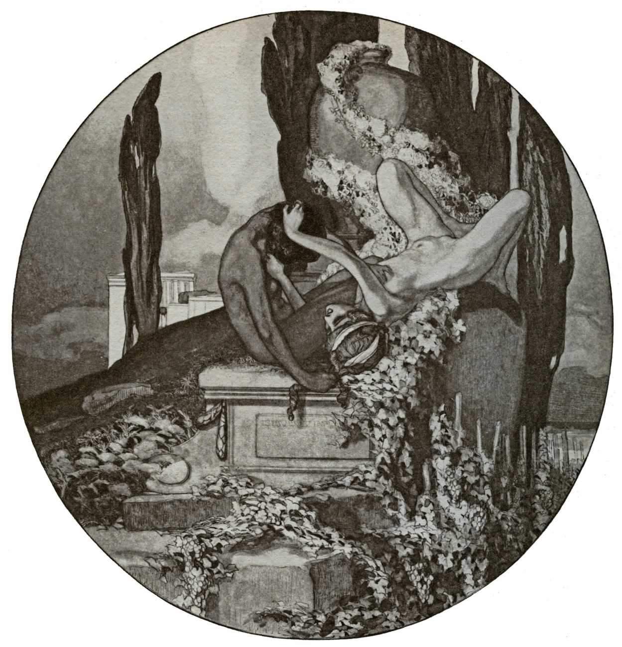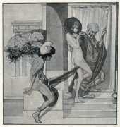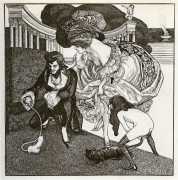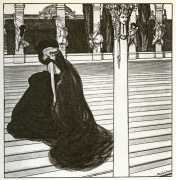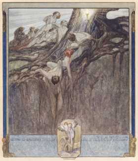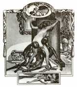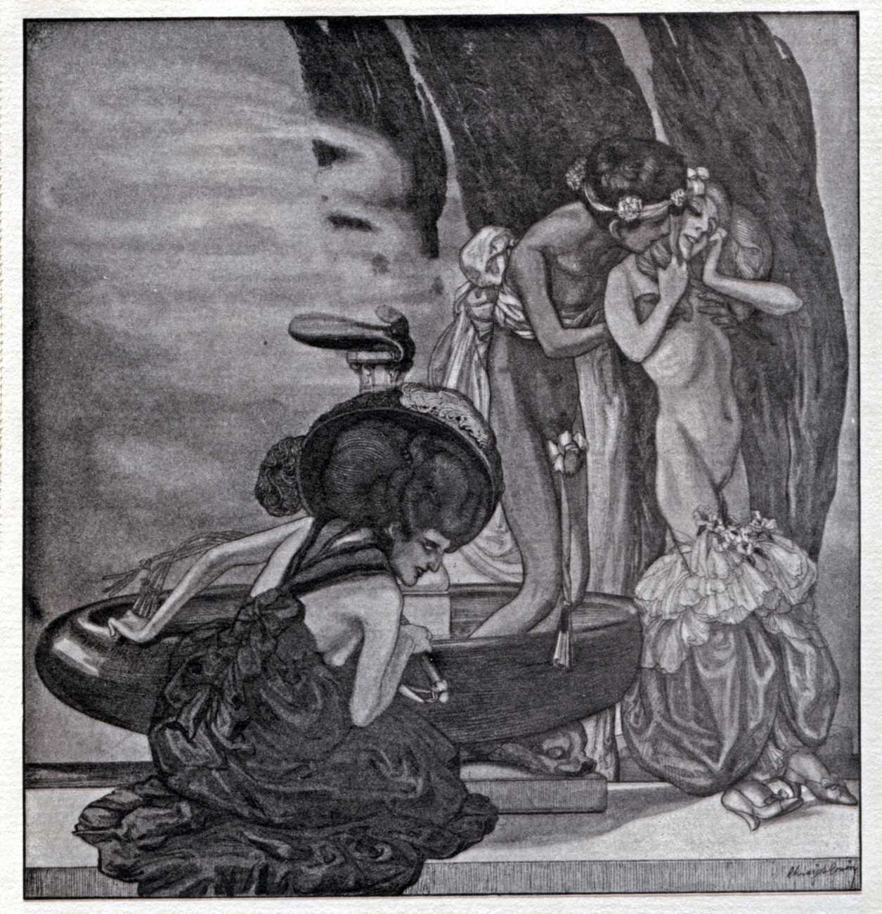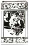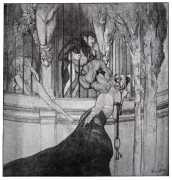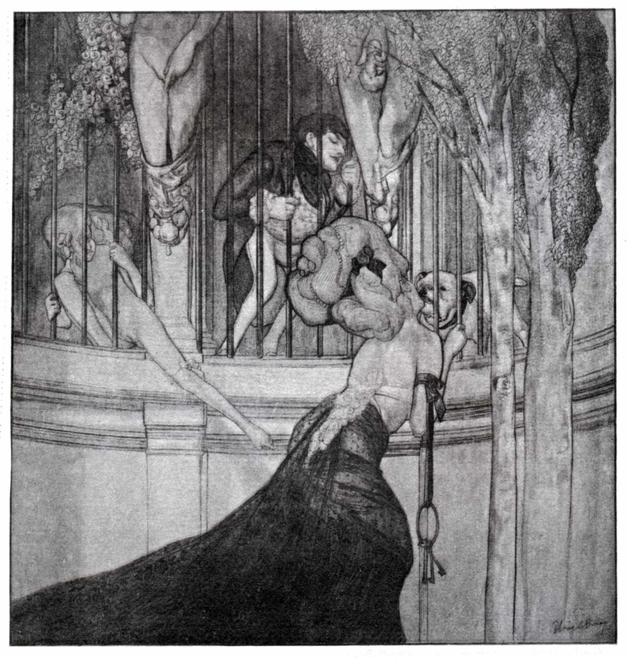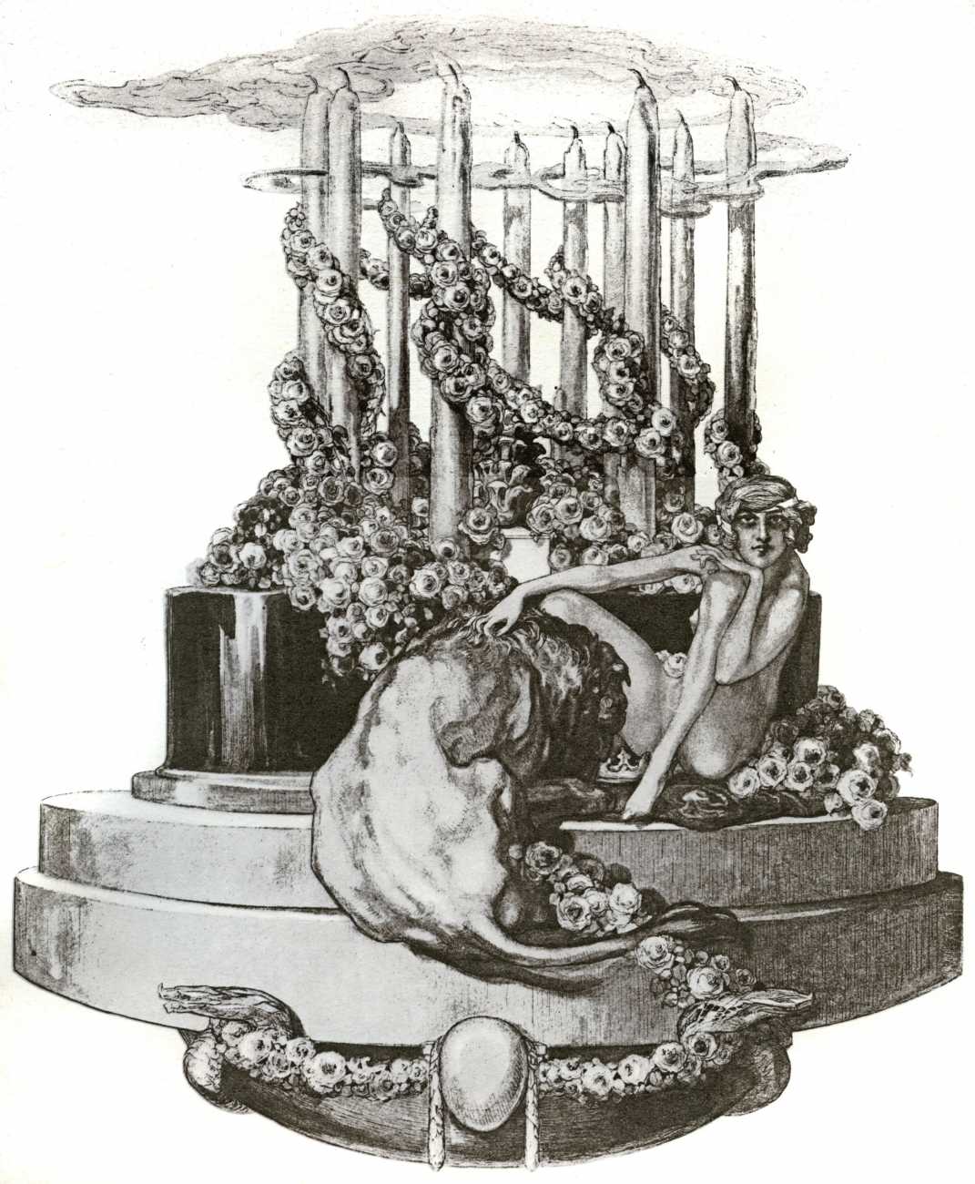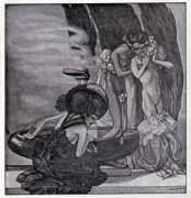 The outbreak of war in Europe in 1914 brought his publishing work to an abrupt end, and after the war ended commissions for book and magazine illustrations, bookplates and posters were slow to materialise, though his reputation slowly recovered. It was the 600th anniversary of Dante’s death in 1921 that inspired him to create what was to be his true masterpiece, sixty large watercolour illustrations for Die Göttliche Komödie (The Divine Comedy), published by the Vienna publisher Amalthea in three volumes. The edition was highly successful, but the detailed work on Dante and the devaluation of the Austrian currency took its toll on Bayros’s health, and he suffered a fatal cerebral haemorrhage in April 1924.