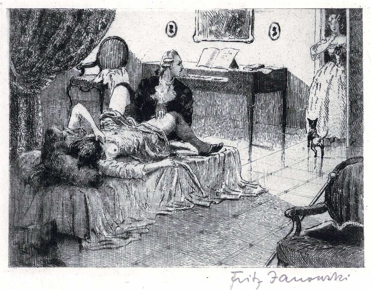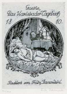 Very little of his work has survived, but from what we know he was an accomplished painter and engraver. His work was exhibited at the Grosse Berliner Kunstausstellung in 1914, and after the First World War in the Internationale Ausstellung für Buchgewerbe und Graphik in 1924. In 1910 he produced a portfolio of etchings to commemorate the centenary of the publication of Goethe’s Das Karlsbader Tagebuch (The Karlsbad Diary).
