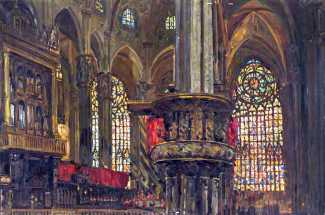 He painted mostly landscapes and interiors; this painting of the interior of the Cathedral in Milan from the mid-1920s suggests that he travelled widely in southern Europe.