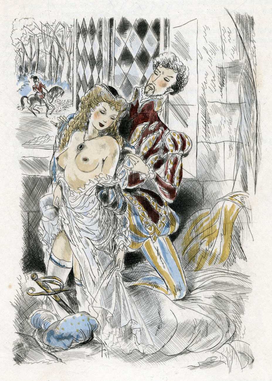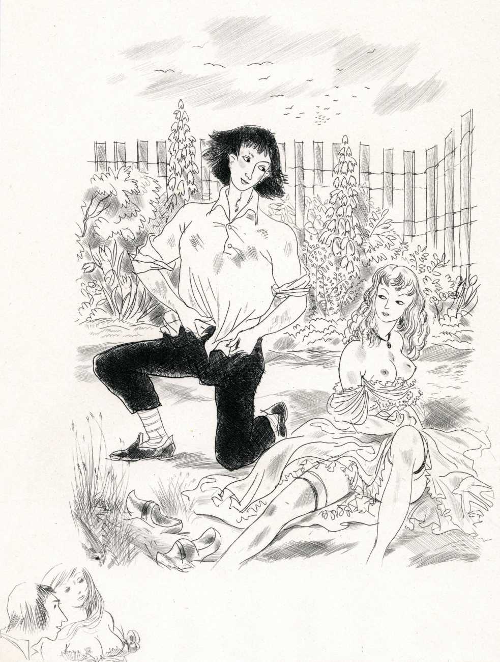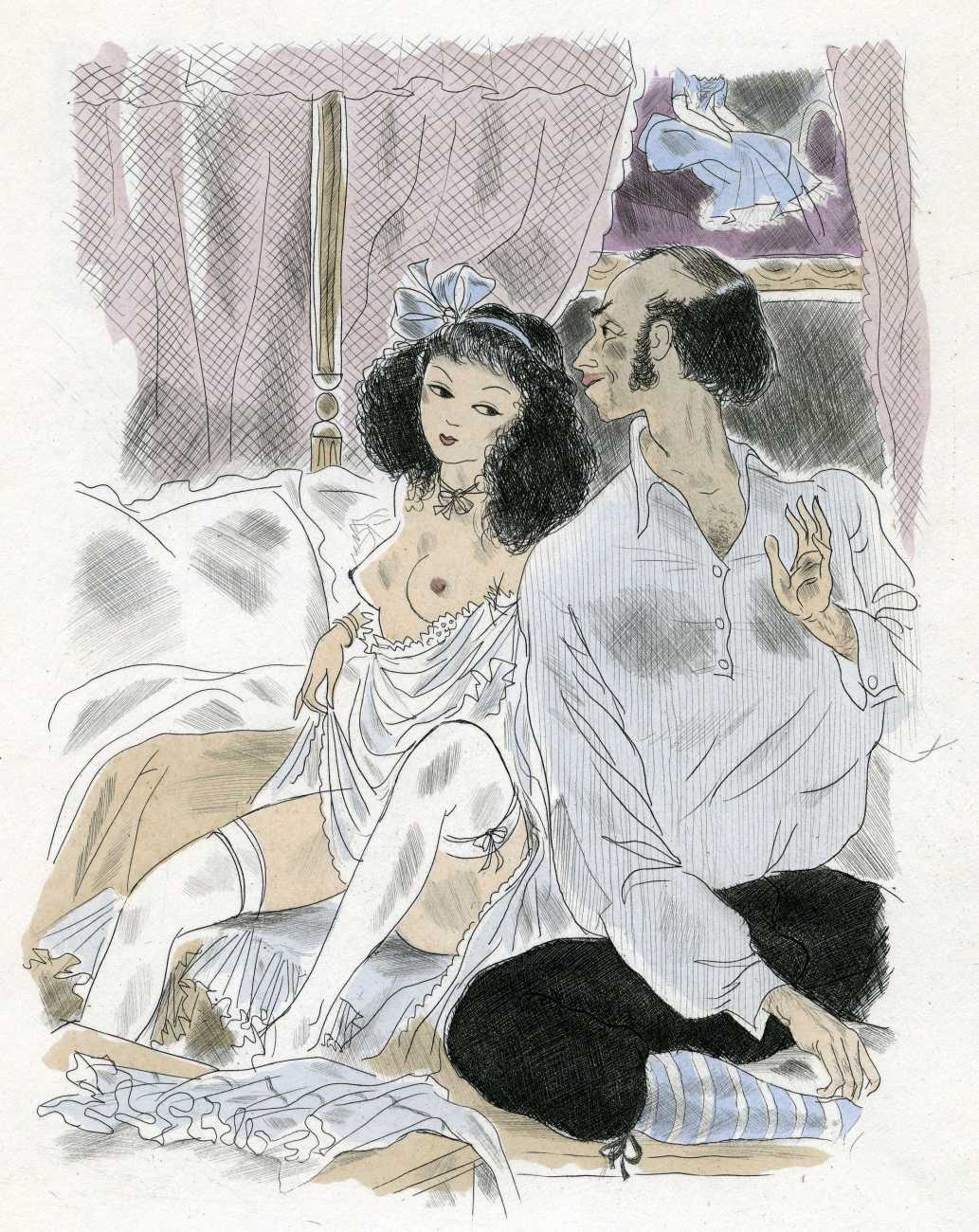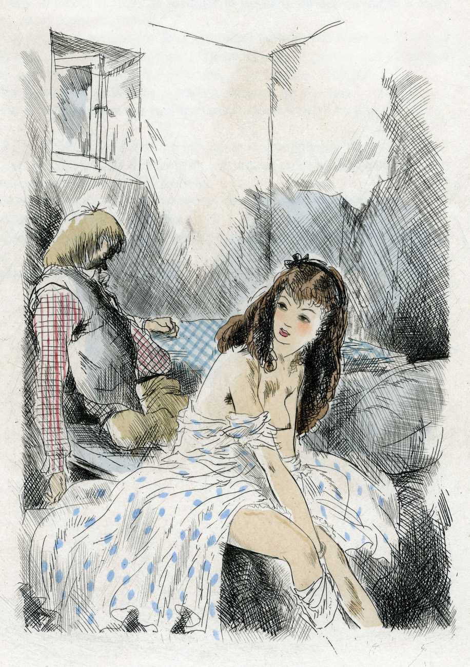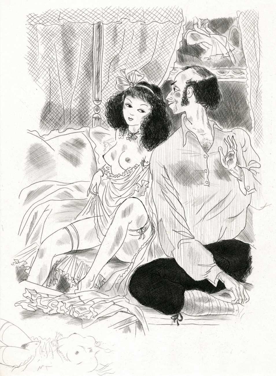 Now known as a reliable and tasteful erotic artist, commissions followed for Mac Orlan’s Les dés pipés, ou Fanny Hill in 1951, Tallemant des Reaux’s Historiettes galantes in 1952, La vie privée du Maréchal duc de Richelieu in 1953, Louÿ’s Chansons de Bilitis in 1954, and Rabelais’ Gargantua in 1956.