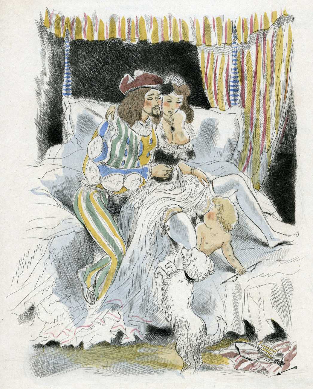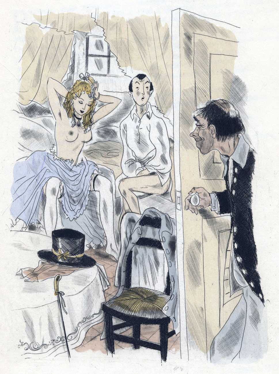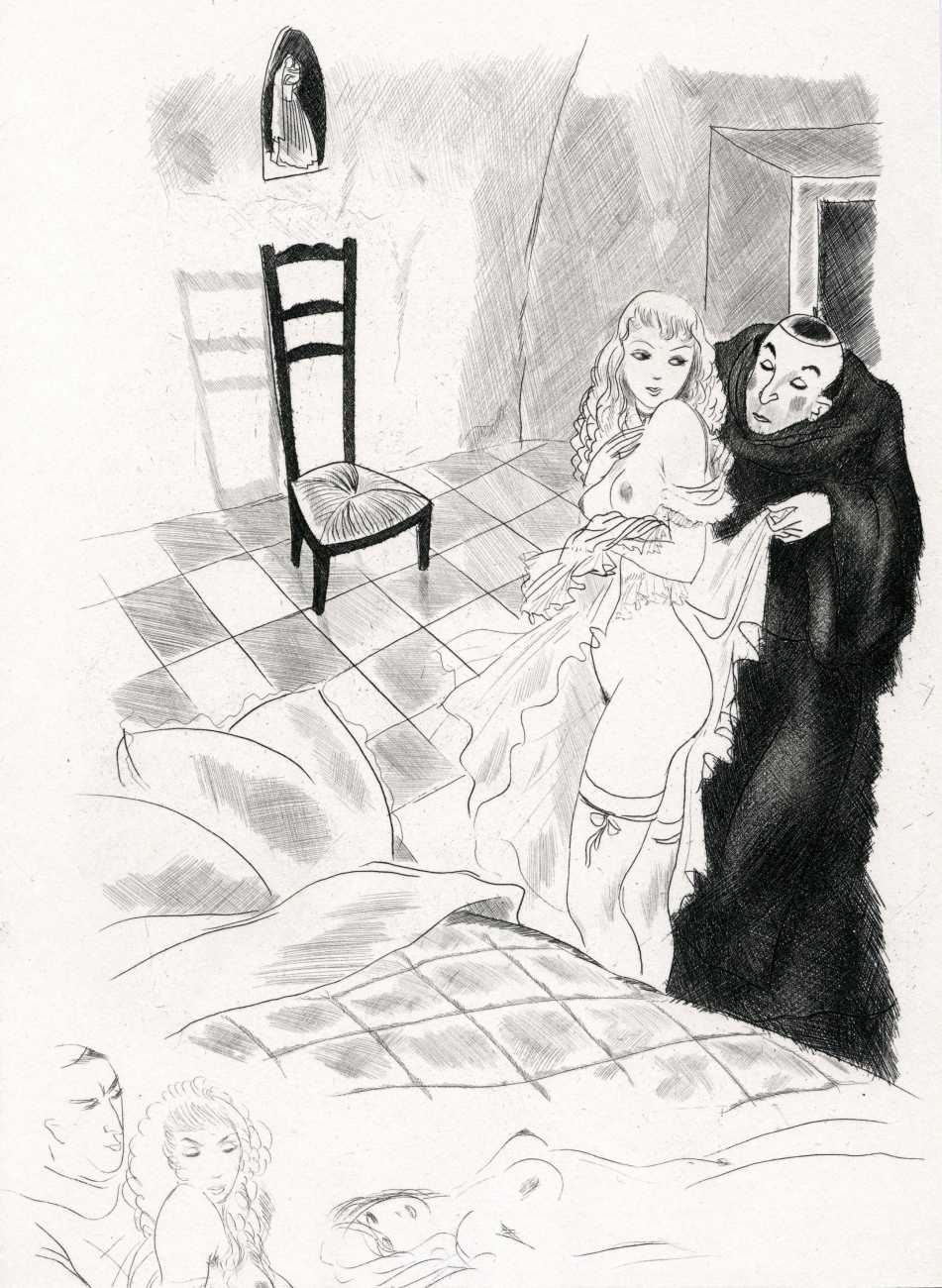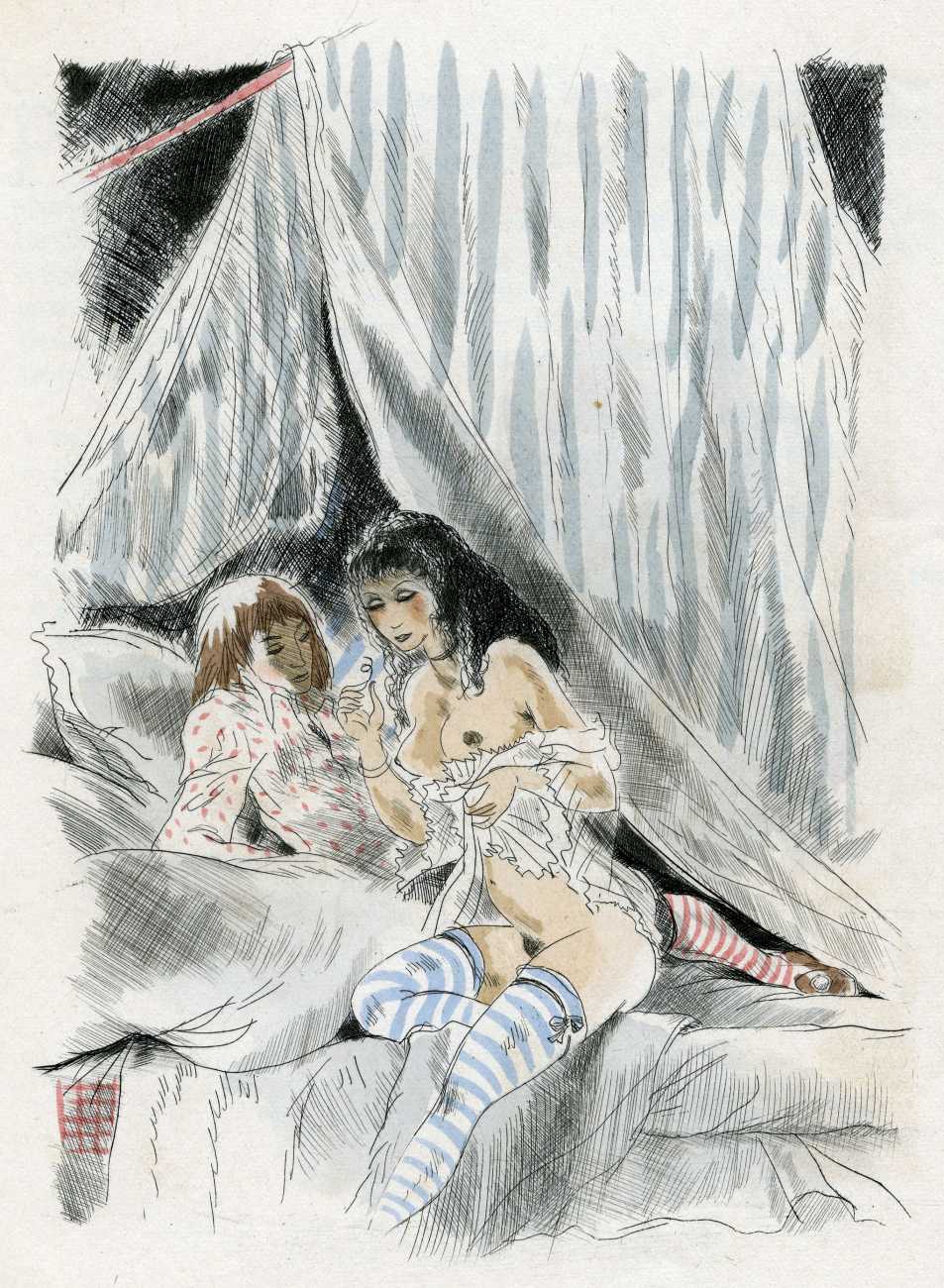 Now known as a reliable and tasteful erotic artist, commissions followed for Mac Orlan’s Les dés pipés, ou Fanny Hill in 1951, Tallemant des Reaux’s Historiettes galantes in 1952, La vie privée du Maréchal duc de Richelieu in 1953, Louÿ’s Chansons de Bilitis in 1954, and Rabelais’ Gargantua in 1956.
