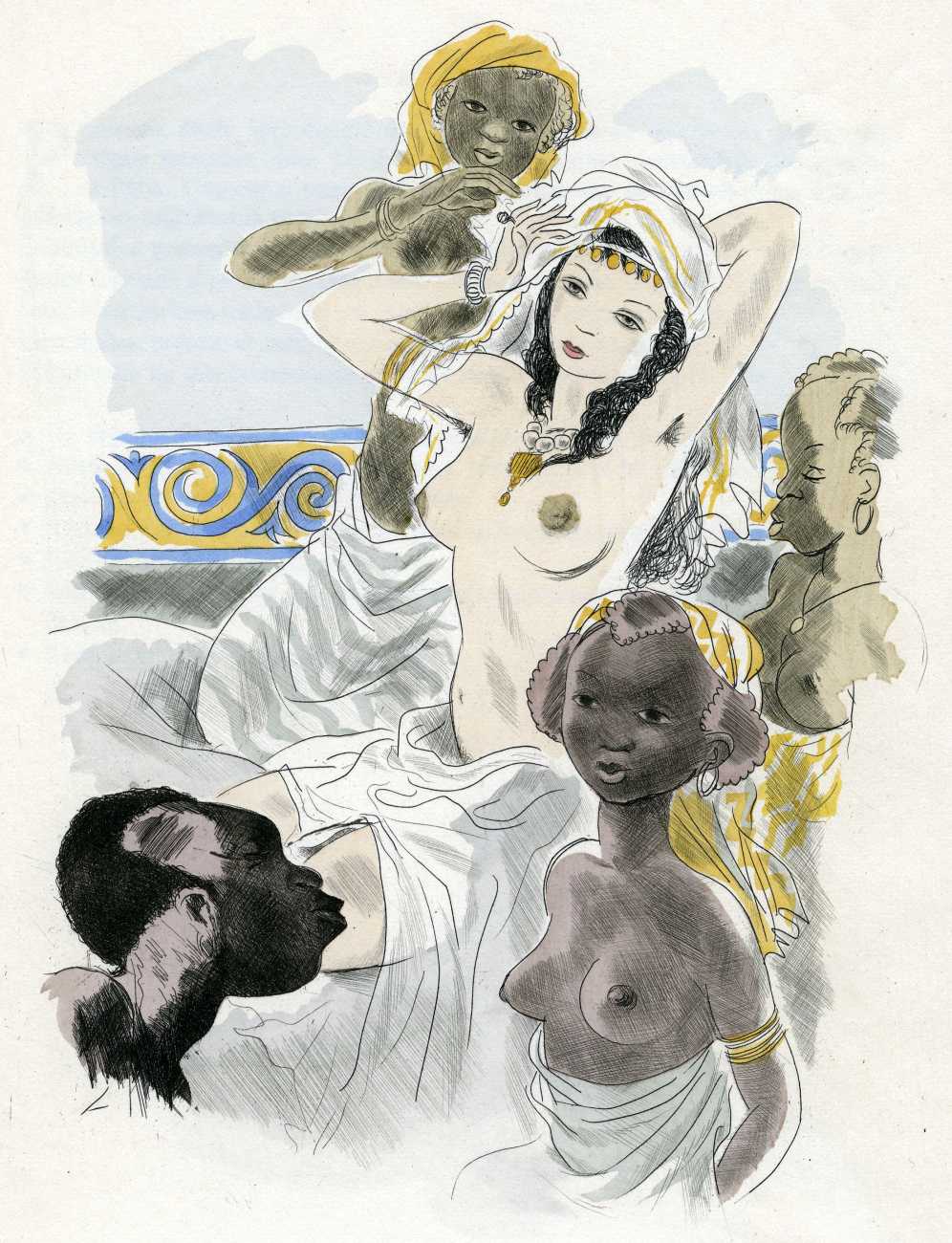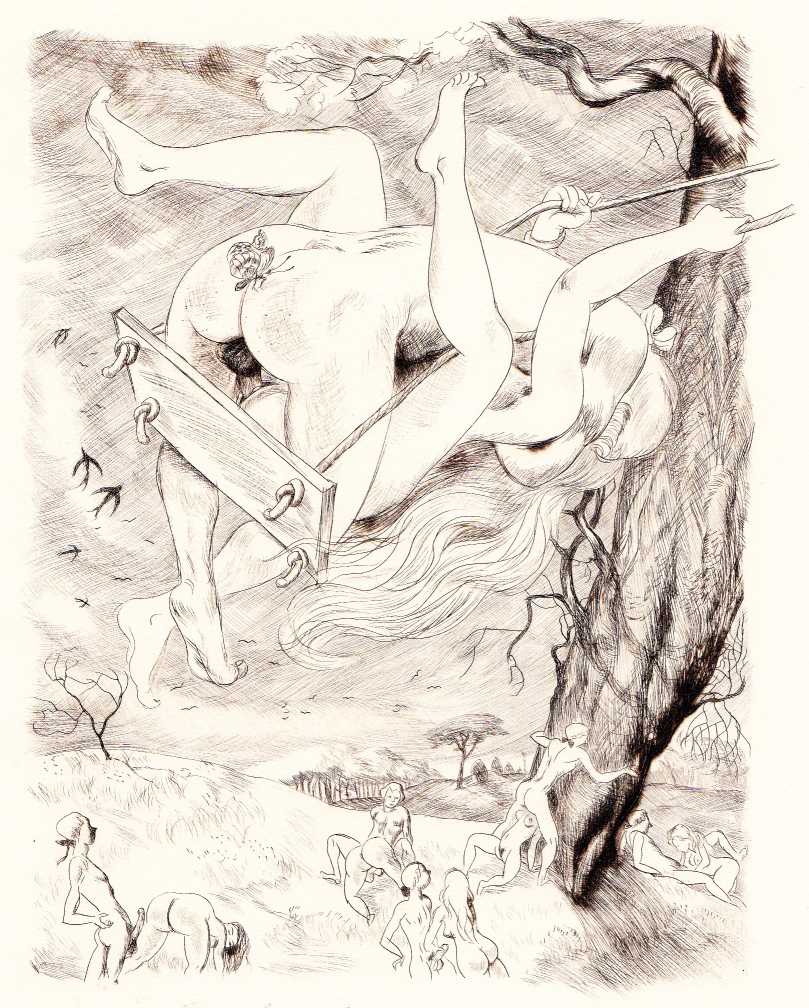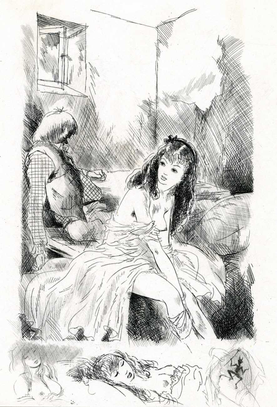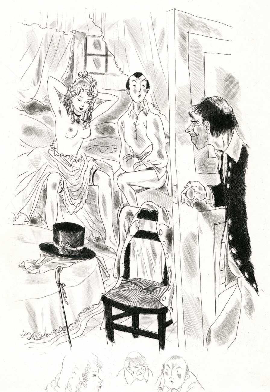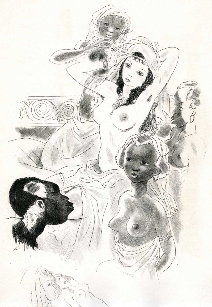 Now known as a reliable and tasteful erotic artist, commissions followed for Mac Orlan’s Les dés pipés, ou Fanny Hill in 1951, Tallemant des Reaux’s Historiettes galantes in 1952, La vie privée du Maréchal duc de Richelieu in 1953, Louÿ’s Chansons de Bilitis in 1954, and Rabelais’ Gargantua in 1956.