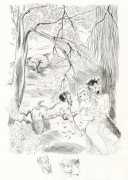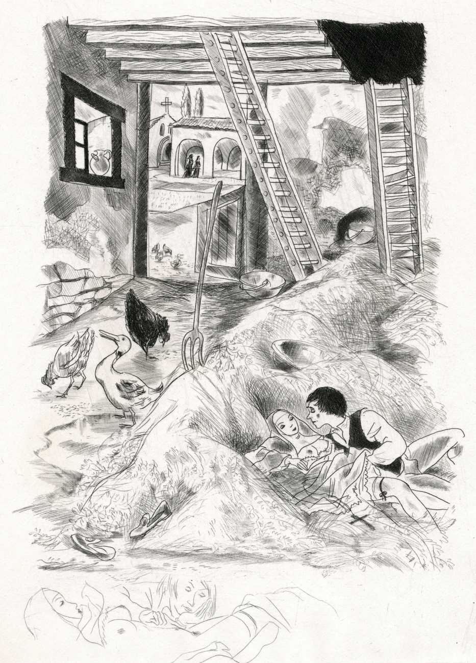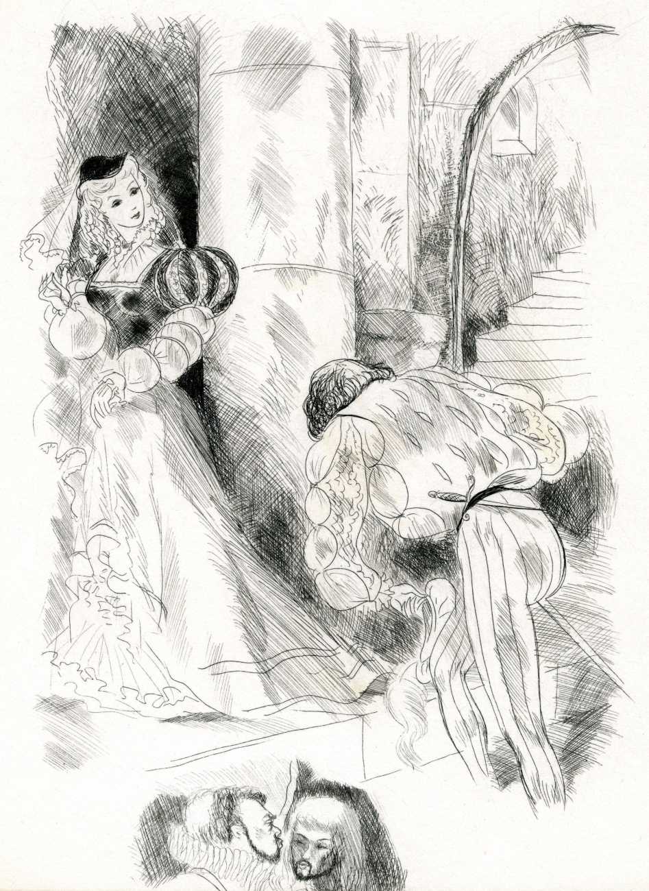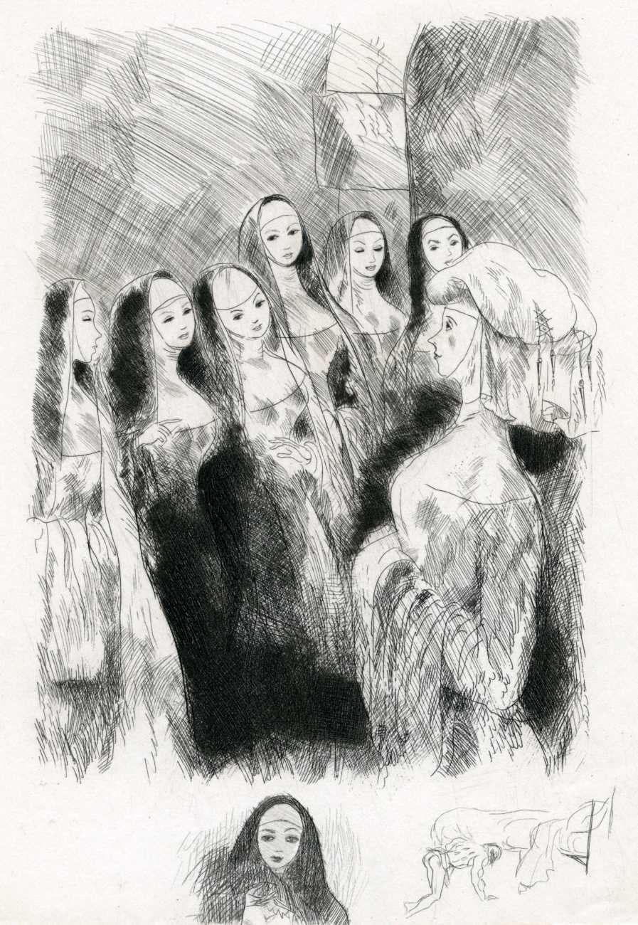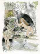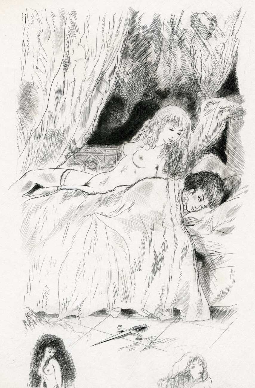 Now known as a reliable and tasteful erotic artist, commissions followed for Mac Orlan’s Les dés pipés, ou Fanny Hill in 1951, Tallemant des Reaux’s Historiettes galantes in 1952, La vie privée du Maréchal duc de Richelieu in 1953, Louÿ’s Chansons de Bilitis in 1954, and Rabelais’ Gargantua in 1956.