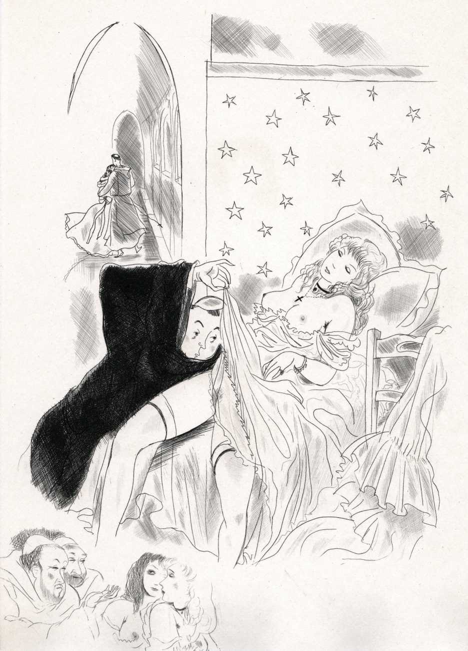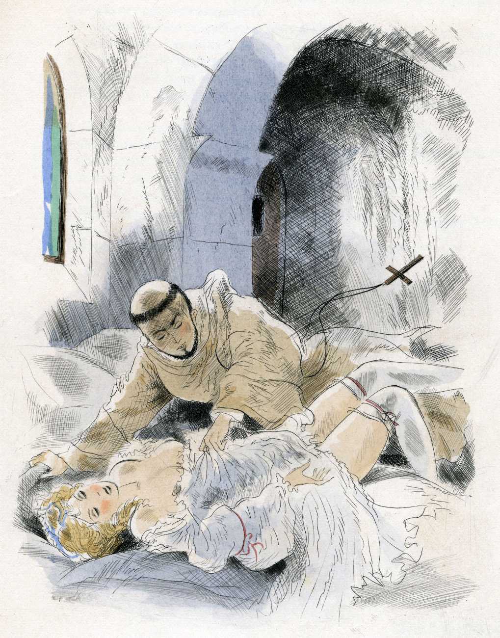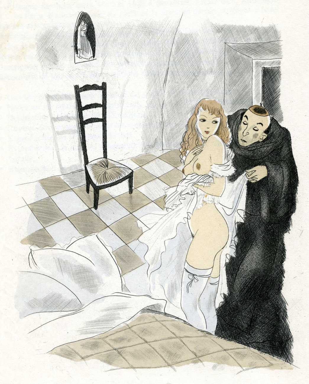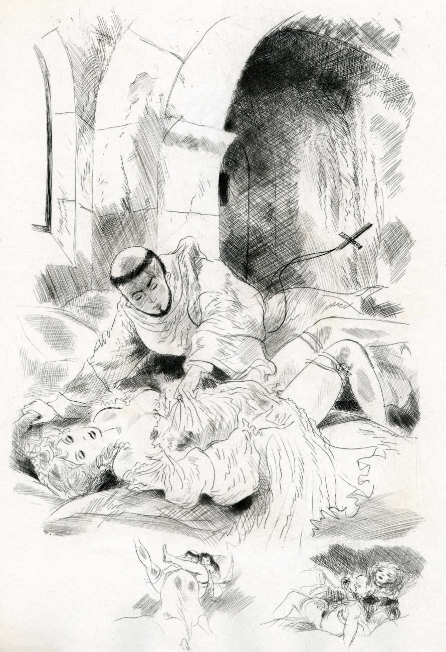 Illustrated editions of Maupassant and Balzac, Zola and Hugo, Dickens and Flaubert followed in rapid sucession, but it was in 1950 that he was first commissioned to illustrate a specifically erotic title – Sade’s Justine, for Editions de la Vieille France. The Justine illustrations were fairly tame, but when Au Carquois d’Argent commissioned artwork for a limited edition of Mirabeau’s L’Adam lascif, Barret finally engaged his skills and imagination to produce what are arguably some of his best and most explicit illustrations.