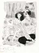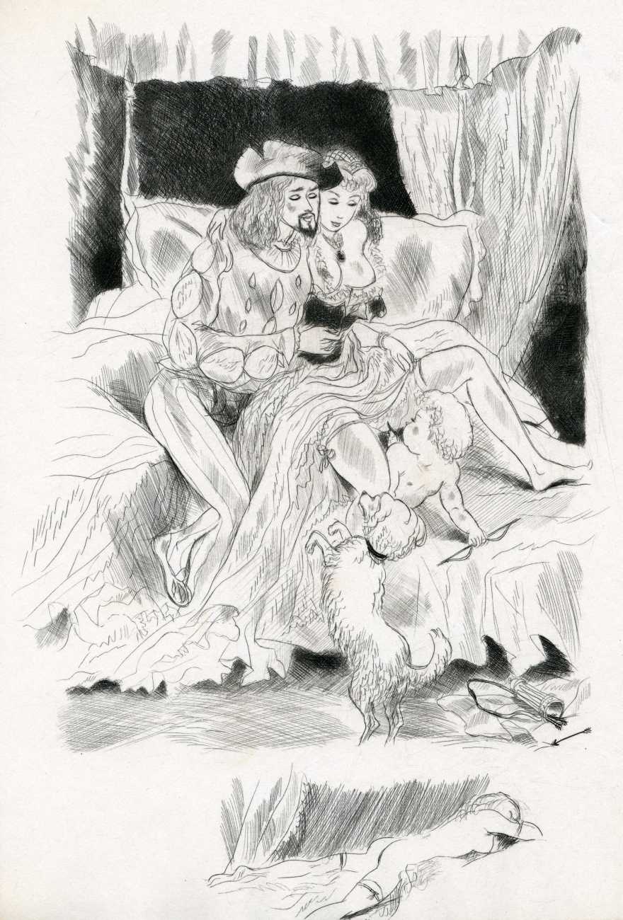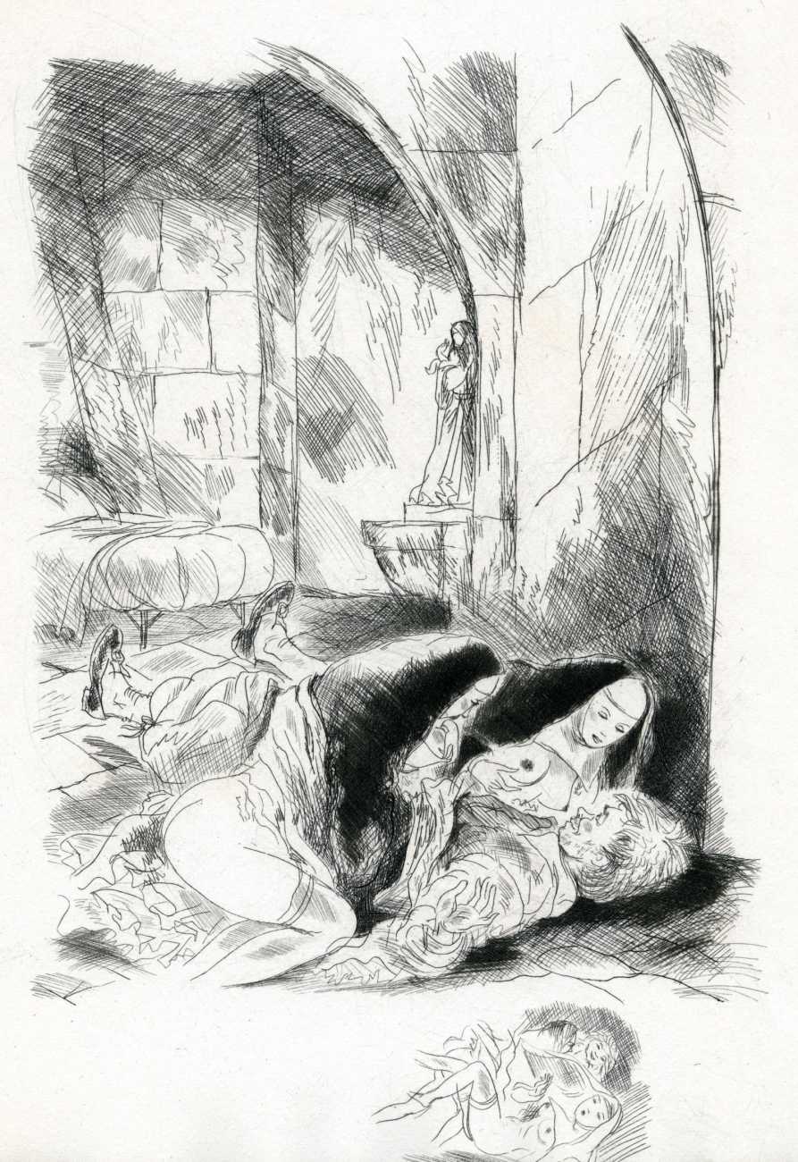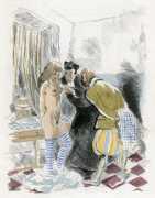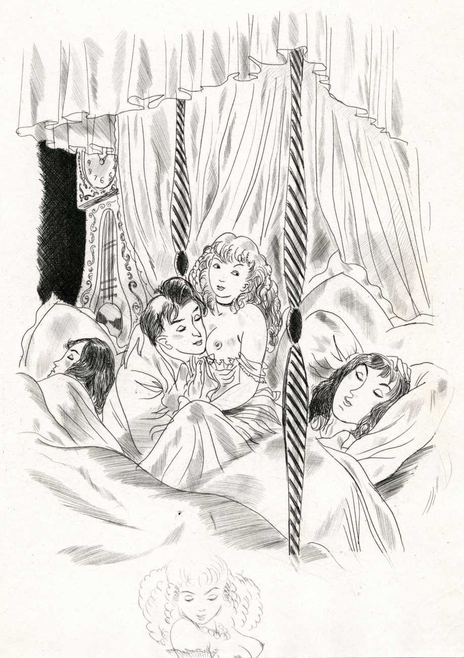 Illustrated editions of Maupassant and Balzac, Zola and Hugo, Dickens and Flaubert followed in rapid sucession, but it was in 1950 that he was first commissioned to illustrate a specifically erotic title – Sade’s Justine, for Editions de la Vieille France. The Justine illustrations were fairly tame, but when Au Carquois d’Argent commissioned artwork for a limited edition of Mirabeau’s L’Adam lascif, Barret finally engaged his skills and imagination to produce what are arguably some of his best and most explicit illustrations.