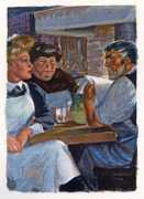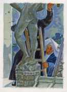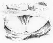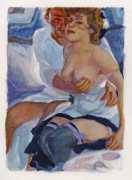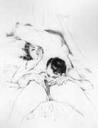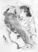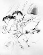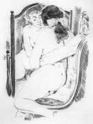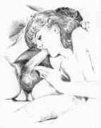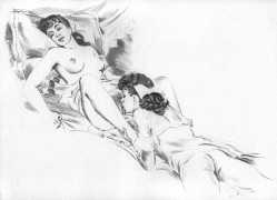 Long before his career in futuristic art, however, his colourful style appeared in the illustrations to a couple of period erotic classics, Le journal d’une femme de chambre (A Chambermaid’s Diary) and Les égarements de Julie (Julie’s Distractions), then nearly a decade later he appears again as a very competent creator of detailed pencil drawings for editions of Nous deux (Us Two) and Clayton’s College, both of which portfolios were reproduced in the late 1990s by the Erotic Print Society.