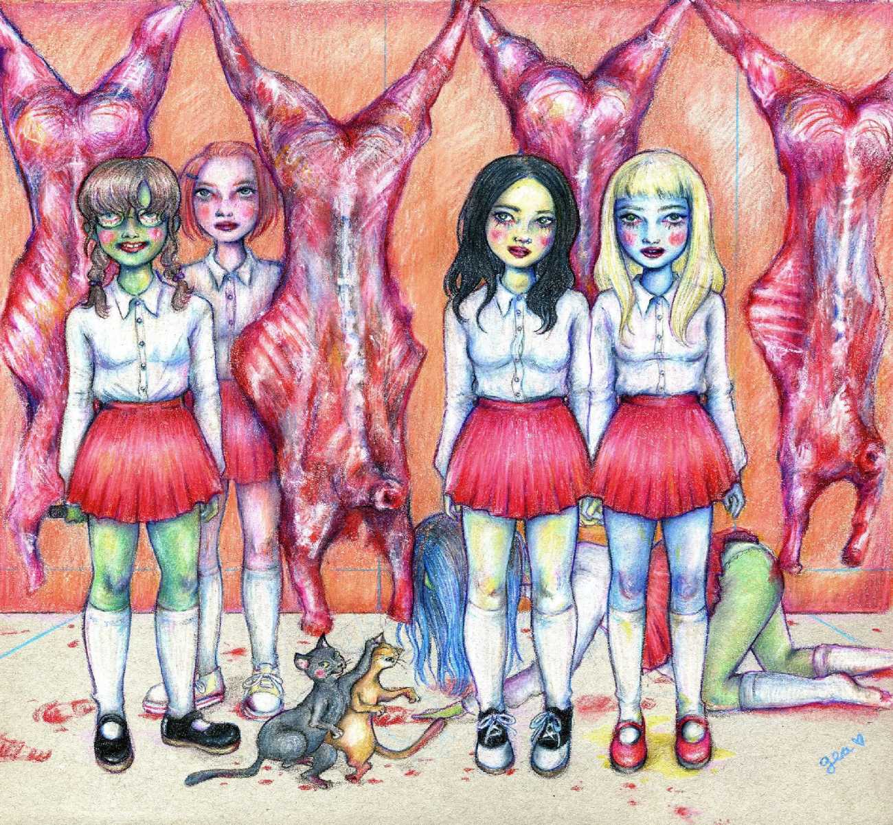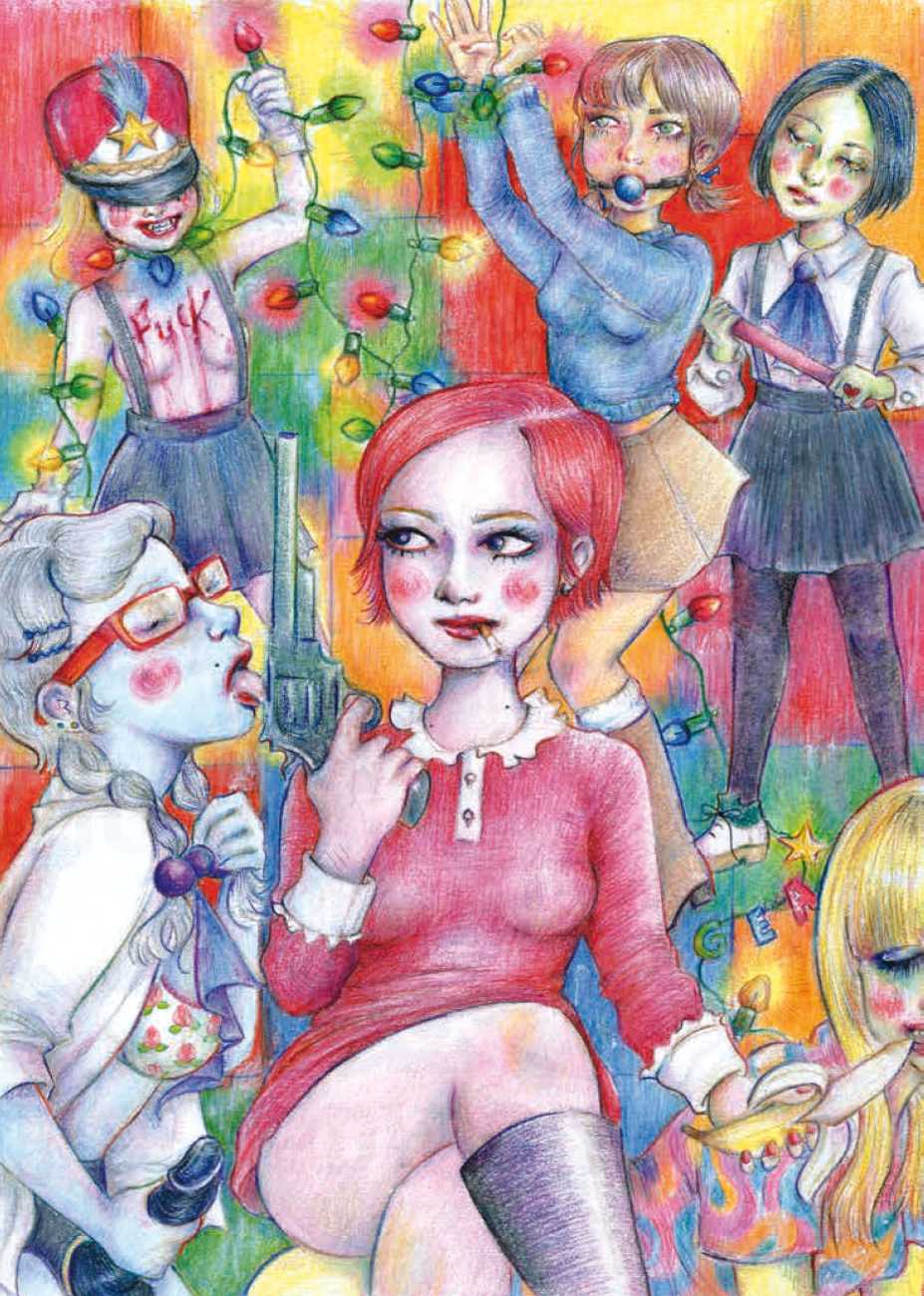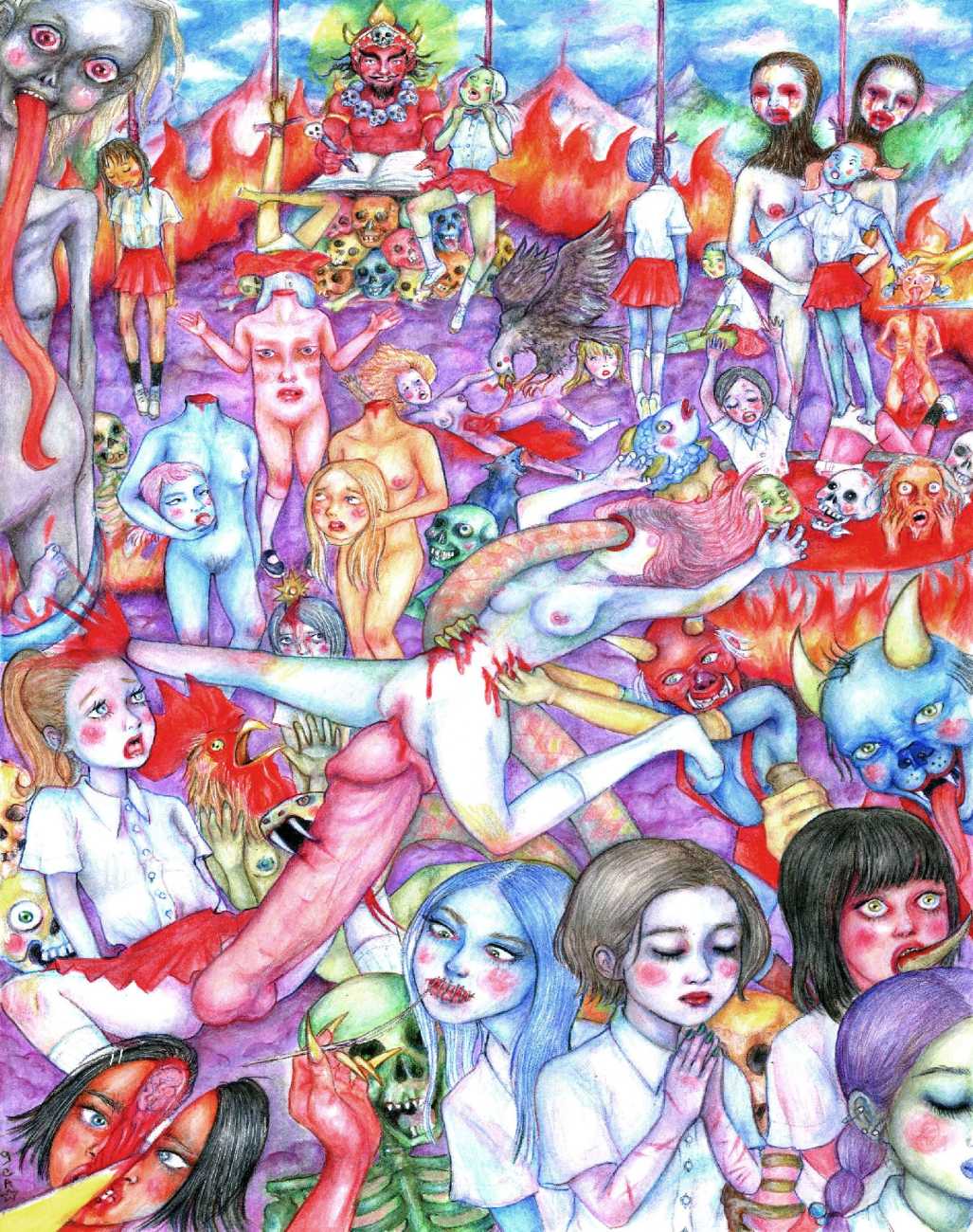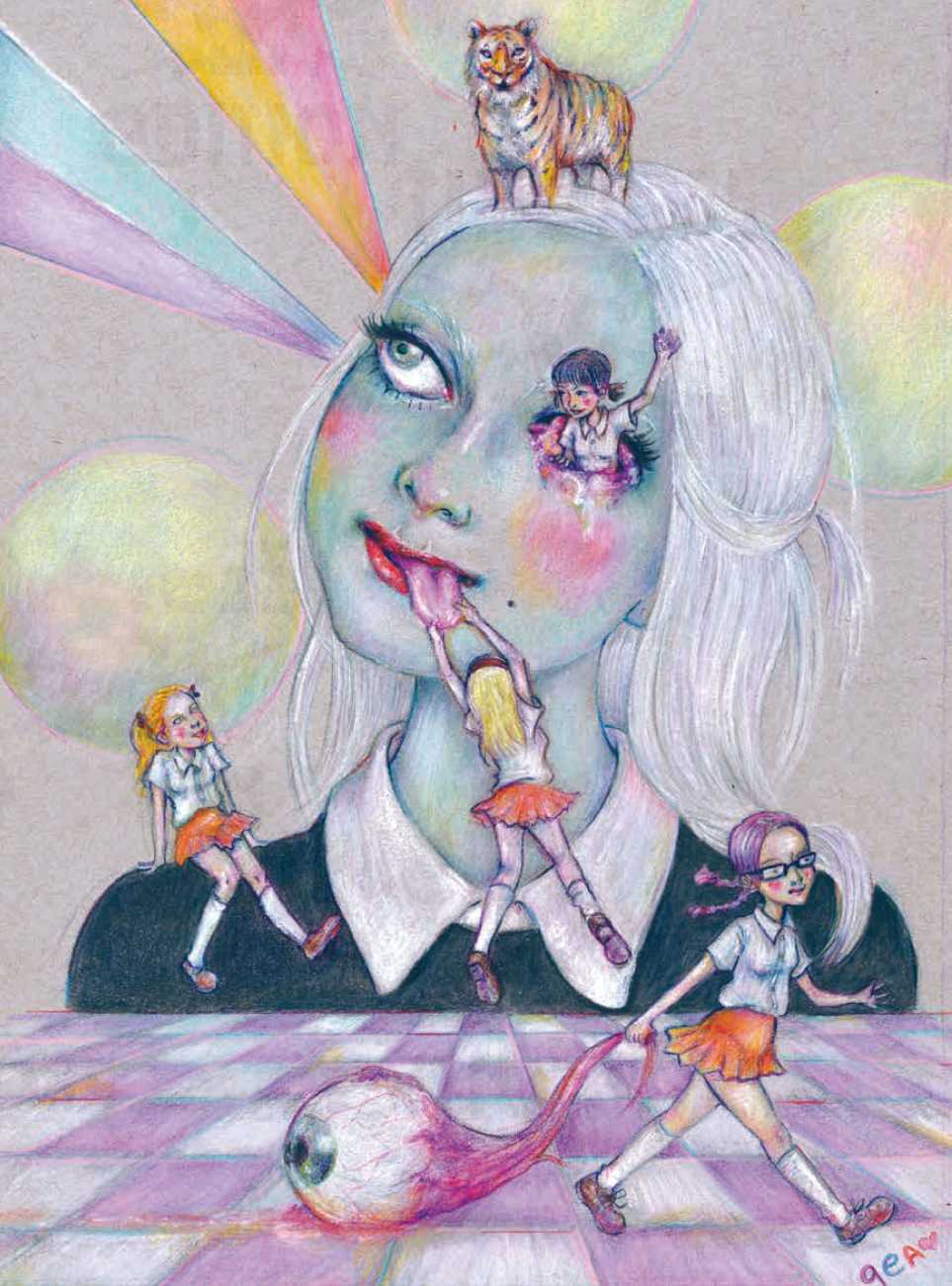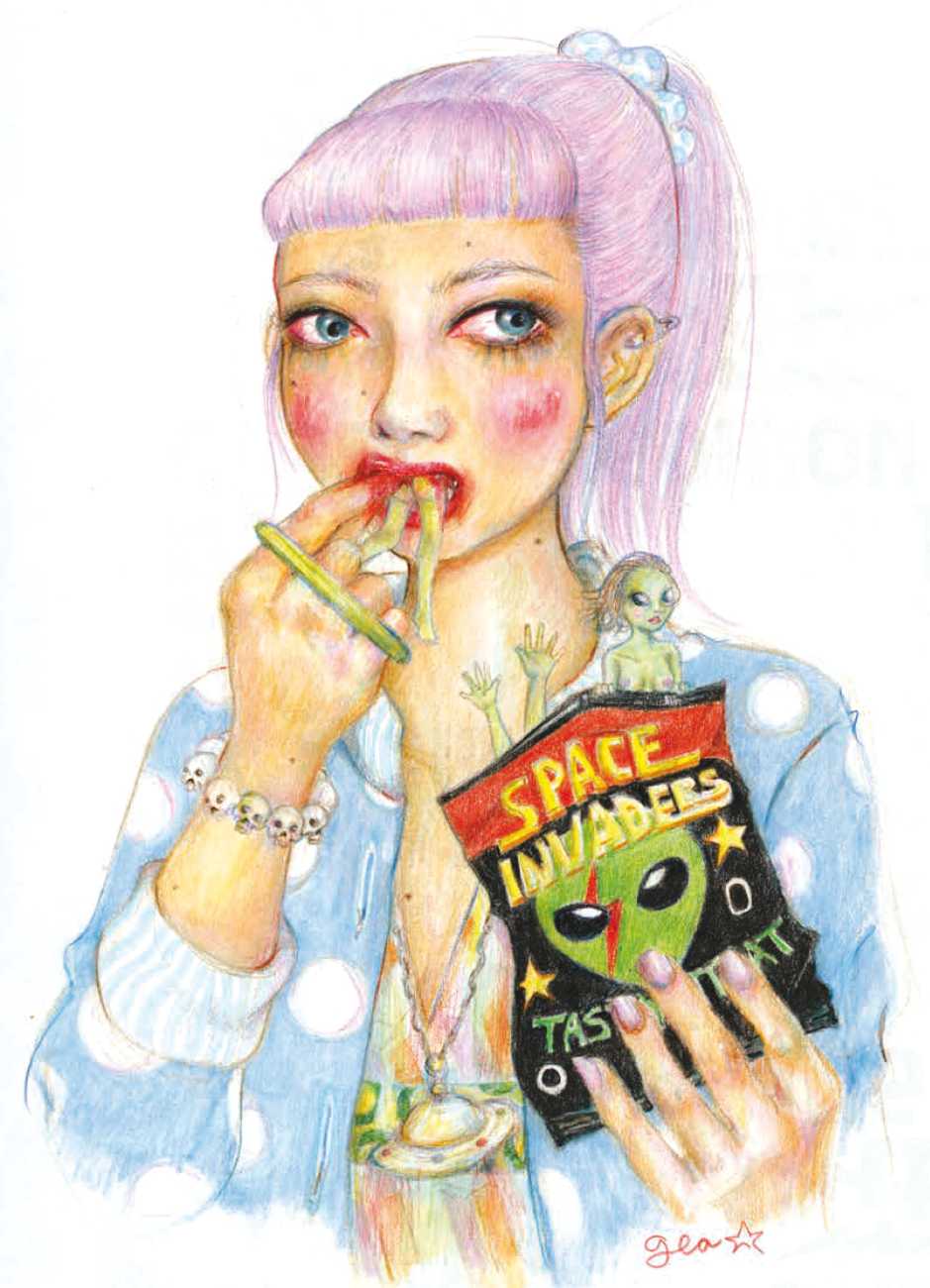 ‘gea* is at the spearhead of a movement of young female artists who have found empowerment in obscenity. Her focus is on disturbing and explicit subject matter that frequently juxtaposes sweetness and repulsion, often wrapped in dream-like surrealism that explores the nether regions of our collective psyche.’ ‘Does a gea* nymphette contribute to male gaze stereotyping, or is it all a sort of intellectual honey trap that addresses ideas of subjugation, albeit in a controversial manner? That’s for each observer to decide.’ These are just a couple of responses to the work of Chilean-raised New York-based artist gea*, aka g.e.a. (her initials) or Gea Philes, who creates colourful and vibrant works imbued with playfulness, sexuality, and menace – a hypersexual, vibrant surrealism combined with super-cute pop. Hers is a world filled with schoolgirls, along with the occasional monster or alien, joyfully engaging in acts of violence, carnality, frivolity and depravity.