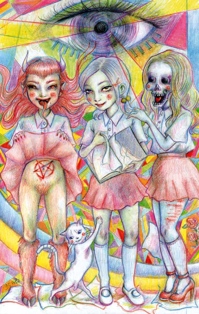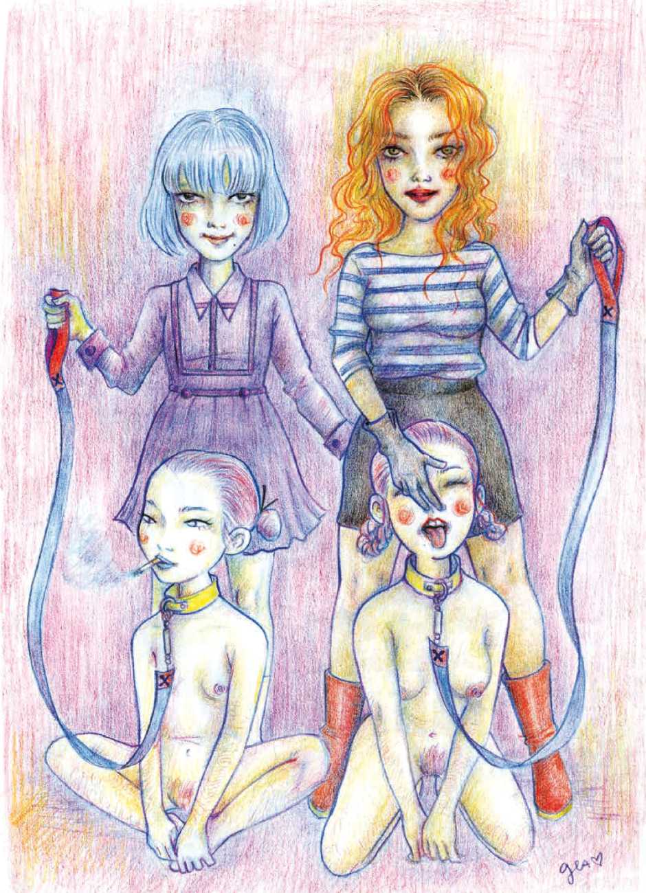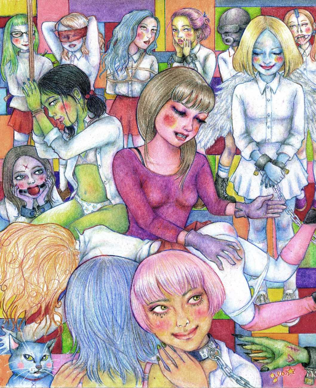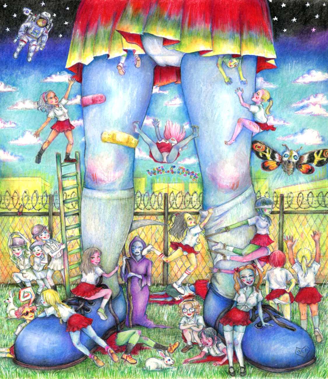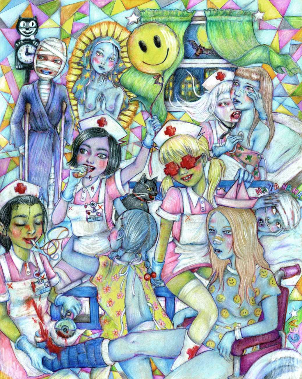 ‘gea* is at the spearhead of a movement of young female artists who have found empowerment in obscenity. Her focus is on disturbing and explicit subject matter that frequently juxtaposes sweetness and repulsion, often wrapped in dream-like surrealism that explores the nether regions of our collective psyche.’ ‘Does a gea* nymphette contribute to male gaze stereotyping, or is it all a sort of intellectual honey trap that addresses ideas of subjugation, albeit in a controversial manner? That’s for each observer to decide.’ These are just a couple of responses to the work of Chilean-raised New York-based artist gea*, aka g.e.a. (her initials) or Gea Philes, who creates colourful and vibrant works imbued with playfulness, sexuality, and menace – a hypersexual, vibrant surrealism combined with super-cute pop. Hers is a world filled with schoolgirls, along with the occasional monster or alien, joyfully engaging in acts of violence, carnality, frivolity and depravity.