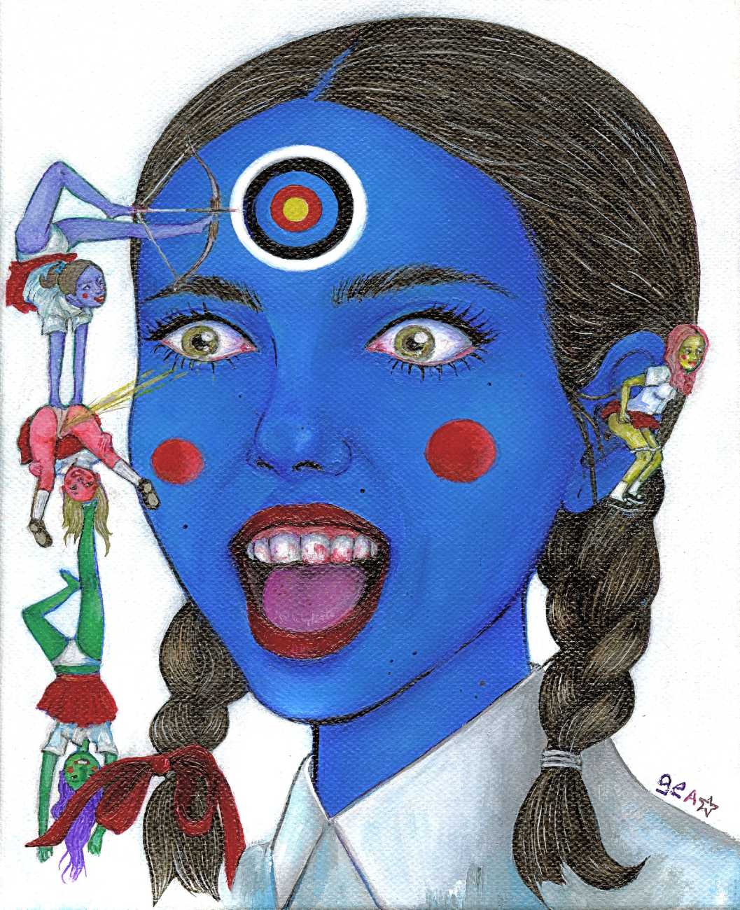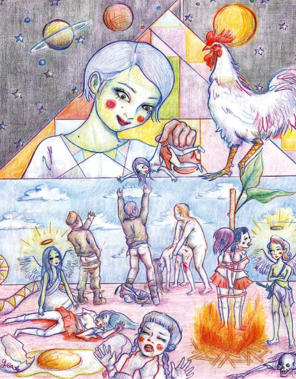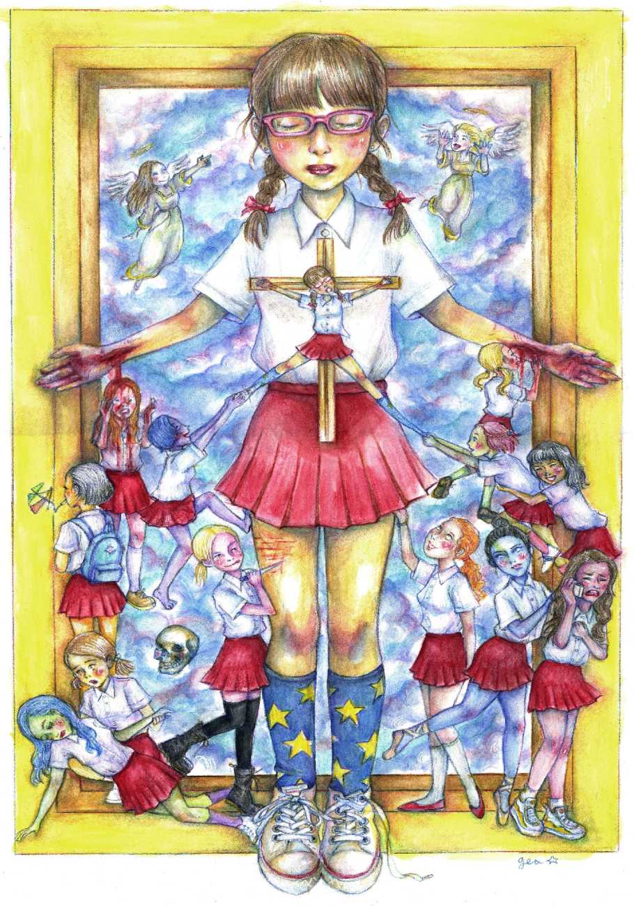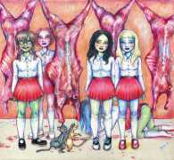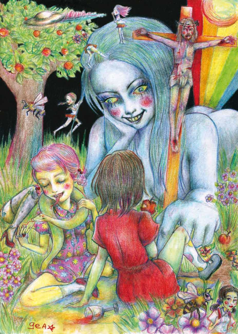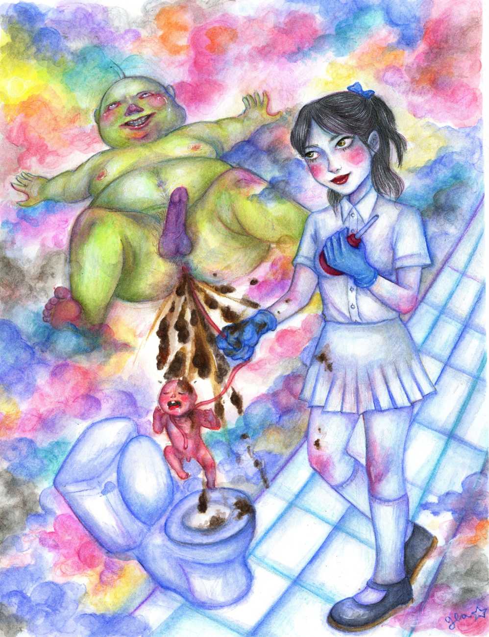 ‘gea* is at the spearhead of a movement of young female artists who have found empowerment in obscenity. Her focus is on disturbing and explicit subject matter that frequently juxtaposes sweetness and repulsion, often wrapped in dream-like surrealism that explores the nether regions of our collective psyche.’ ‘Does a gea* nymphette contribute to male gaze stereotyping, or is it all a sort of intellectual honey trap that addresses ideas of subjugation, albeit in a controversial manner? That’s for each observer to decide.’ These are just a couple of responses to the work of Chilean-raised New York-based artist gea*, aka g.e.a. (her initials) or Gea Philes, who creates colourful and vibrant works imbued with playfulness, sexuality, and menace – a hypersexual, vibrant surrealism combined with super-cute pop. Hers is a world filled with schoolgirls, along with the occasional monster or alien, joyfully engaging in acts of violence, carnality, frivolity and depravity.