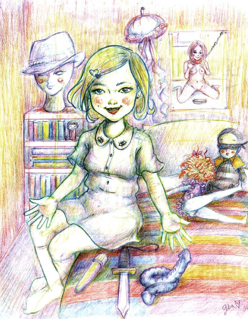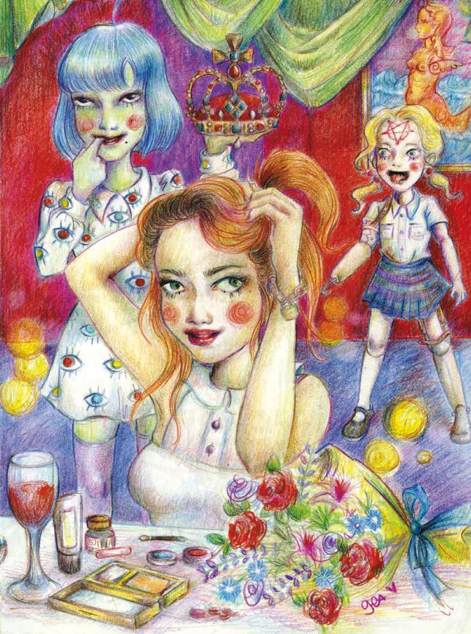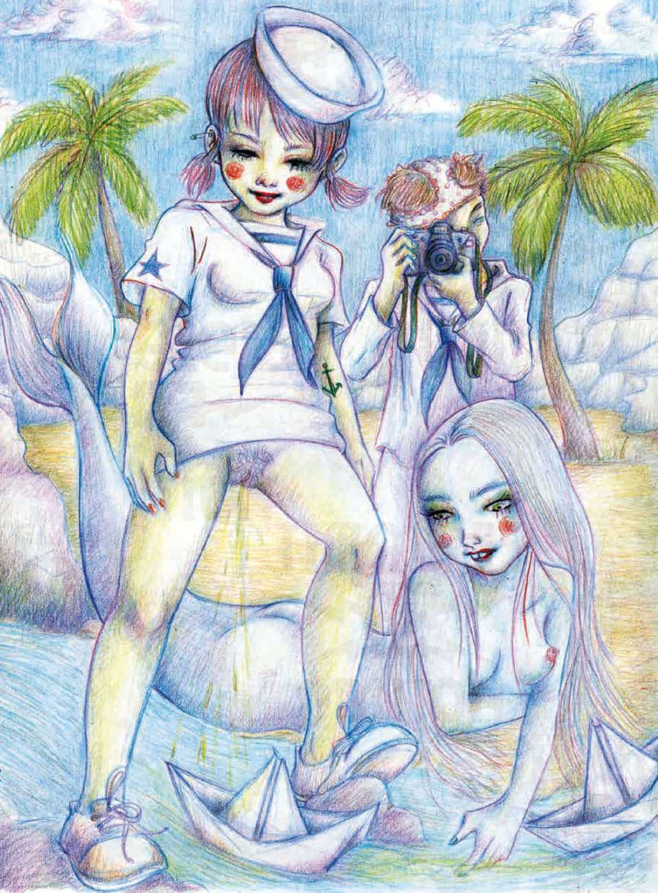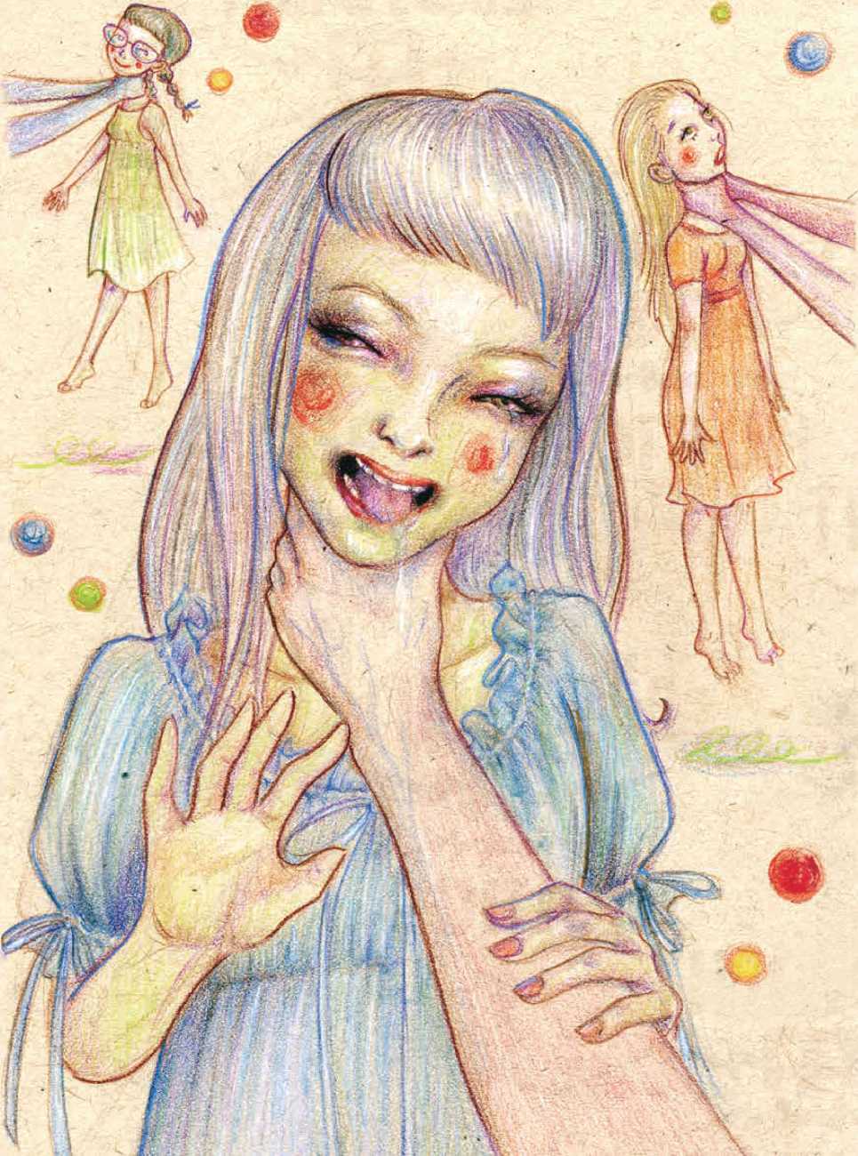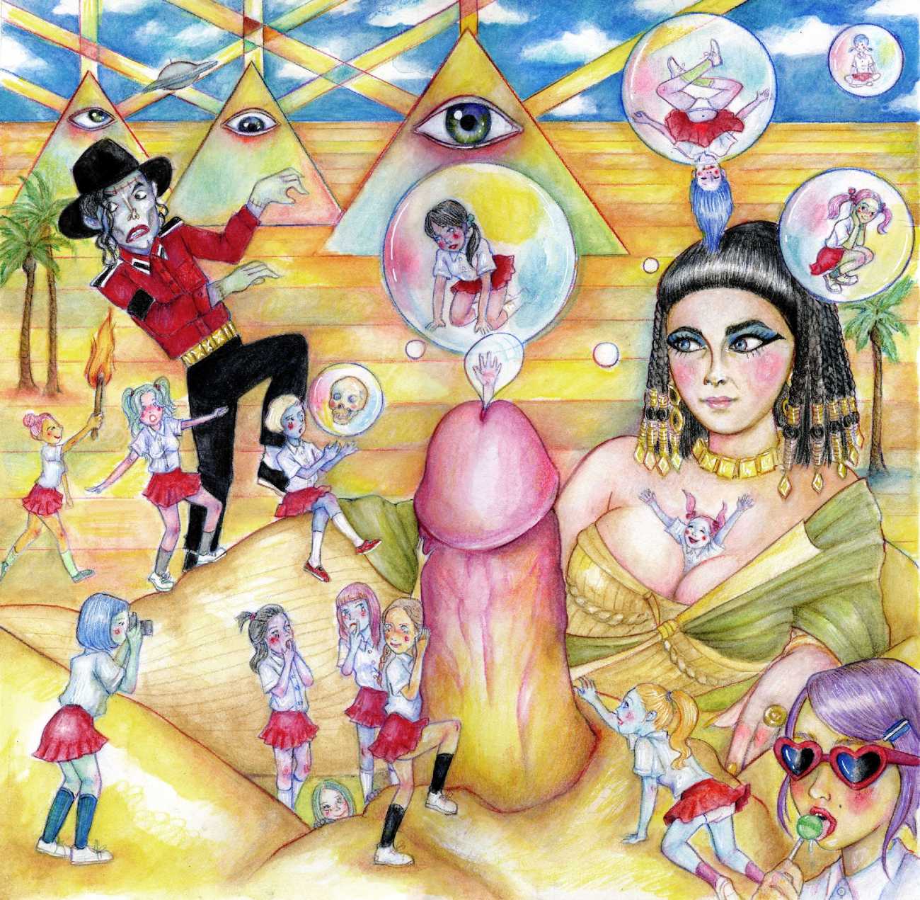 ‘gea* is at the spearhead of a movement of young female artists who have found empowerment in obscenity. Her focus is on disturbing and explicit subject matter that frequently juxtaposes sweetness and repulsion, often wrapped in dream-like surrealism that explores the nether regions of our collective psyche.’ ‘Does a gea* nymphette contribute to male gaze stereotyping, or is it all a sort of intellectual honey trap that addresses ideas of subjugation, albeit in a controversial manner? That’s for each observer to decide.’ These are just a couple of responses to the work of Chilean-raised New York-based artist gea*, aka g.e.a. (her initials) or Gea Philes, who creates colourful and vibrant works imbued with playfulness, sexuality, and menace – a hypersexual, vibrant surrealism combined with super-cute pop. Hers is a world filled with schoolgirls, along with the occasional monster or alien, joyfully engaging in acts of violence, carnality, frivolity and depravity.