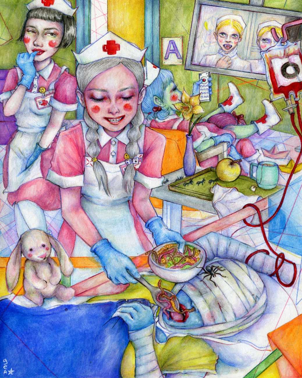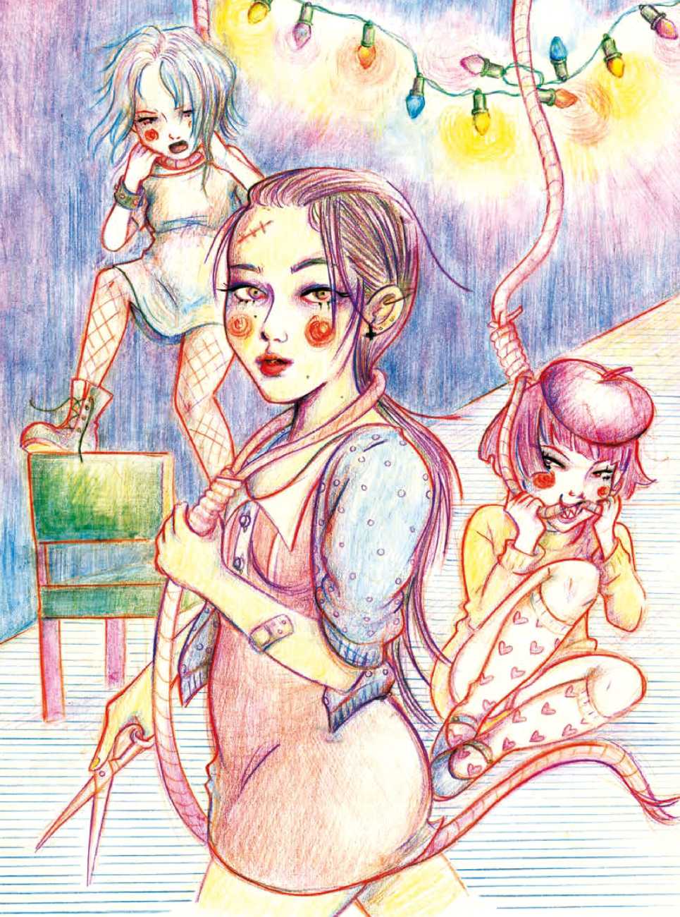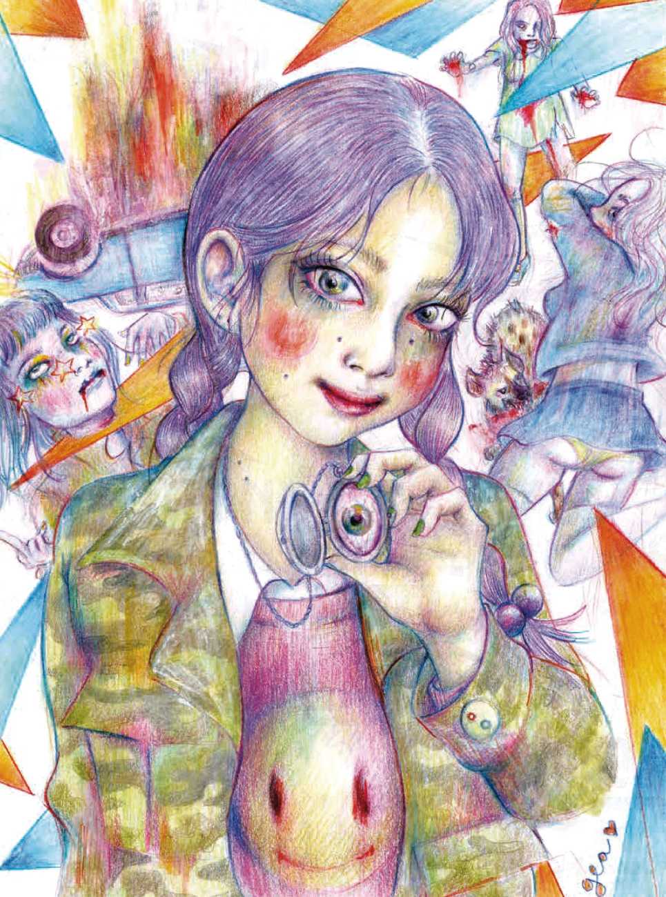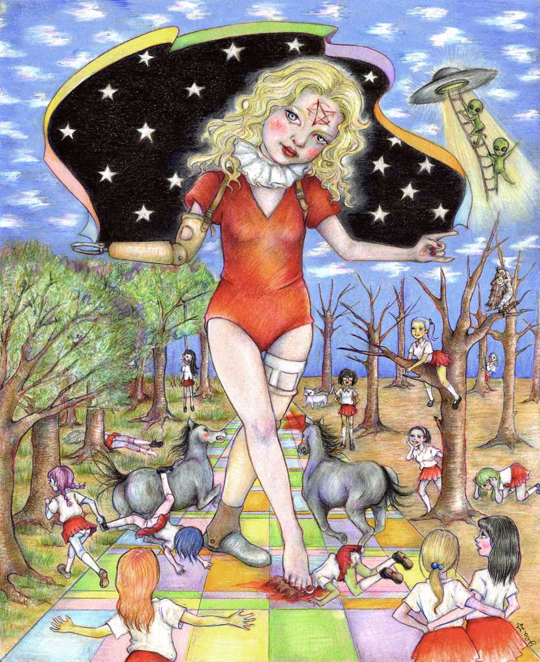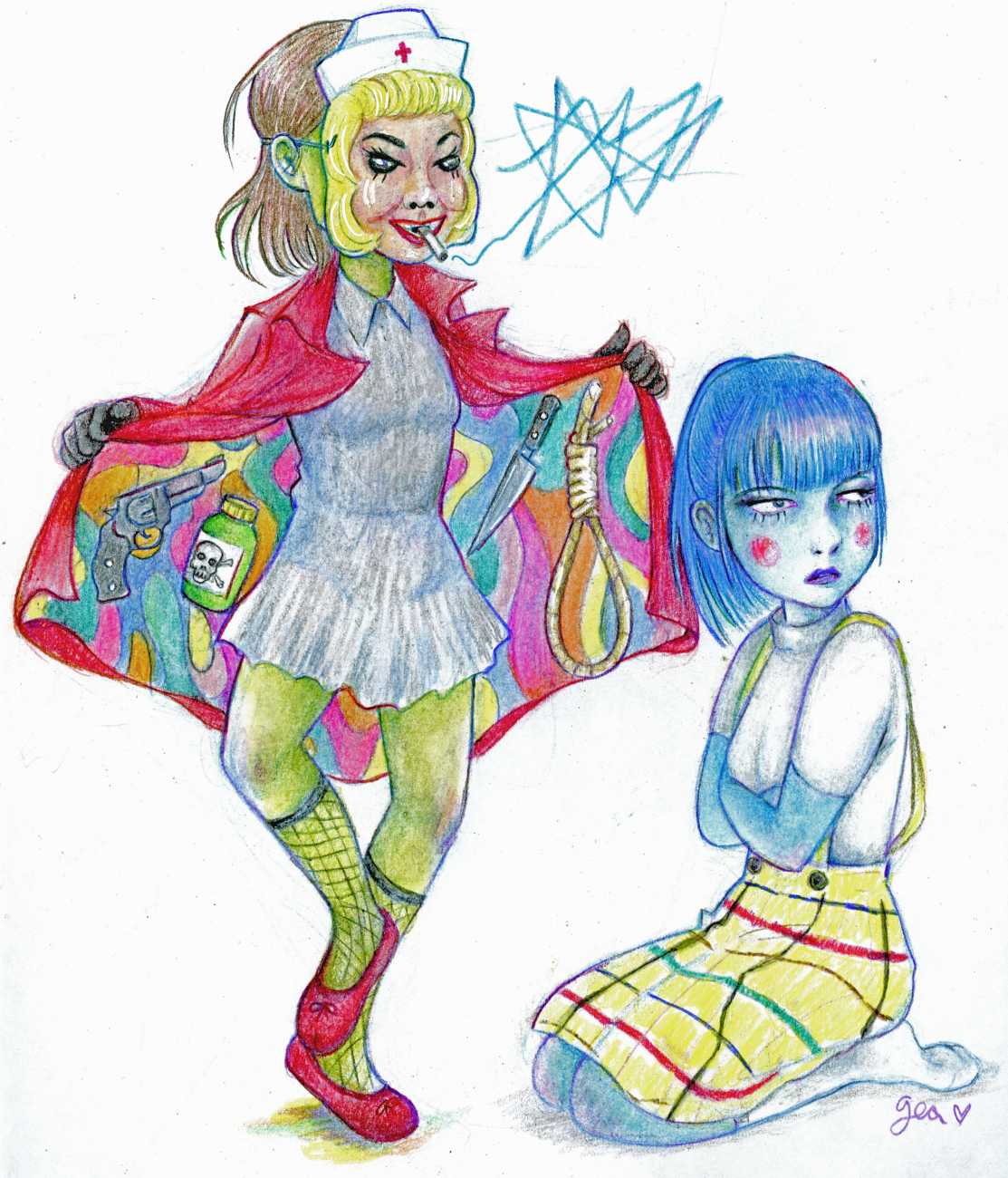 ‘gea* is at the spearhead of a movement of young female artists who have found empowerment in obscenity. Her focus is on disturbing and explicit subject matter that frequently juxtaposes sweetness and repulsion, often wrapped in dream-like surrealism that explores the nether regions of our collective psyche.’ ‘Does a gea* nymphette contribute to male gaze stereotyping, or is it all a sort of intellectual honey trap that addresses ideas of subjugation, albeit in a controversial manner? That’s for each observer to decide.’ These are just a couple of responses to the work of Chilean-raised New York-based artist gea*, aka g.e.a. (her initials) or Gea Philes, who creates colourful and vibrant works imbued with playfulness, sexuality, and menace – a hypersexual, vibrant surrealism combined with super-cute pop. Hers is a world filled with schoolgirls, along with the occasional monster or alien, joyfully engaging in acts of violence, carnality, frivolity and depravity.