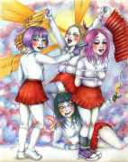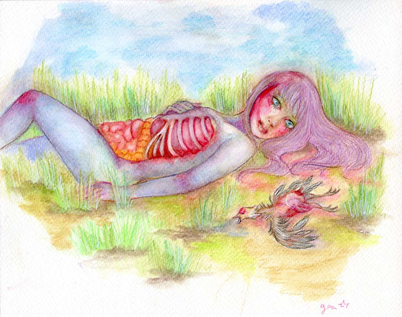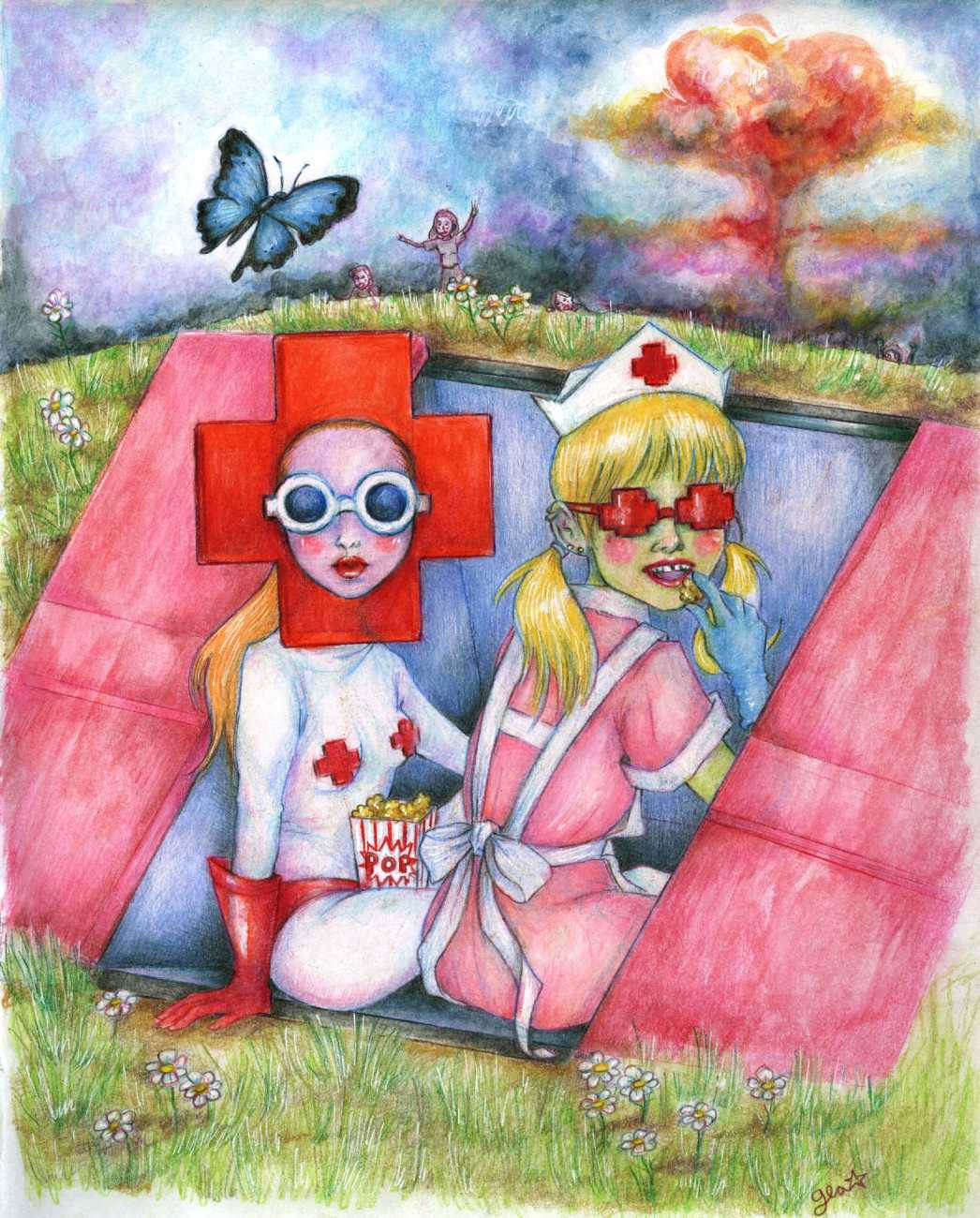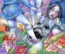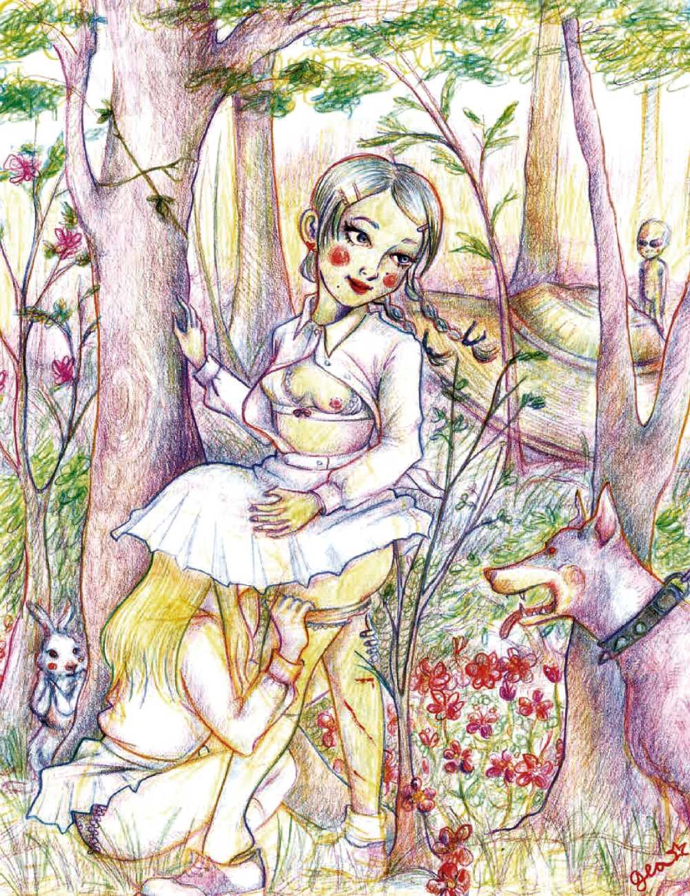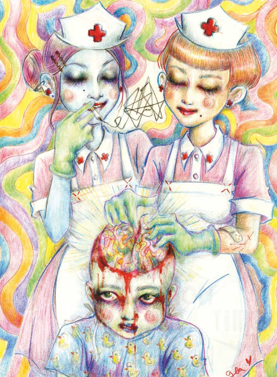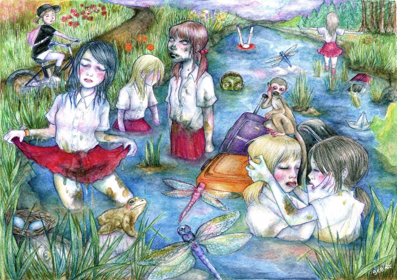 ‘gea* is at the spearhead of a movement of young female artists who have found empowerment in obscenity. Her focus is on disturbing and explicit subject matter that frequently juxtaposes sweetness and repulsion, often wrapped in dream-like surrealism that explores the nether regions of our collective psyche.’ ‘Does a gea* nymphette contribute to male gaze stereotyping, or is it all a sort of intellectual honey trap that addresses ideas of subjugation, albeit in a controversial manner? That’s for each observer to decide.’ These are just a couple of responses to the work of Chilean-raised New York-based artist gea*, aka g.e.a. (her initials) or Gea Philes, who creates colourful and vibrant works imbued with playfulness, sexuality, and menace – a hypersexual, vibrant surrealism combined with super-cute pop. Hers is a world filled with schoolgirls, along with the occasional monster or alien, joyfully engaging in acts of violence, carnality, frivolity and depravity.