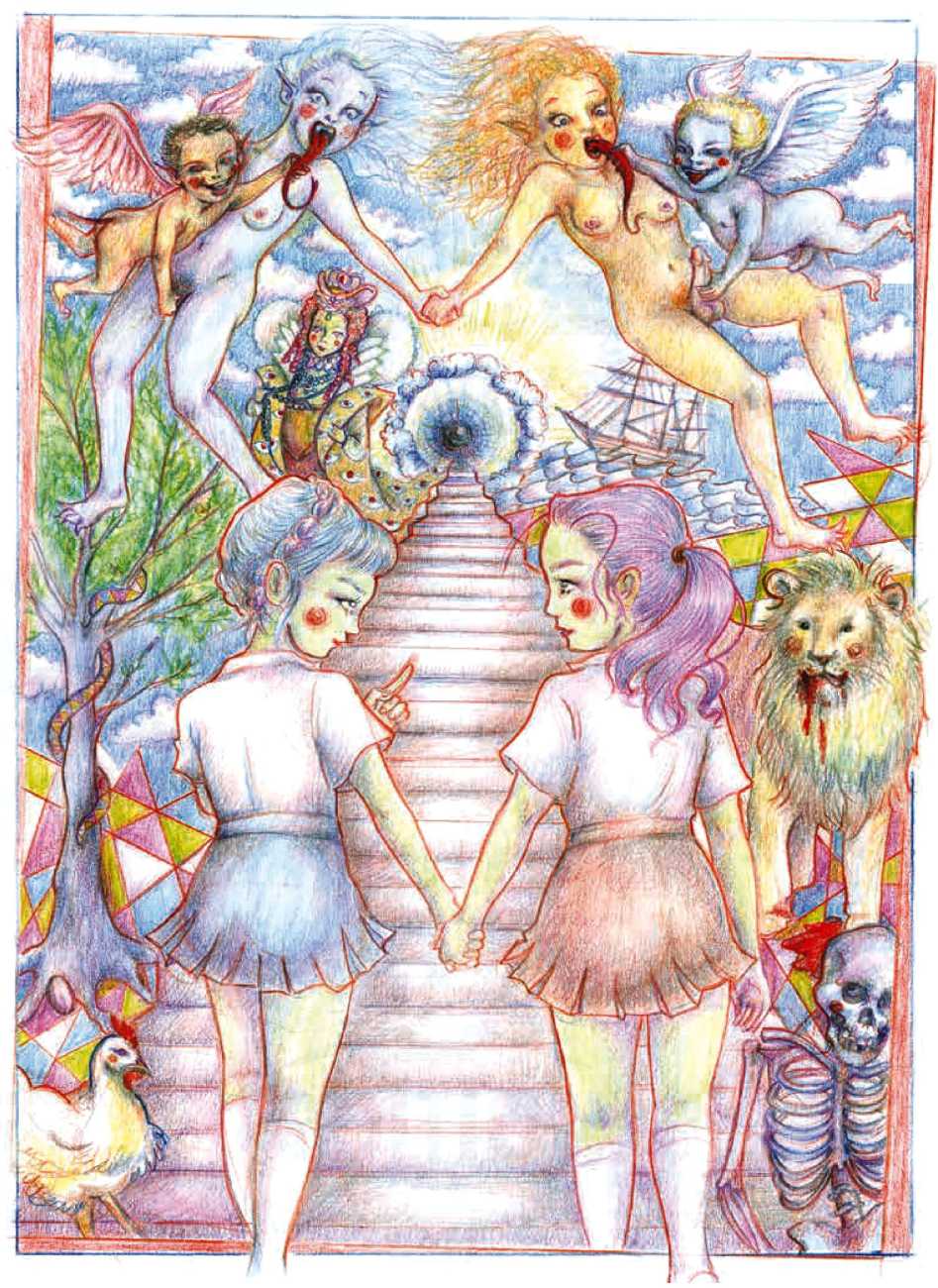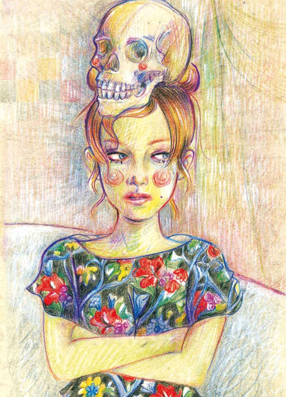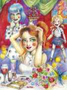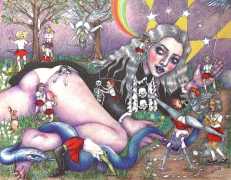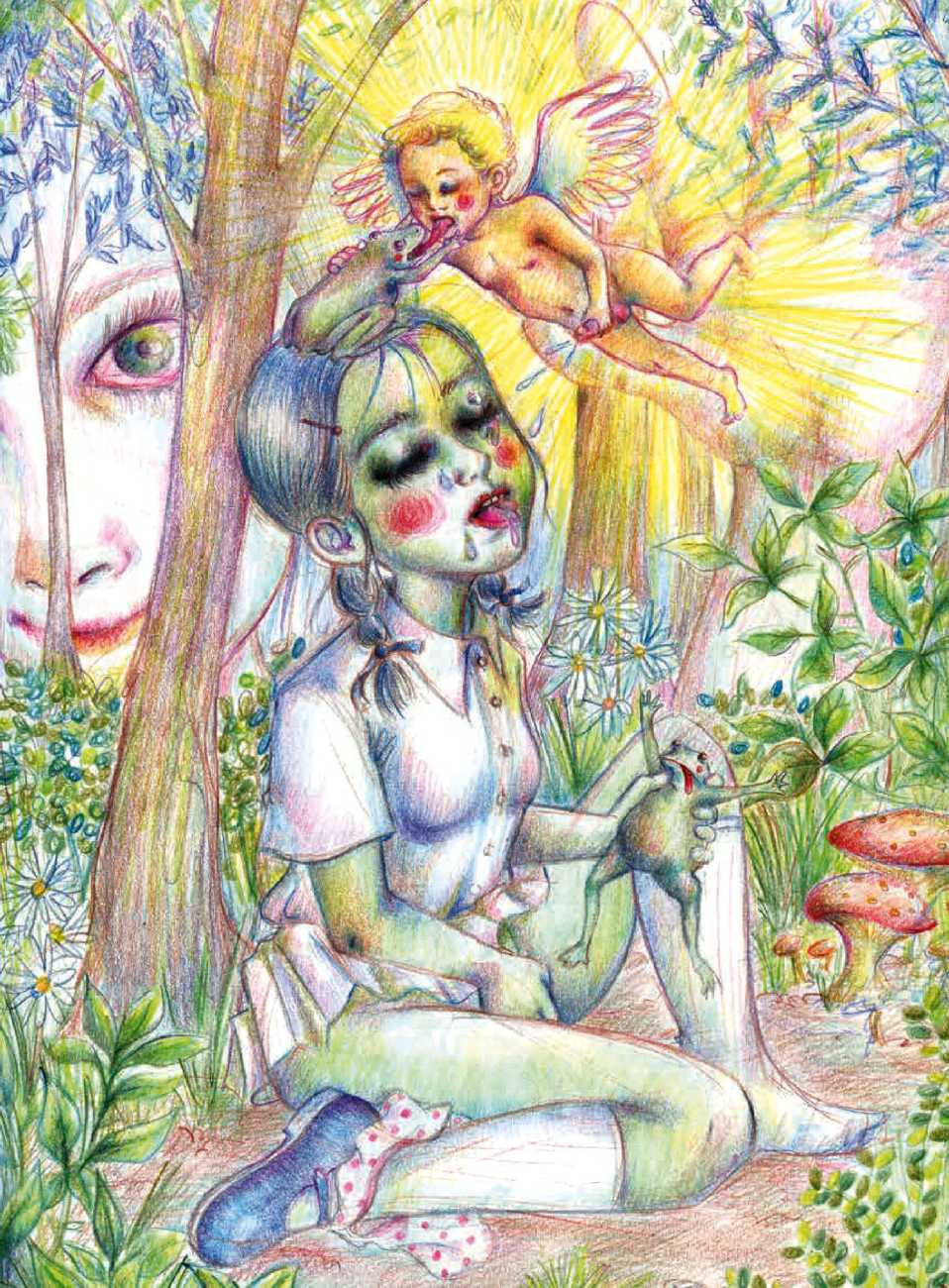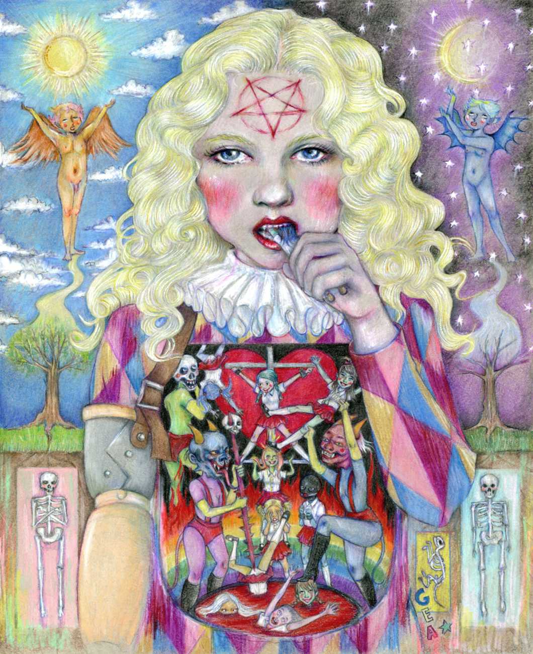 From an early age she identified as something of a rebel, leaving home in her late teens to live with a drag queen in ‘an unglamorous New York life that gets mistaken as poetic whenever mentioned’. At 25 she met the performance artist Shaun Partridge, co-founder of the infamous Partridge Family Temple, a pseudo-religion devoted to the worship of the members of The Partridge Family television show. She was having to work in jobs that were rather tedious, but always had her sketchbook with her, trying out styles and themes while she found her own artistic path, ‘but some people seemed to dig it and I appreciated the encouragement.’