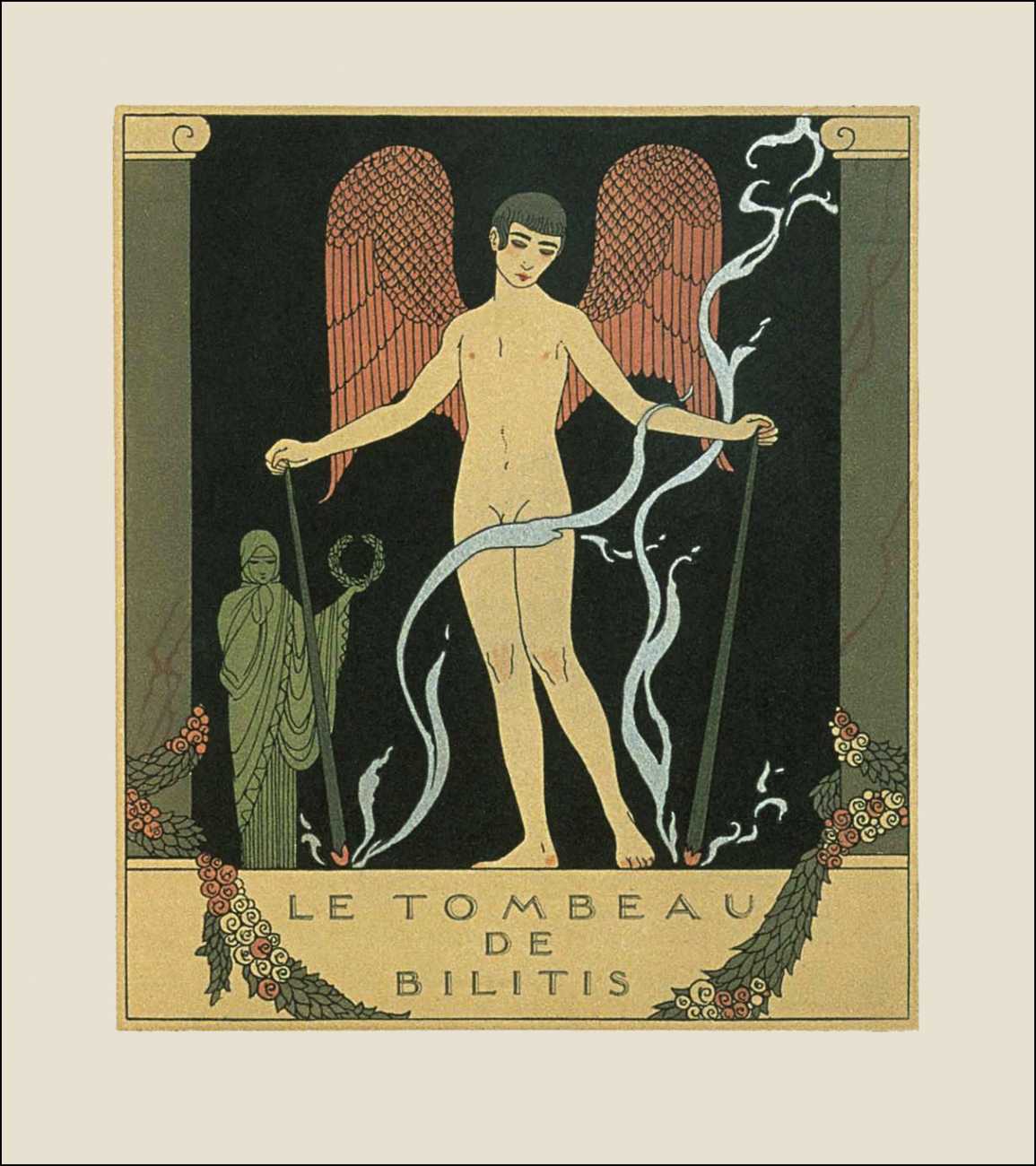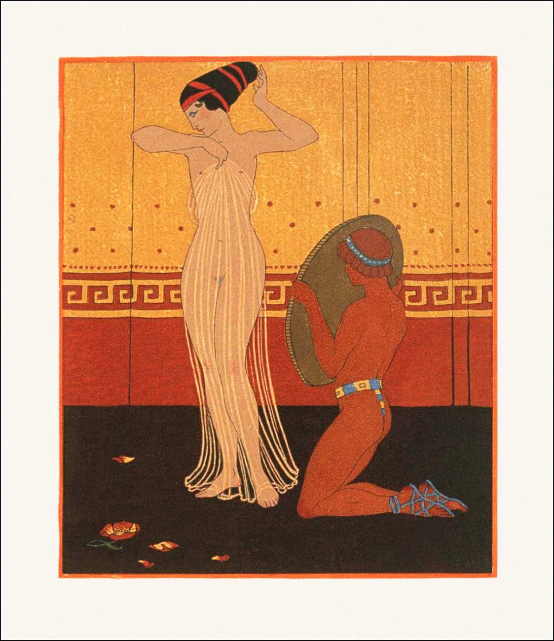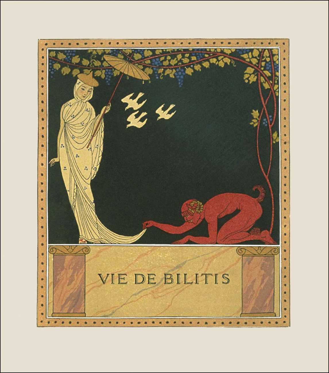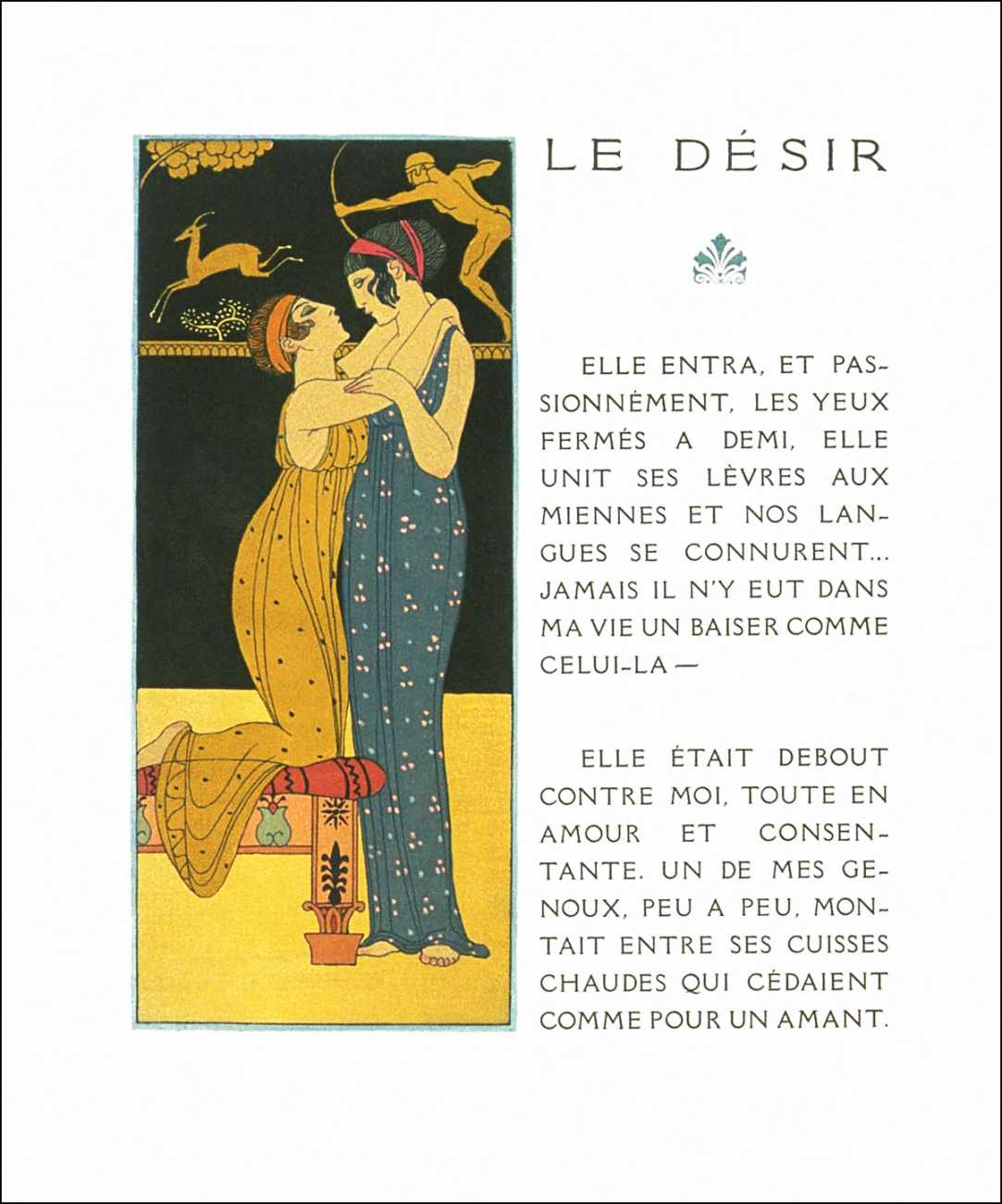 Very little is known about Barbier’s personal life as only scanty documentation survives, but he was lifelong friends with similarly-minded friends including Pierre Louÿs and Jean Giraudoux. It is clear that he loved illustrating beautiful women, both in the latest fashions and wearing very little, and it is hard to believe that his interest was purely artistic. His illustrations for Louÿs’ Bilitis and Aphrodite are particularly sensual.