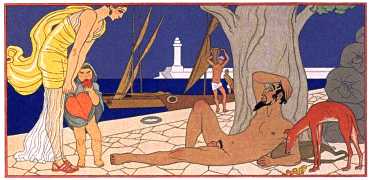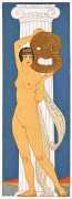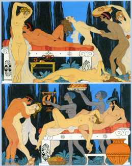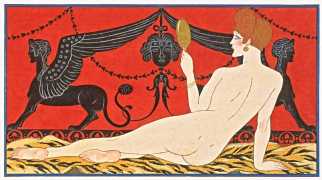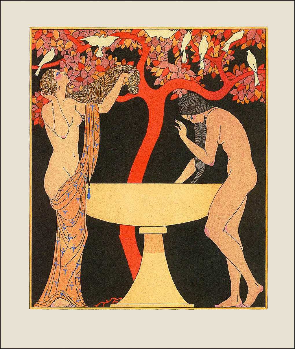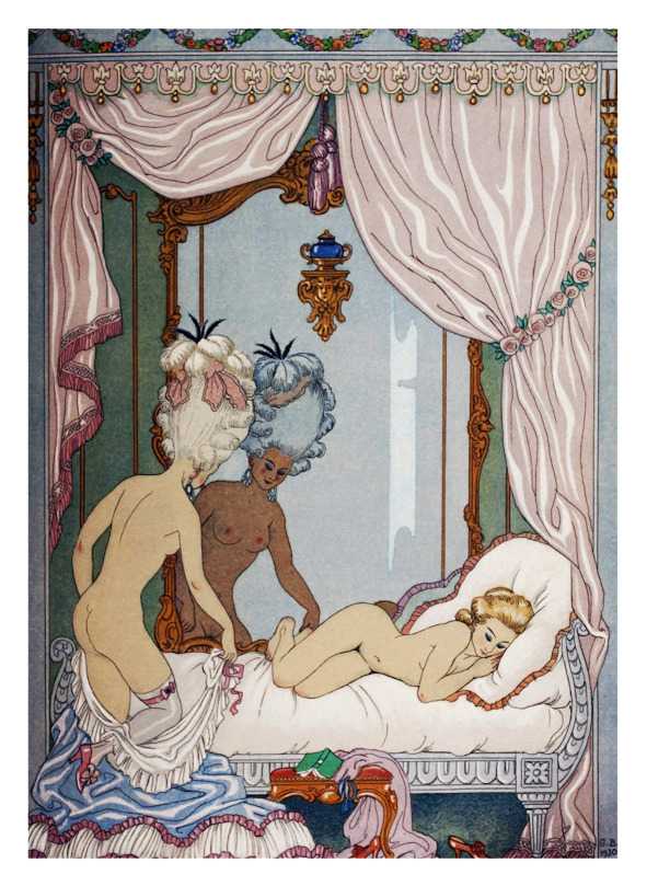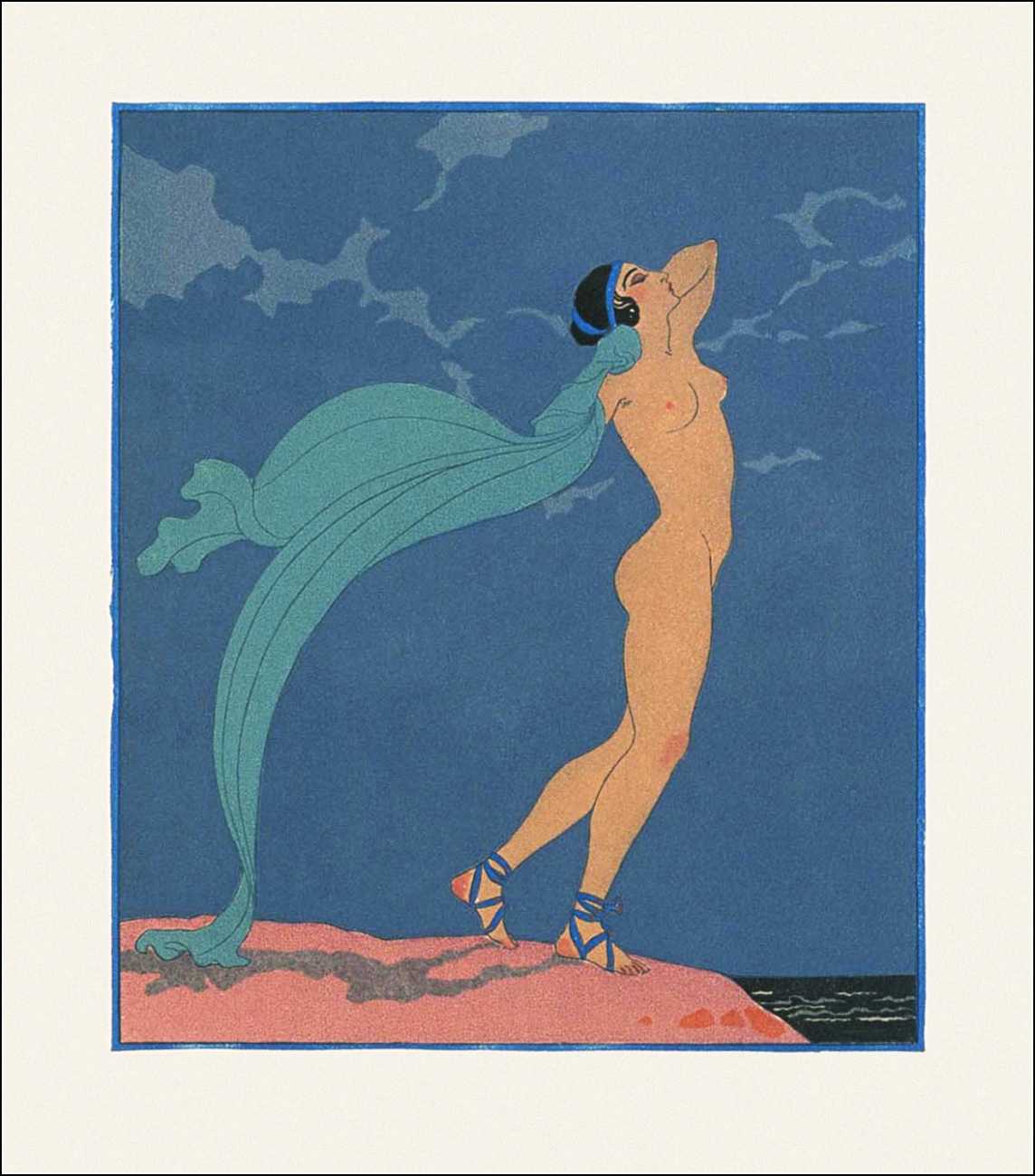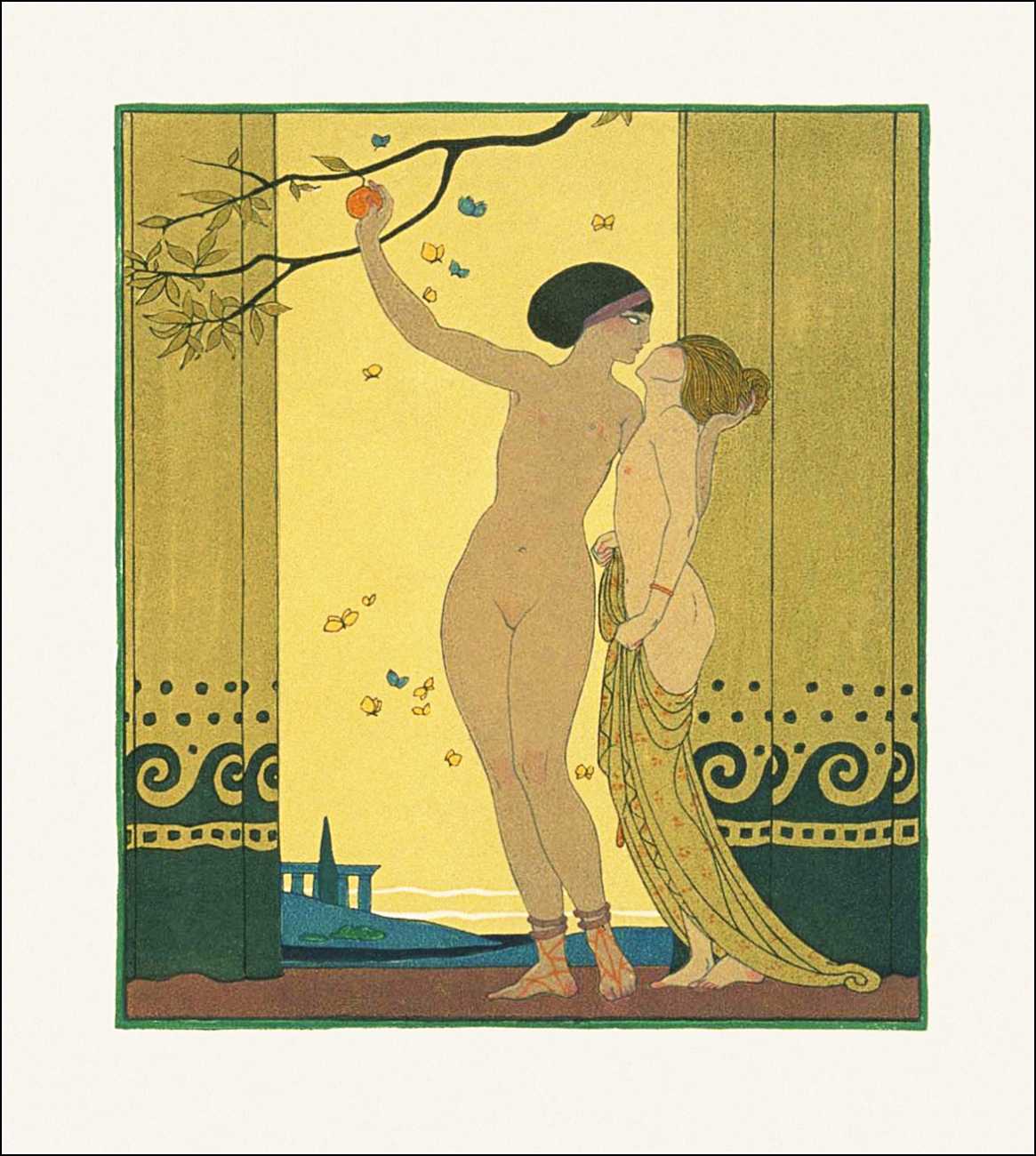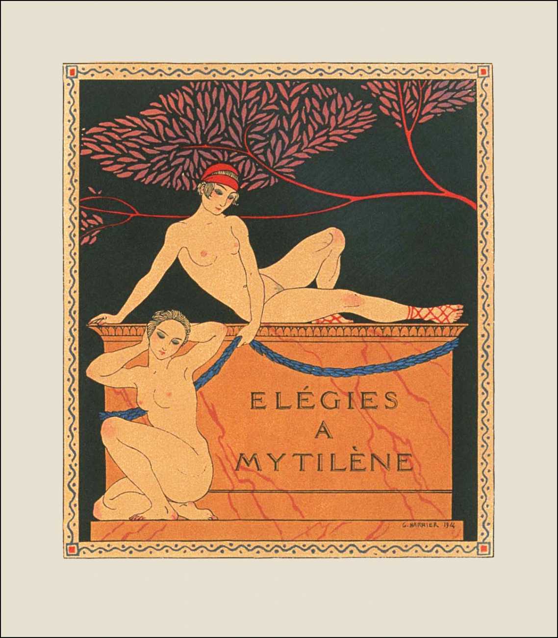 Very little is known about Barbier’s personal life as only scanty documentation survives, but he was lifelong friends with similarly-minded friends including Pierre Louÿs and Jean Giraudoux. It is clear that he loved illustrating beautiful women, both in the latest fashions and wearing very little, and it is hard to believe that his interest was purely artistic. His illustrations for Louÿs’ Bilitis and Aphrodite are particularly sensual.