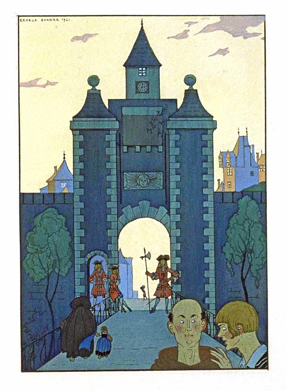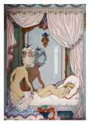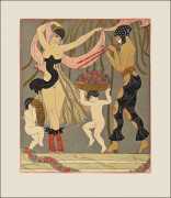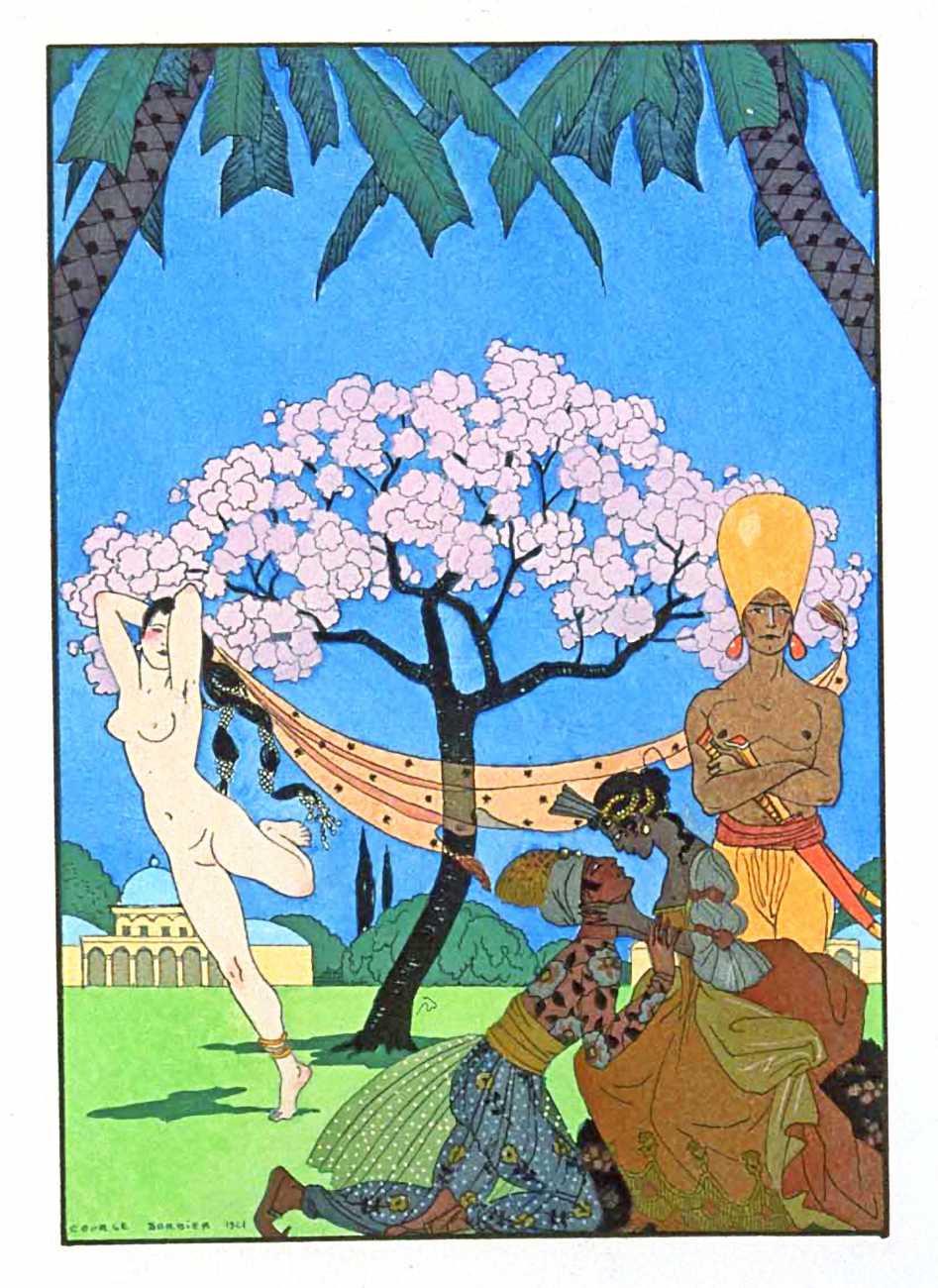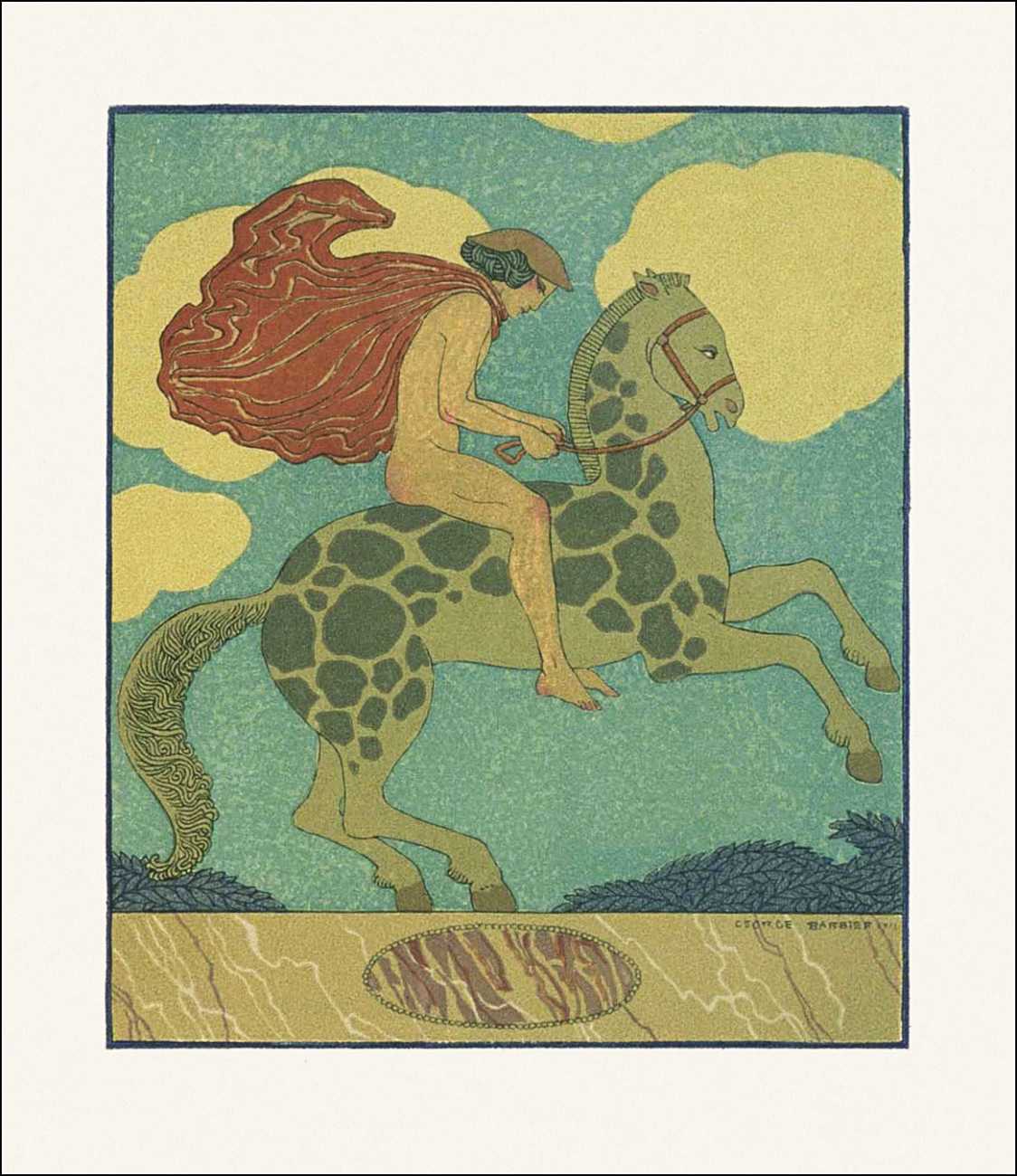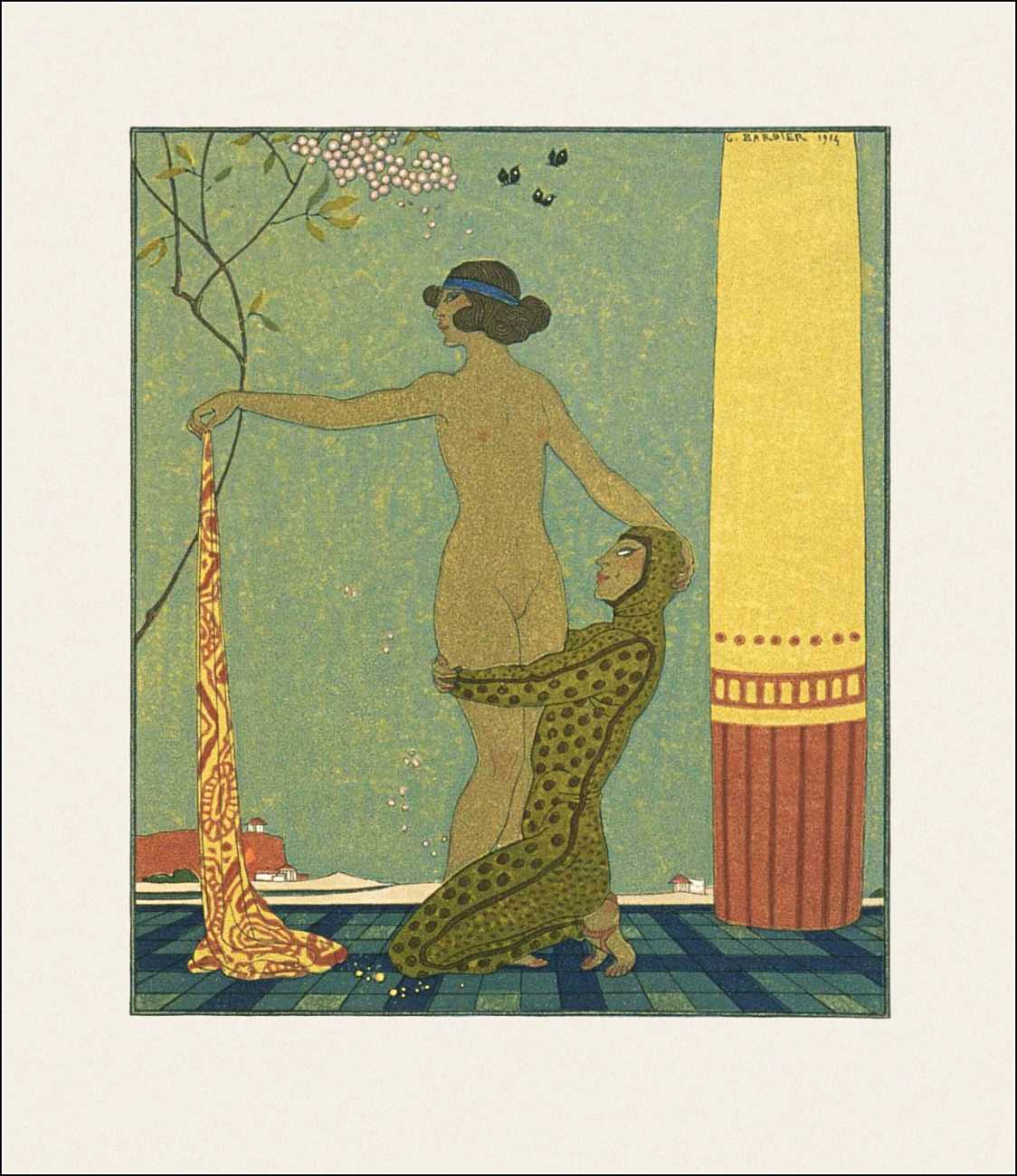 He was part of a group of talented French artists nicknamed by Vogue magazine ‘Les chevaliers du bracelet’ (Knights of the Bracelet) for their dandyish attire, flamboyant mannerisms, and their common practice of sporting a bracelet. Barbier was described by Vogue as ‘un élégant jeune homme blond, tranquille et réservé’. He was one of many artists of the period who made much of their living from illustrating limited ‘editions de luxe’ books, with high standards of printing and a small monied clientele. Classics and contemporary works illustrated by the leading artists of the day, often lavishly bound, were eagerly collected. Societies of bibliophiles were founded in many cities and towns, ensuring that subscribers could be sure of obtaining the latest publications, numerous enough to warrant a lengthy column in the magazine L’Amour de l’Art each month devoted entirely to the subject.