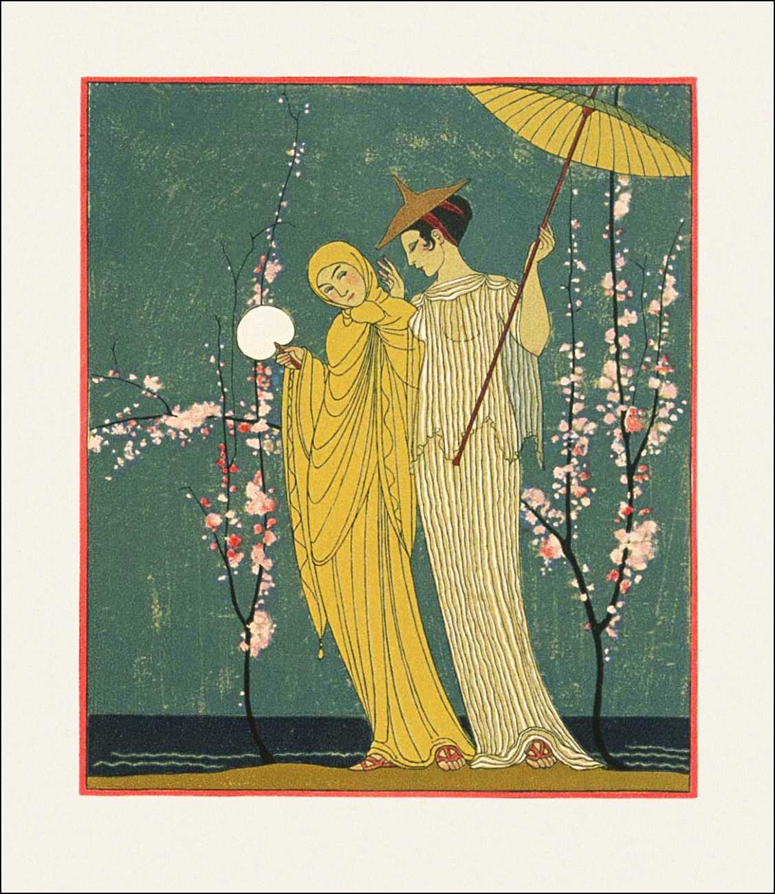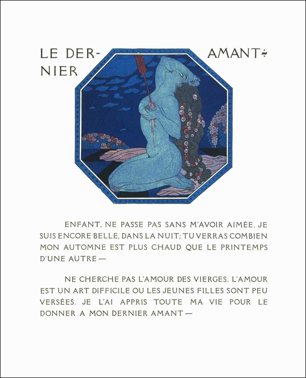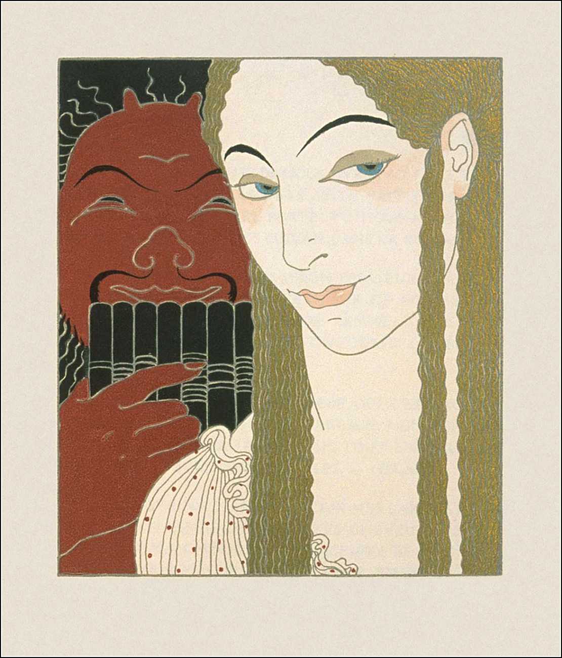 He was part of a group of talented French artists nicknamed by Vogue magazine ‘Les chevaliers du bracelet’ (Knights of the Bracelet) for their dandyish attire, flamboyant mannerisms, and their common practice of sporting a bracelet. Barbier was described by Vogue as ‘un élégant jeune homme blond, tranquille et réservé’. He was one of many artists of the period who made much of their living from illustrating limited ‘editions de luxe’ books, with high standards of printing and a small monied clientele. Classics and contemporary works illustrated by the leading artists of the day, often lavishly bound, were eagerly collected. Societies of bibliophiles were founded in many cities and towns, ensuring that subscribers could be sure of obtaining the latest publications, numerous enough to warrant a lengthy column in the magazine L’Amour de l’Art each month devoted entirely to the subject.